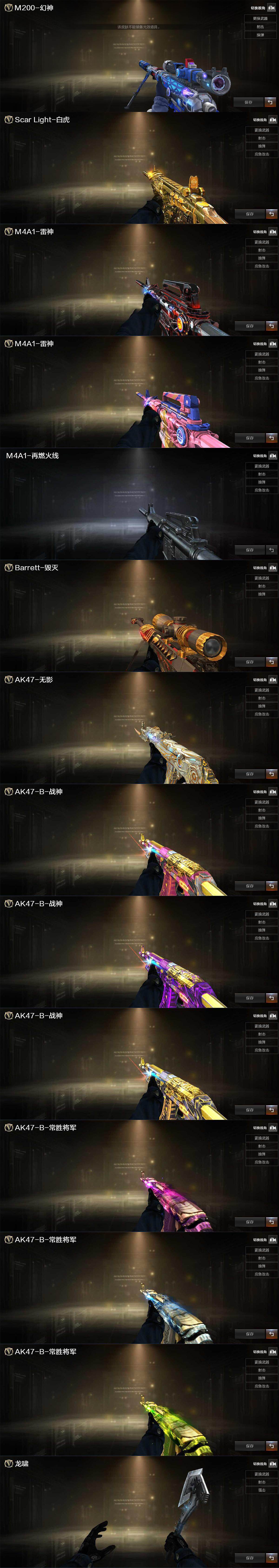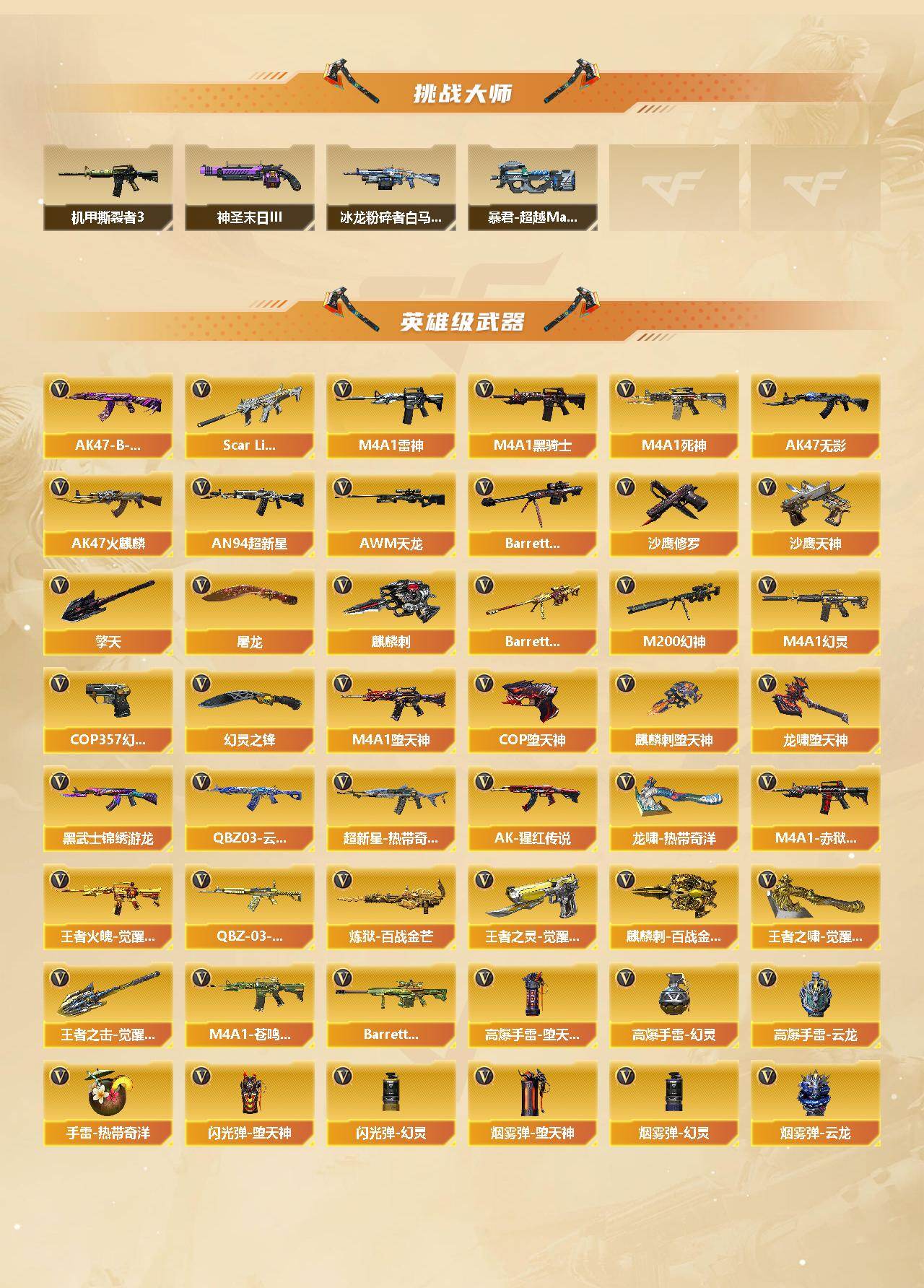 【英雄级武器】:AK47-火麒麟,M4A1-雷神,M4A1-黑骑士,AK47-无影,M4A1-死神,AN94-超新星,M4A1-堕天神,Scar Light-白虎,M4A1-幻灵,QBZ03-云龙,黑武士-锦绣游龙,超新星-热带奇洋,AK-47-猩红传说*2,王者火魄-觉醒版,AK47-B-常胜将军,QBZ-03-王者蔷薇-觉醒版,AWM-天龙,Barrett-毁灭,M200-幻神,Barrett-朱雀,炼狱-百战金芒,沙鹰-修罗,沙鹰-天神,COP-堕天神,COP 357-幻灵*2,王者之灵-觉醒版,屠龙,麒麟刺-堕天神*3,擎天,麒麟刺,幻灵之锋