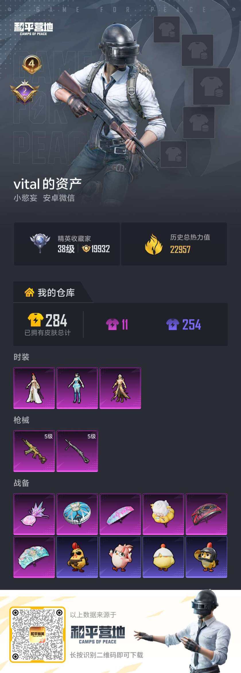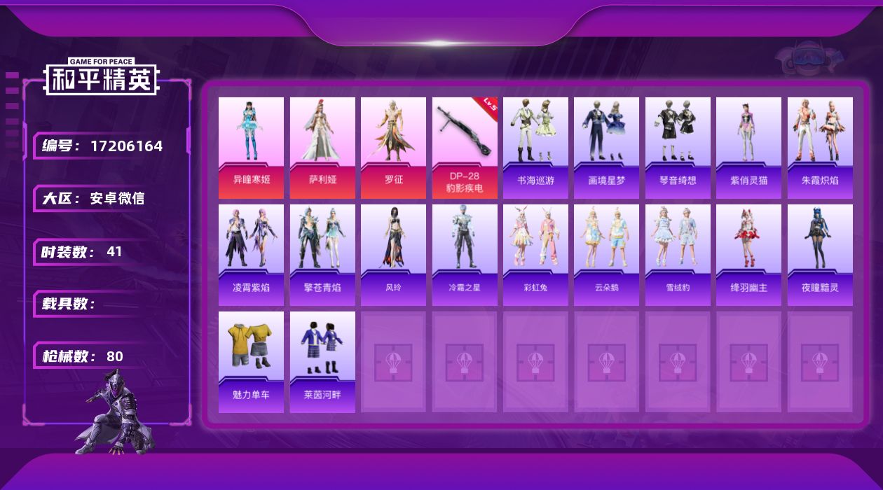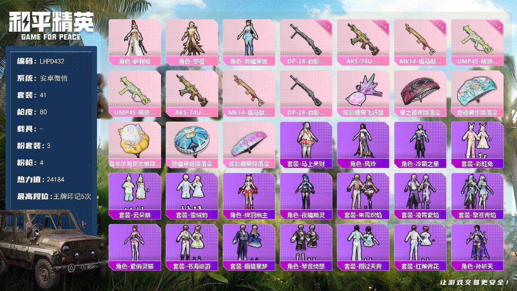 [17206164]【特价出售/店主推荐】安卓 微信-3粉装-4特效枪-0载具-1粉色飞行器-24184热力值-5王牌印记-41套装-80枪皮【粉色套装】:角色-萨利娅,角色-罗征,角色-异瞳寒姬【粉色枪皮等级】:UMP45-萌骑冒险(二级),AKS-74U-森灵之息(五级),Mk14-福马献瑞(三级),DP-28-豹影疾电(五级)【粉色枪皮】:UMP45-萌骑冒险,AKS-74U-森灵之息,Mk14-福马献瑞,DP-28-豹影疾电【粉色飞行器】:炫彩糖果飞行器