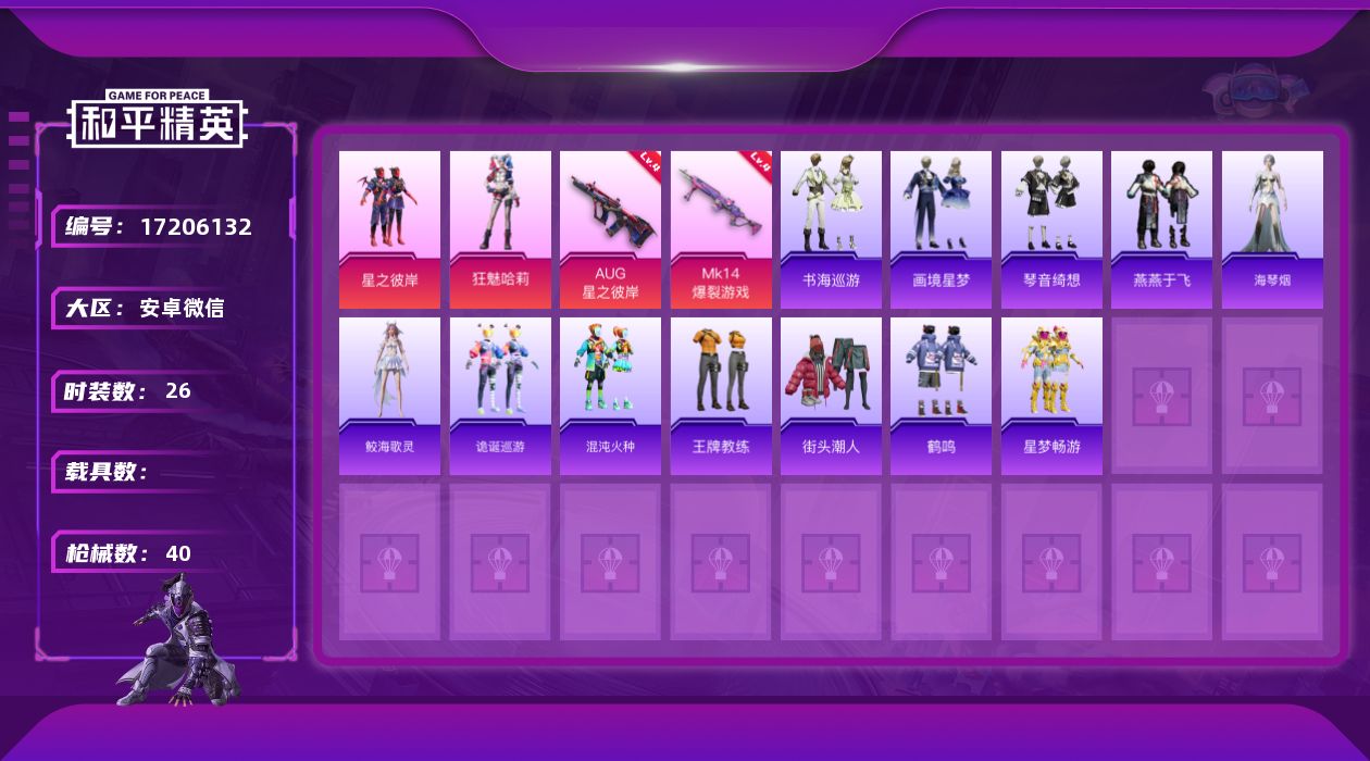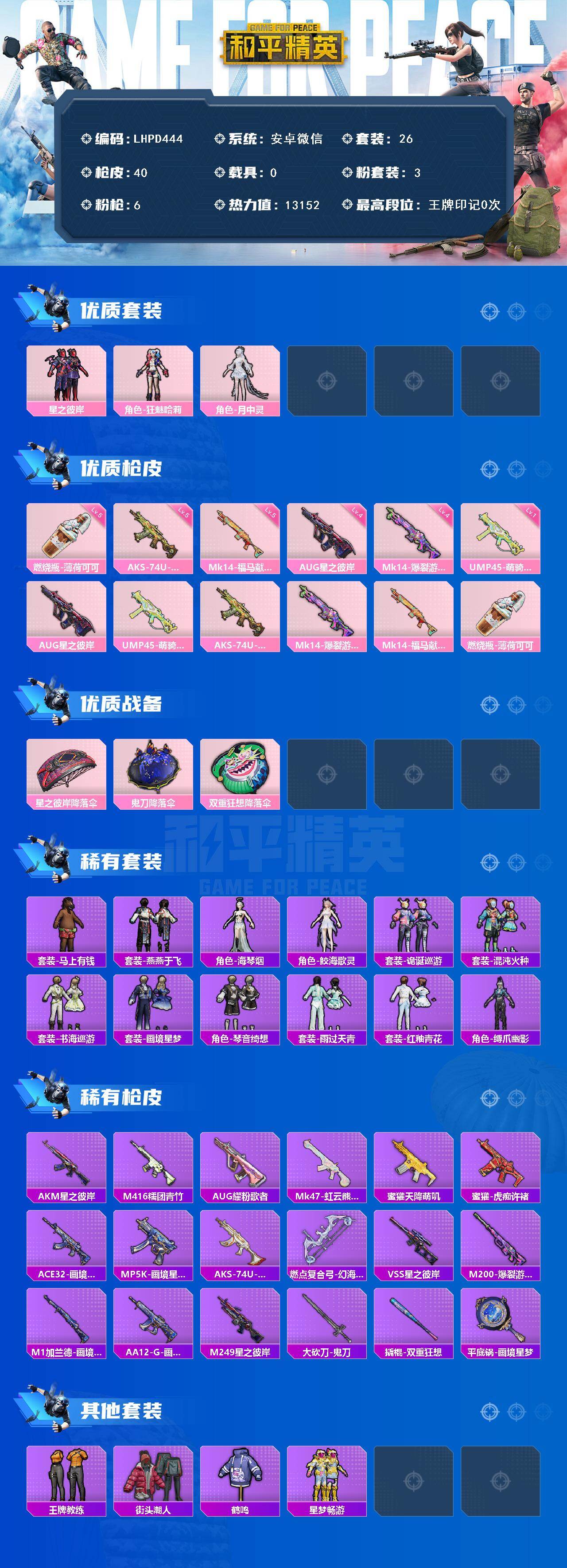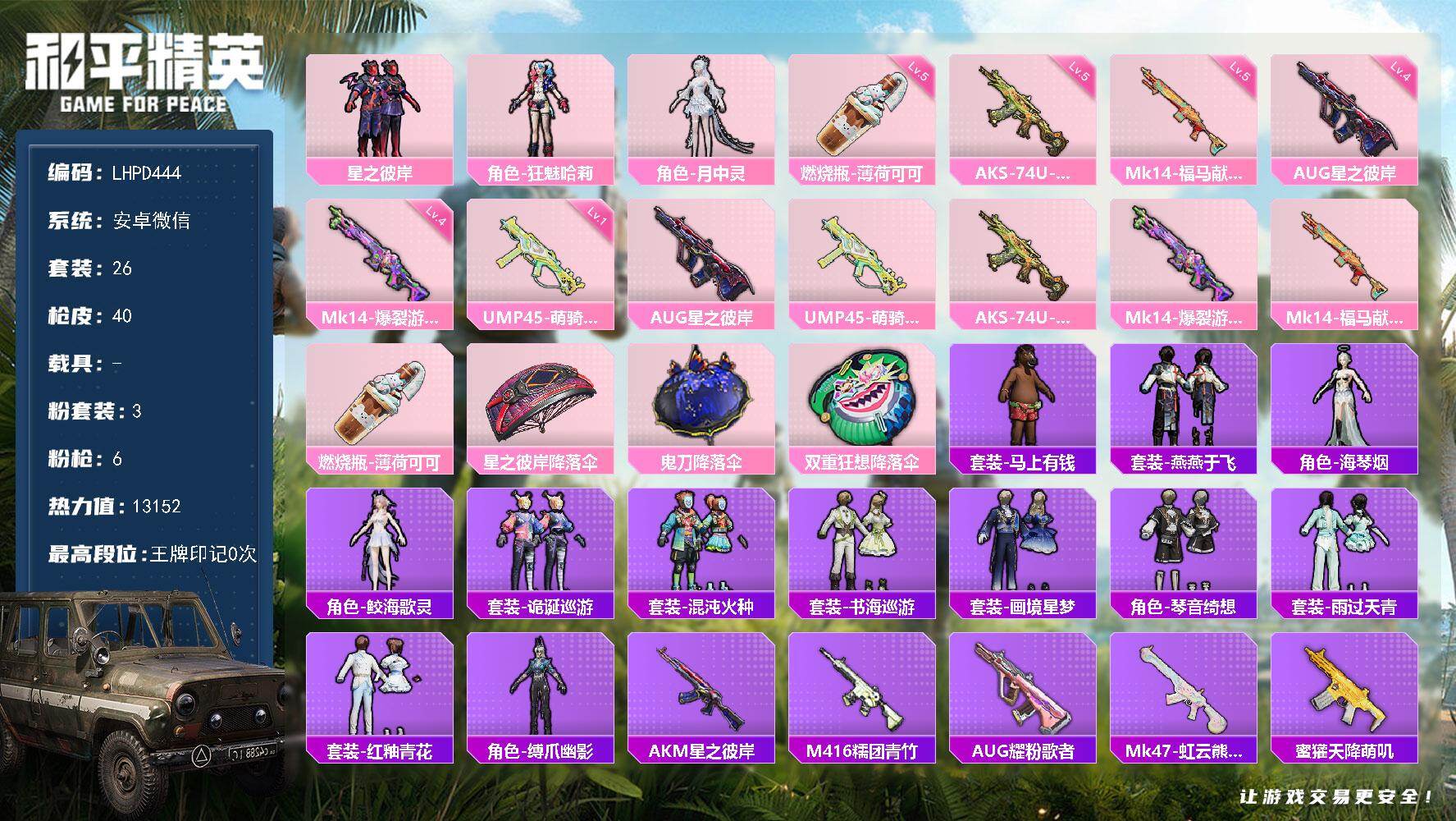 [17206132]【特价出售/店主推荐】安卓 微信-3粉装-6特效枪--13152热力值-2王牌印记-26套装-40枪皮 【粉色套装】:粉装-星之彼岸,角色-狂魅哈莉,角色-月中灵 【粉色枪皮等级】:AUG-星之彼岸(四级),UMP45-萌骑冒险(一级),AKS-74U-森灵之息(五级),Mk14-爆裂游戏(四级),Mk14-福马献瑞(五级),燃烧瓶-薄荷可可(五级) 【粉色枪皮】:AUG-星之彼岸,UMP45-萌骑冒险,AKS-74U-森灵之息,Mk14-爆裂游戏,Mk14-福马献瑞,燃烧瓶-薄荷可可 【粉色降落伞】:星之彼岸降落伞,鬼刀降落伞,双重狂想降落伞 【稀有套装】:套装-马上有钱,套装-燕燕于飞,角色-海琴烟,角色-鲛海歌灵,套装-诡诞巡游,套装-混沌火种,套装-书海巡游,套装-画境星梦,套装-琴音绮想,套装-雨过天青,套装-红釉青花,角色-缚爪幽影 【稀有枪皮】:AKM-星之彼岸,M416-糯团青竹,AUG-耀粉歌者,Mk47-虹云熊熊,蜜獾-天降萌叽,蜜獾-虎痴许褚,ACE32-画境星梦,MP5K-画境星梦,AKS-74U-鬼刀,燃点复合弓-幻海仙踪,VSS-星之彼岸,M200-爆裂游戏,M1加兰德-画境星梦,AA12-G-画境星梦,M249-星之彼岸,大砍刀-鬼刀,撬棍-双重狂想,平底锅-画境星梦 【其他套装】:套装-王牌教练,套装-街头潮人,套装-鹤鸣,套装-星梦畅游 【营地ID】:1033199808
