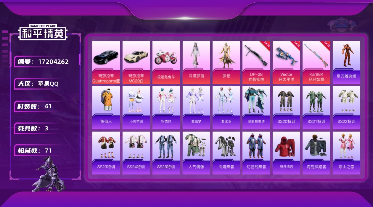 [17204262]地铁满天赋苹果 手Q-2粉装-3特效枪-3载具-1粉色飞行器-26002热力值-8王牌印记-61套装-71枪皮【热门品类】:角色-军刀雅典娜,套装-龟仙人【粉色套装】:角色-冷漠罗丽,角色-罗征【粉色枪皮等级】:Vector-环太平洋(五级),Kar98K-巳巳如意(五级),DP-28-豹影疾电(五级)【粉色载具】:玛莎拉蒂MC20(星石白),玛莎拉蒂Quattroporte(夜幕蓝),极速兔兔车【粉色枪皮】:Vector-环太平洋,Kar98K-巳巳如意,DP-28-豹影疾电