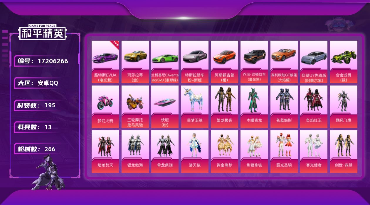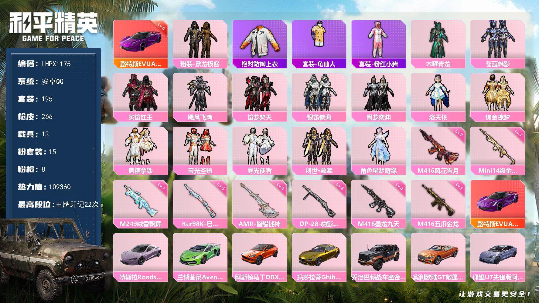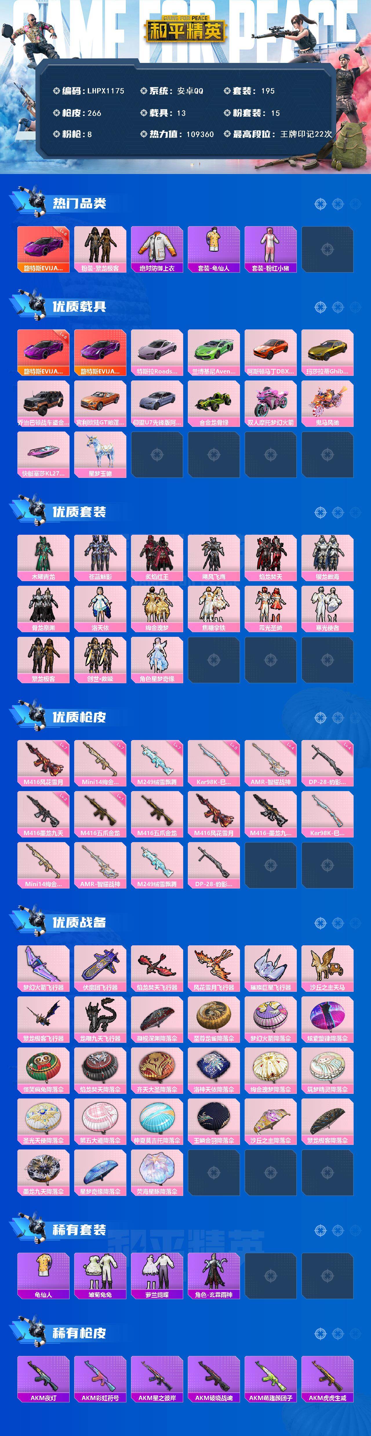 [17206266]【特价出售/店主推荐】安卓 手Q-15粉装-8特效枪-13载具-8粉色飞行器-109360热力值-22王牌印记-195套装-266枪皮 【红色载具】:路特斯EVIJA(电光紫)(六级) 【热门品类】:粉装-繁龙极客,绝对防御上衣,套装-龟仙人,套装-粉红小猪 【粉色套装】:粉装-木曜青龙,粉装-苍蓝魅影,粉装-炙焰红王,粉装-飓风飞鹰,粉装-焰龙焚天,粉装-银龙傲海,粉装-骨龙祭渊,角色-洛天依,粉装-绚金瑰梦,粉装-焦糖拿铁,粉装-霞光圣骑,粉装-寒光使者,粉装-繁龙极客,套装-创世·救赎,角色-星梦奇缘 【粉色枪皮等级】:M416-五爪金龙(一级),M416-风花雪月(七级),M416-墨龙九天(三级),Kar98K-巳巳如意(五级),Mini14-绚金瑰梦(七级),AMR-智耀战神(四级),M249-绒雪飘舞(七级),DP-28-豹影疾电(四级) 【粉色载具】:路特斯EVIJA(电光紫),特斯拉Roadster(沁心粉),兰博基尼Aventador SVJ(翡翠绿),阿斯顿马丁DBX(橙),玛莎拉蒂Ghibli(金),乔治巴顿战车(鎏金黑),宾利欧陆GT敞篷(火焰橘),仰望U7(阿盖尔紫),合金龙骨(绿),双人摩托-梦幻火箭,鬼马风驰,快艇-塞莎KL27(霓虹粉),星梦玉骢 【粉色枪皮】:M416-五爪金龙,M416-风花雪月,M416-墨龙九天,Kar98K-巳巳如意,Mini14-绚金瑰梦,AMR-智耀战神,M249-绒雪飘舞,DP-28-豹影疾电 【粉色飞行器】:梦幻火箭飞行器,伏魔团飞行器,焰龙焚天飞行器,风花雪月飞行器,璀璨巨星飞行器,沙丘之主天马,繁龙极客飞行器,龙翔九天飞行器 【粉色降落伞】:凝视深渊降落伞,至尊龙雀降落伞,梦幻火箭降落伞,炫紫旋律降落伞,怪笑疯兔降落伞,焰龙焚天降落伞,齐天大圣降落伞,洛神天依降落伞,绚金瑰梦降落伞,筑梦精灵降落伞,圣光天使降落伞,第五大道降落伞,仲夏莫吉托降落伞,玉鳞金羽降落伞,沙丘之主降落伞,繁龙极客降落伞,墨龙九天降落伞,星梦奇缘降落伞,荧海星豚降落伞 【稀有套装】:套装-龟仙人,套装-雪国风尚,套装-雏菊兔兔,套装-萝兰蝴蝶,角色-玄霖雨神 【稀有枪皮】:AKM-夜灯,AKM-彩虹符号,AKM-星之彼岸,AKM-破晓战魂,AKM-萌趣颜团子,AKM-虎虎生威,AKM-霓虹街区,M16A4-凝视深渊,M1