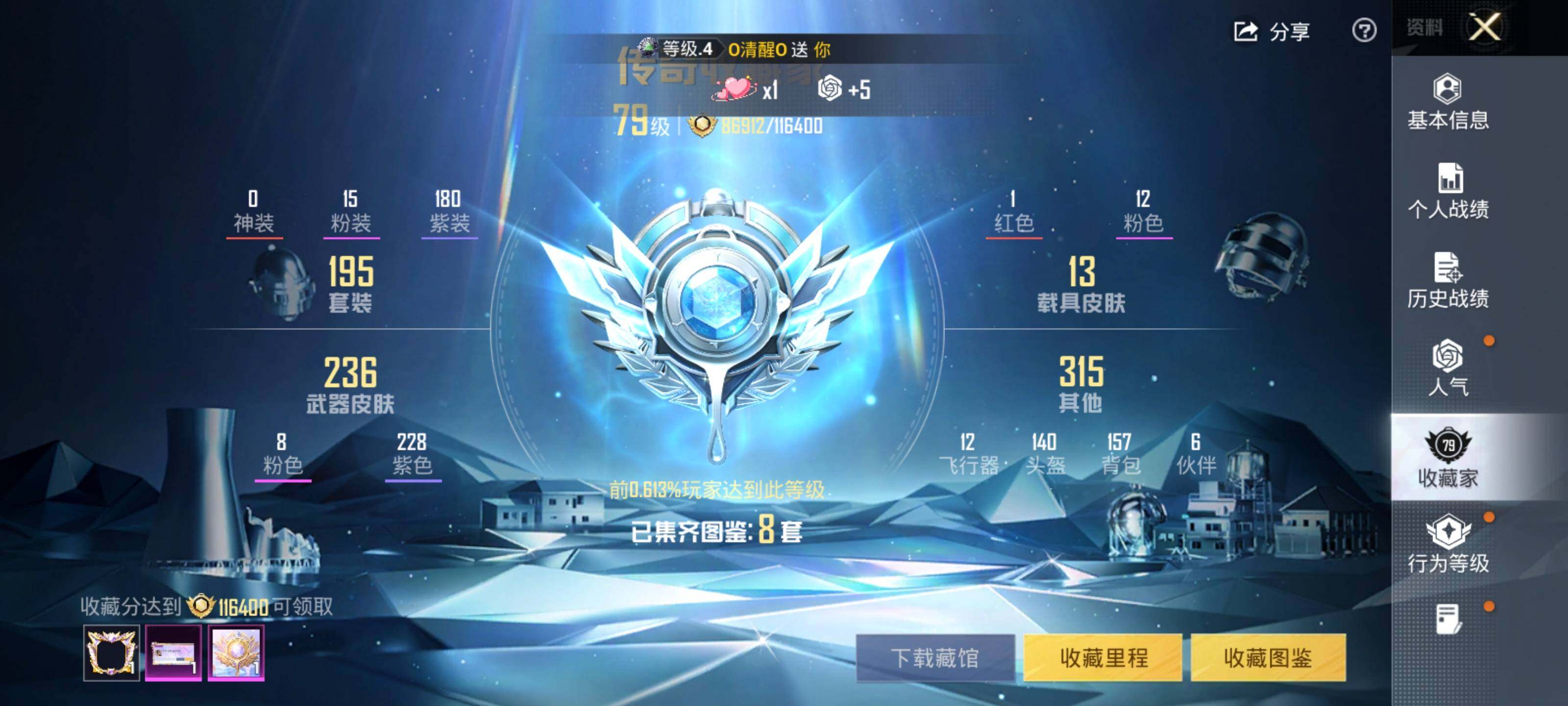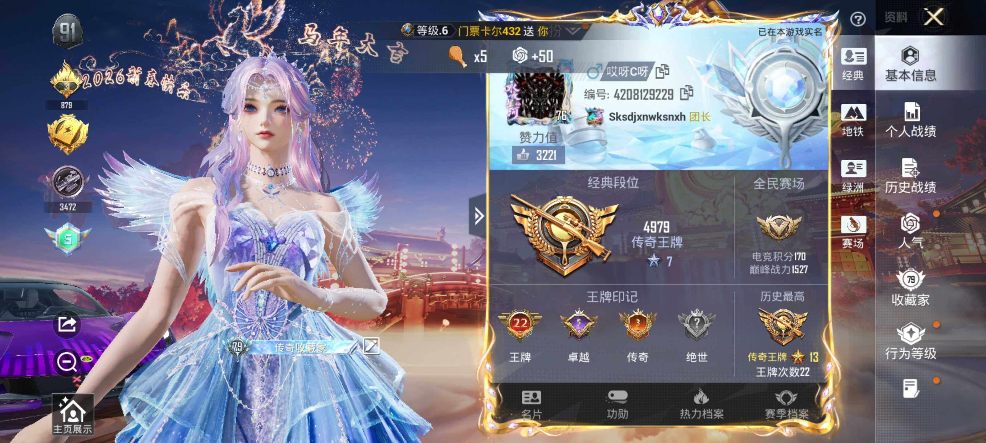 - [11004458]实名: 可修改 时装数: 278 载具数: 1 枪械数: 61 战备数: 45 热门装扮: 第五大道 载具: 特斯拉Model X(珍珠白) 稀有枪皮: Kar98K-巳巳如意,DP-28-豹影疾电