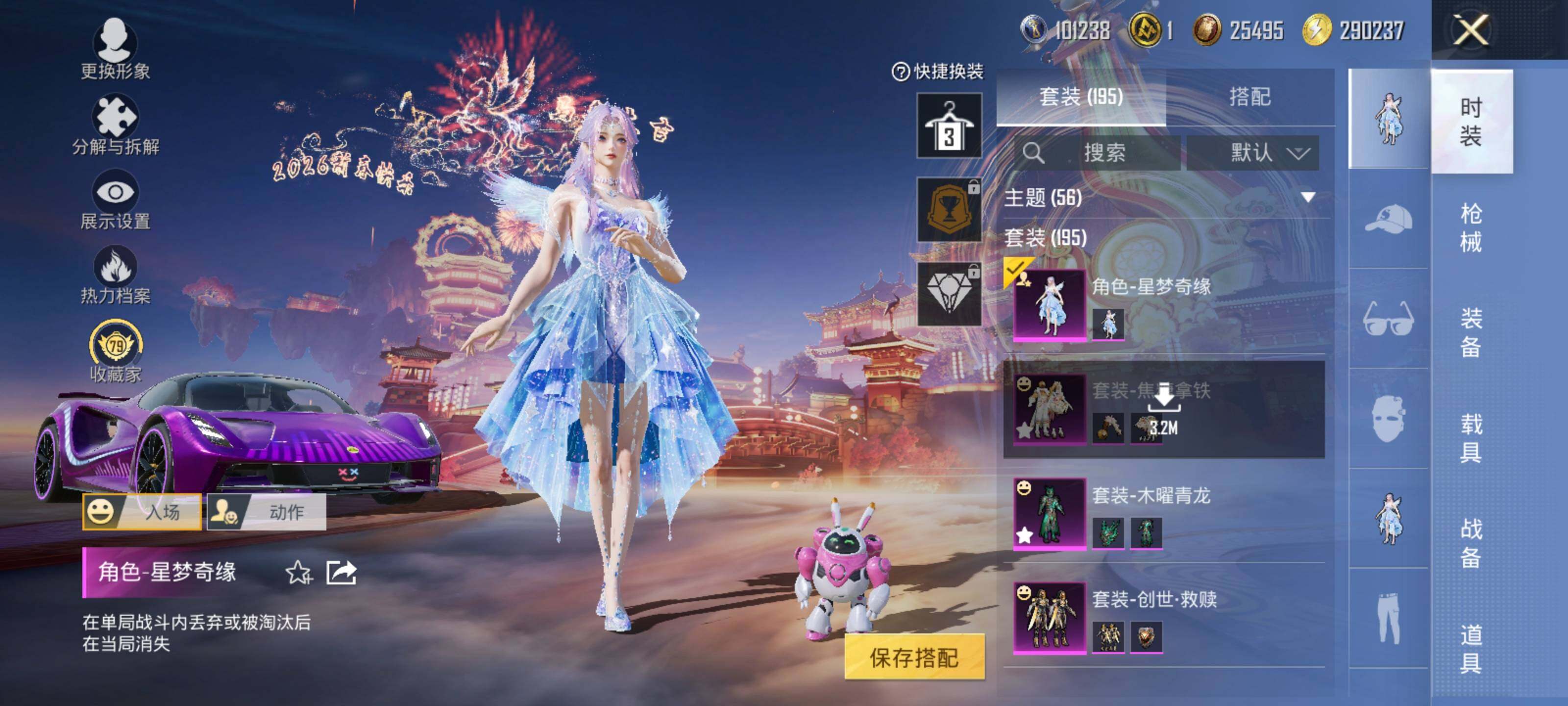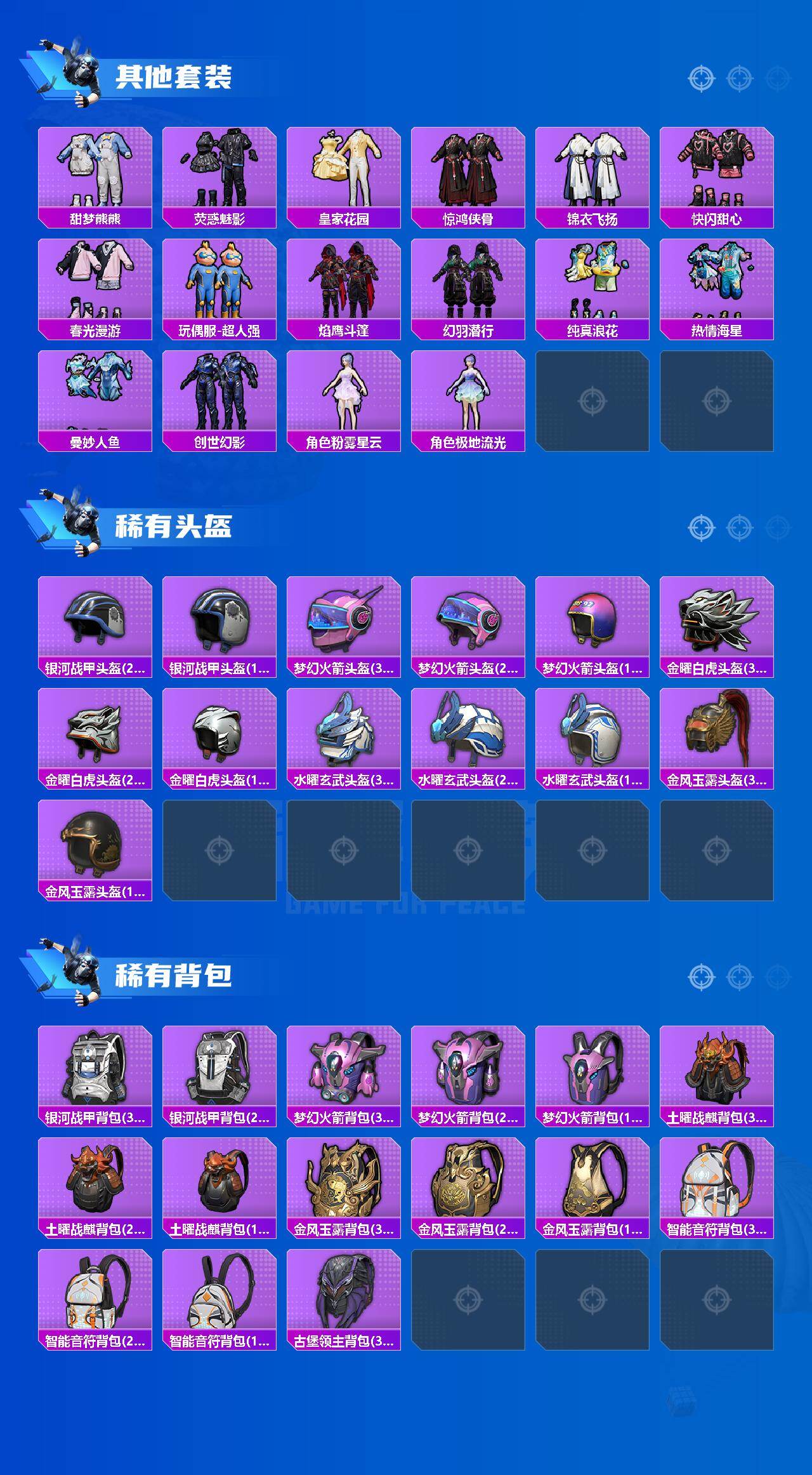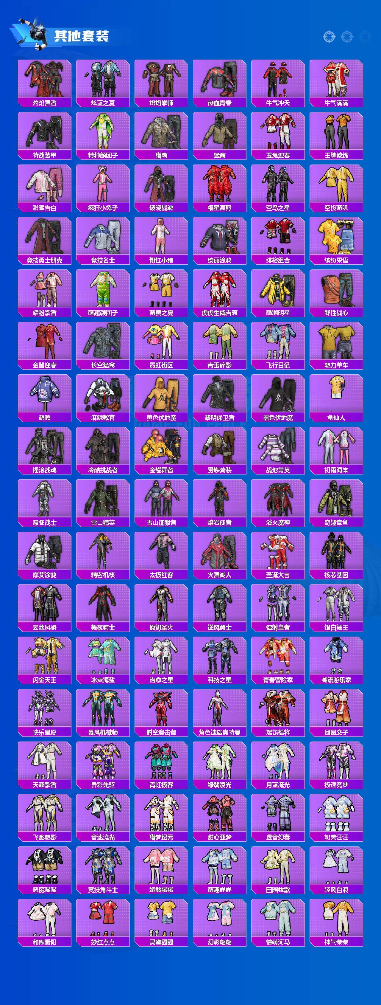 套装-繁龙极客,套装-木曜青龙,套装-苍蓝魅影,套装-炙焰红王,套装-飓风飞鹰,套装-焰龙焚天,套装-银龙傲海,套装-骨龙祭渊,角色-洛天依,套装-绚金瑰梦,焦糖拿铁套装,套装-霞光圣骑,套装-寒光使者,套装-创世·救赎,角色-星梦奇缘,奇迹天团套装,套装-奶芙汪汪,套装-恶魔喵喵