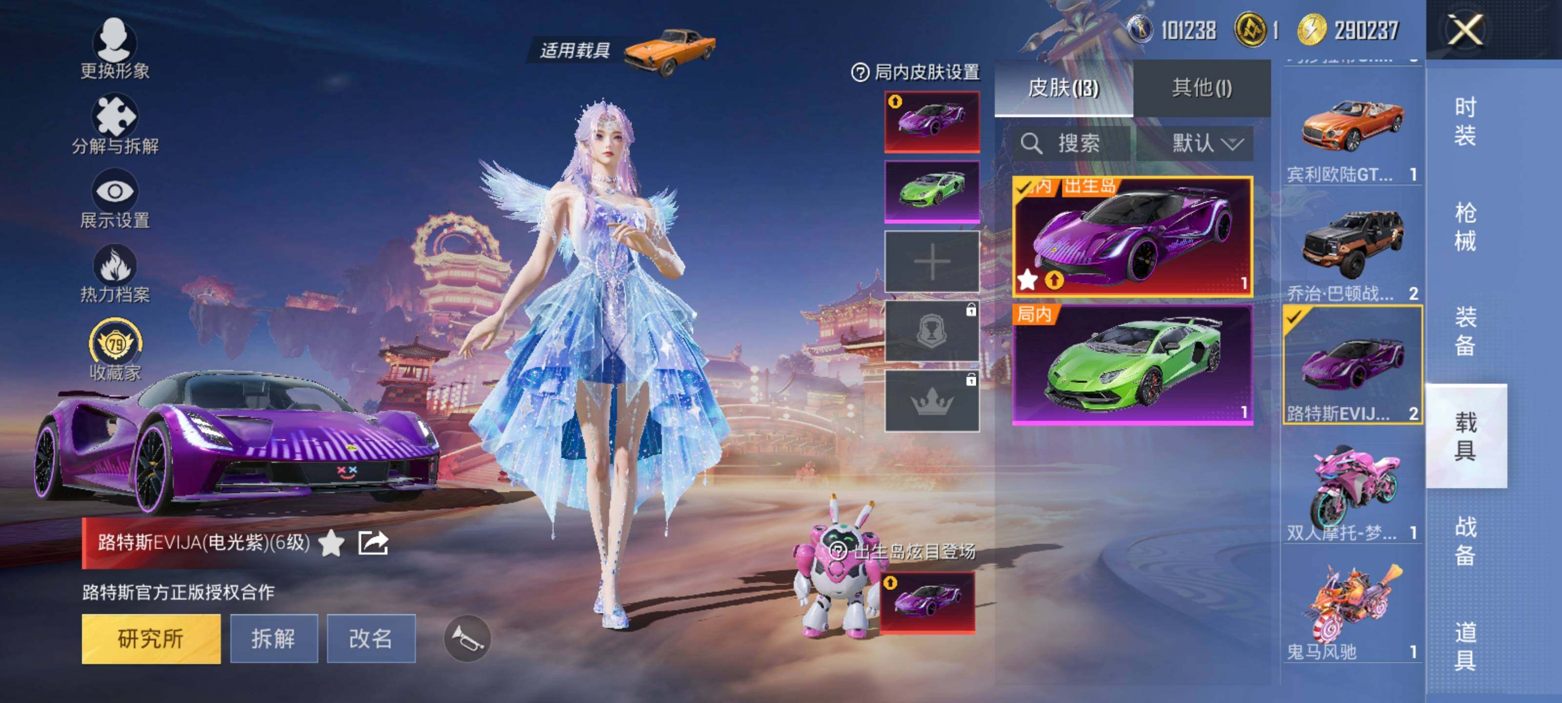 【粉色载具】:路特斯EVIJA(电光紫),特斯拉Roadster(沁心粉),兰博基尼Aventador SVJ(翡翠绿),阿斯顿马丁DBX(橙),玛莎拉蒂Ghibli(金),乔治巴顿战车(鎏金黑),宾利欧陆GT敞篷(火焰橘),仰望U7(阿盖尔紫),合金龙骨(绿),双人摩托-梦幻火箭,鬼马风驰,快艇-塞莎KL27(霓虹粉),星梦玉骢