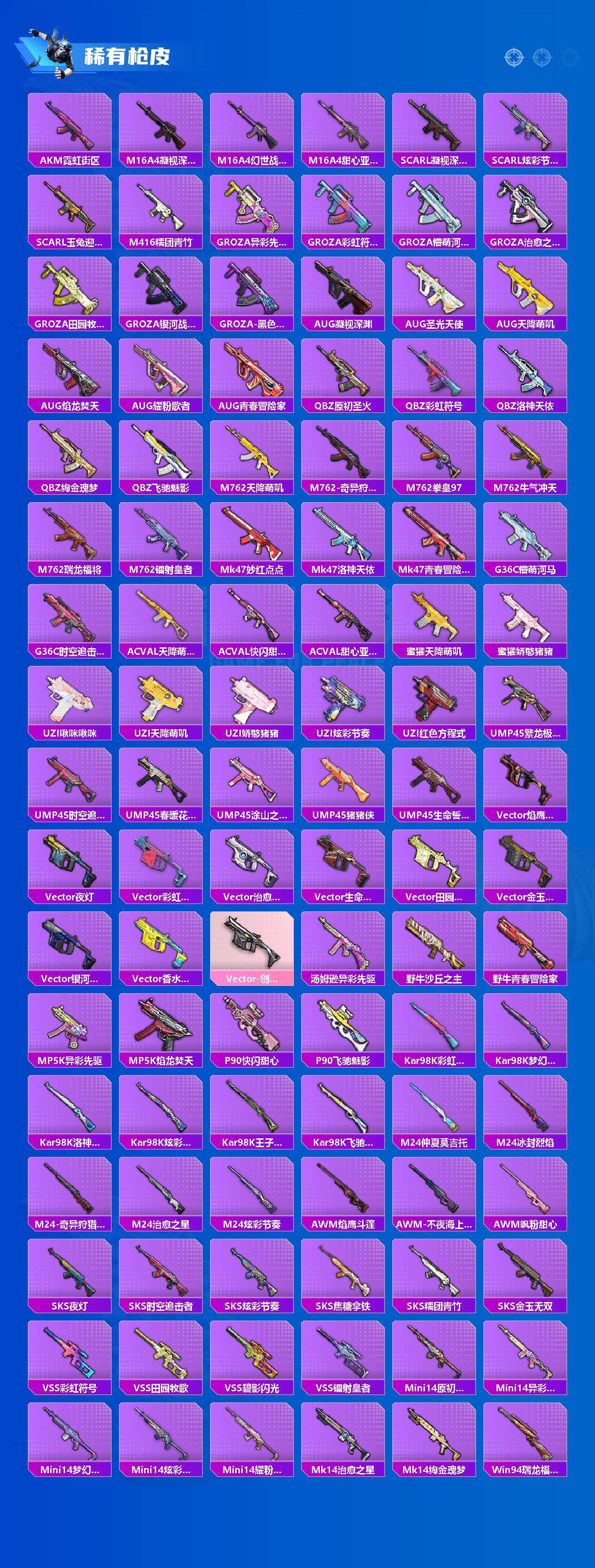【稀有枪皮】:AKM-夜灯,AKM-彩虹符号,AKM-星之彼岸,AKM-破晓战魂,AKM-萌趣颜团子,AKM-虎虎生威,AKM-霓虹街区,M16A4-凝视深渊,M1