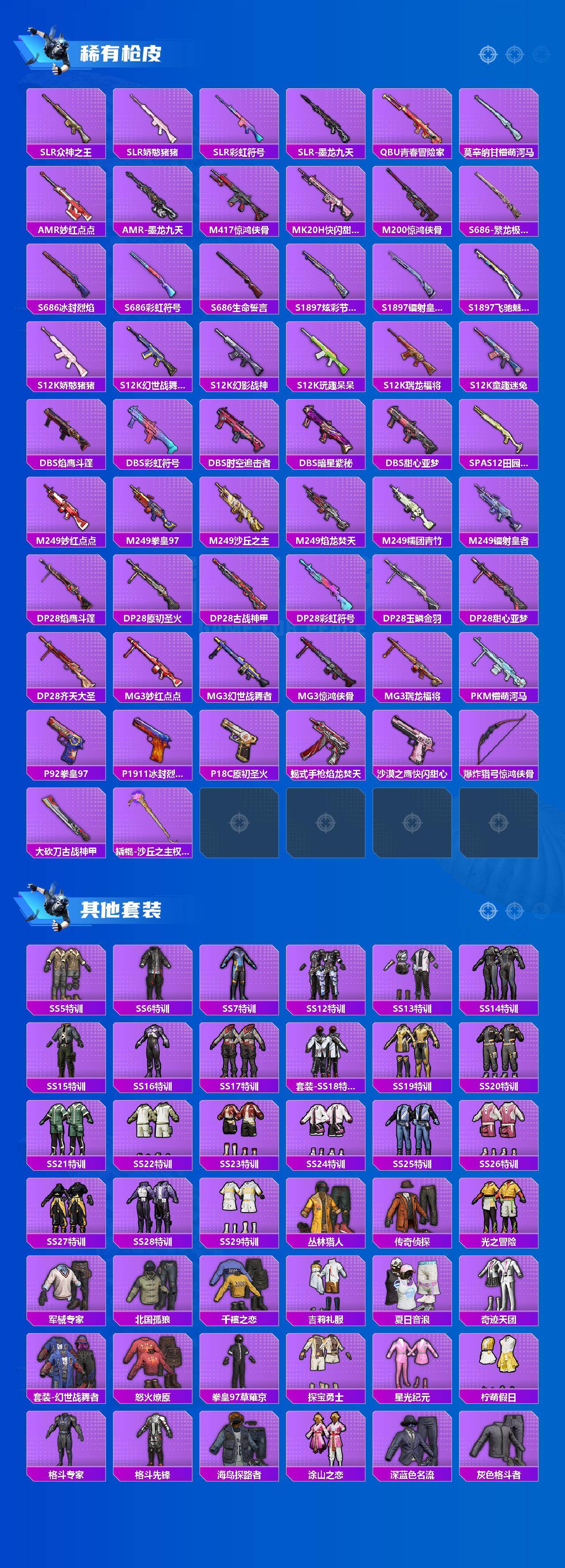 【粉色枪皮】:M416-五爪金龙,M416-风花雪月,M416-墨龙九天,Kar98K-巳巳如意,Mini14-绚金瑰梦,AMR-智耀战神,M249-绒雪飘舞,DP-28-豹影疾电