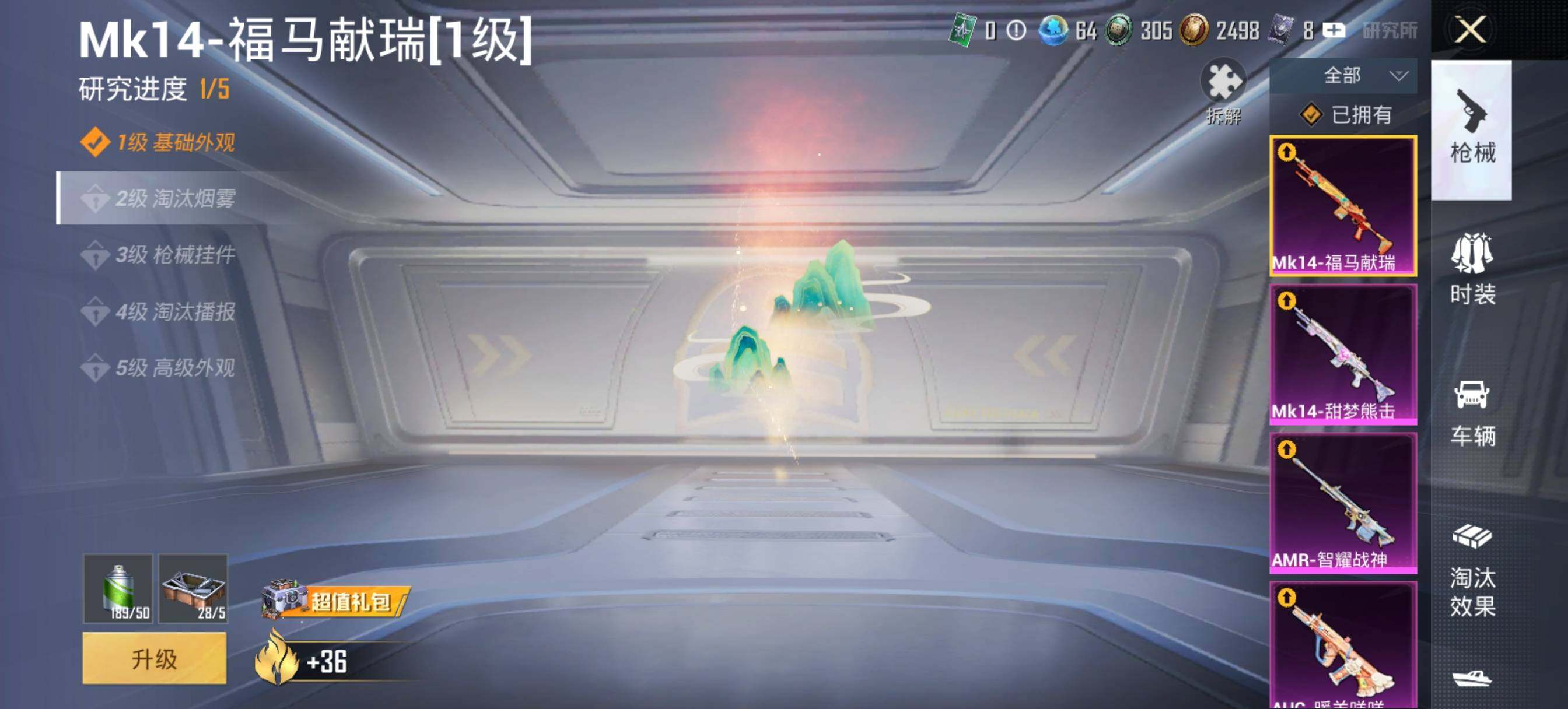 【粉色枪皮等级】:SCAR-L-纯梦嫁纱(五级),M416-五爪金龙(六级),GROZA-镜光银凌(五级),AUG-暖羊咩咩(五级),Kar98K-巳巳如意(五级),Mk14-甜梦熊击(五级),Mk14-福马献瑞(一级),AMR-智耀战神(五级),DP-28-暗夜鎏金(四级)