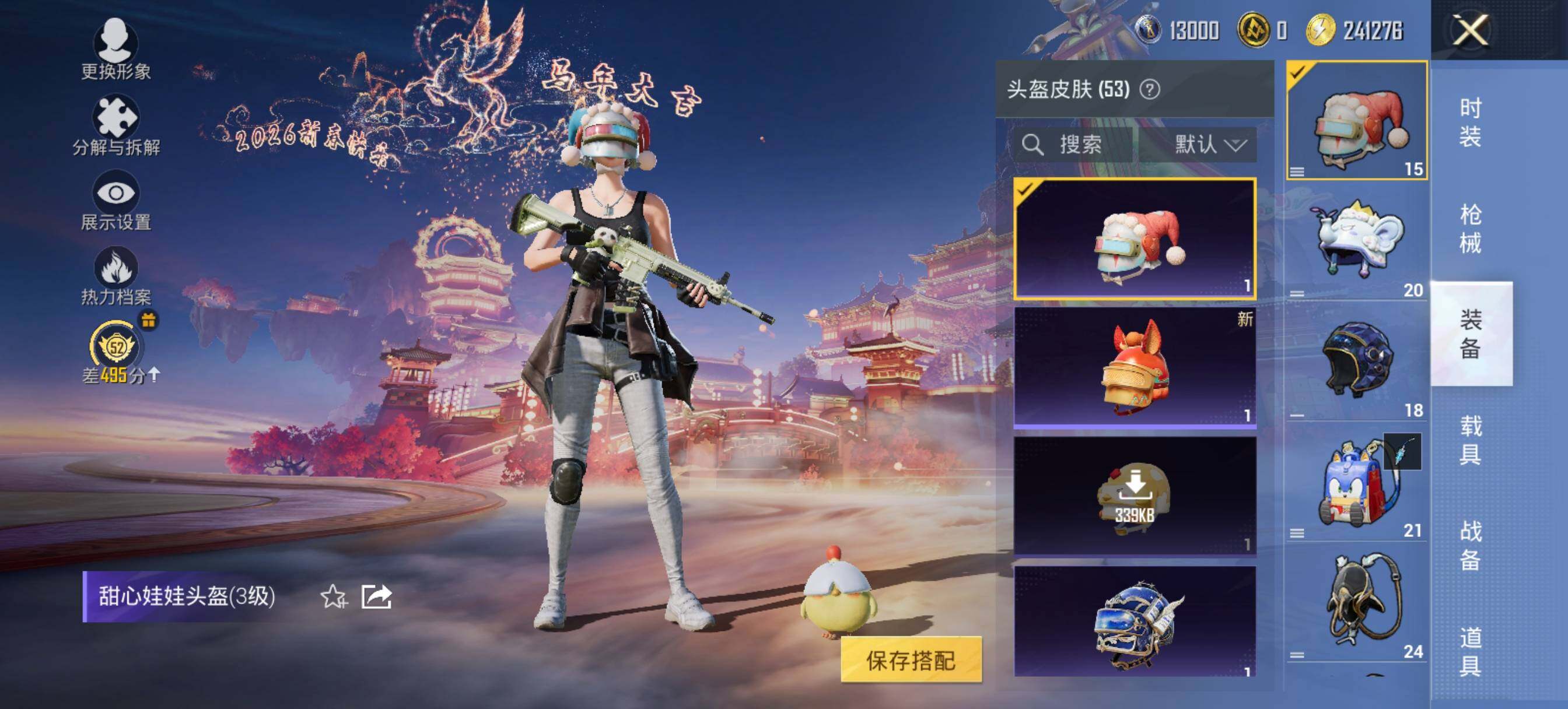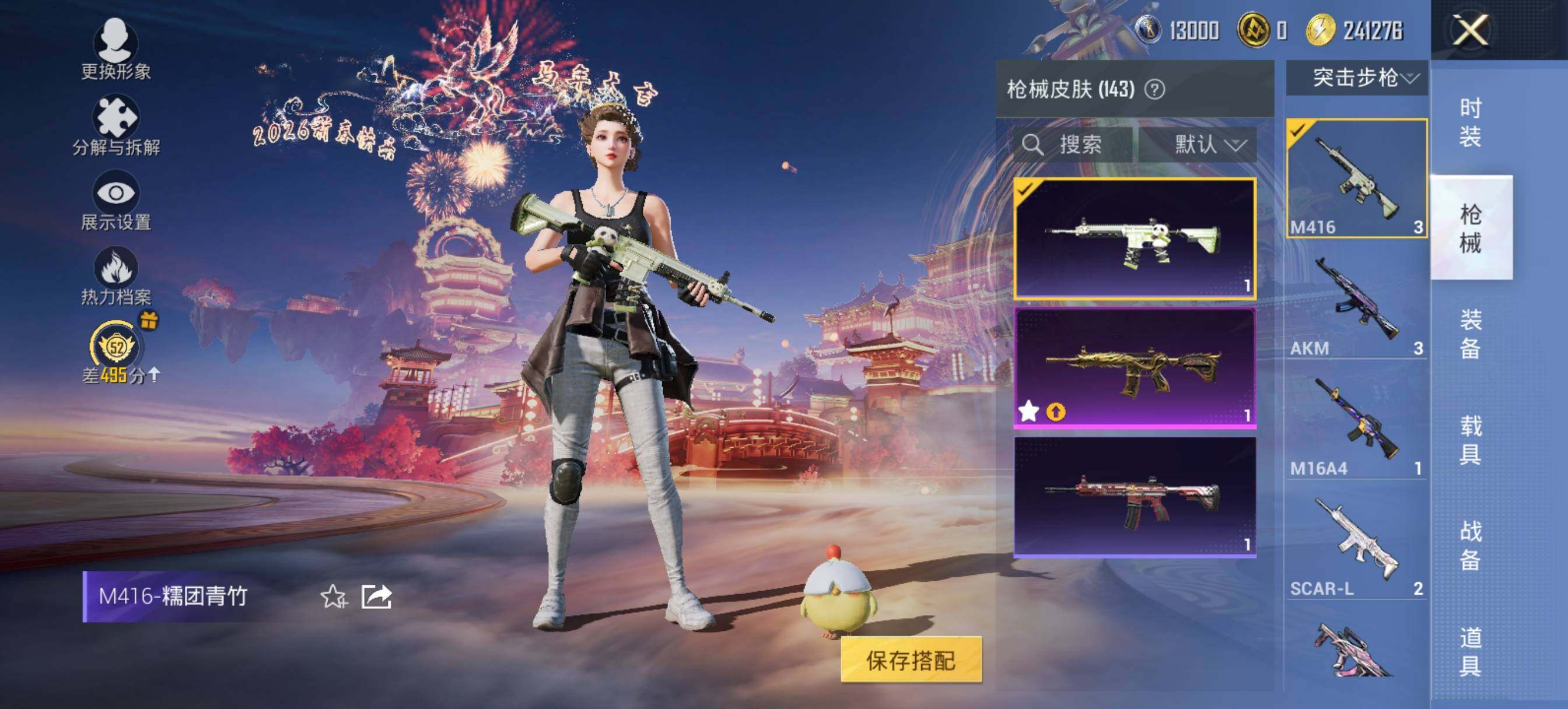 【粉色枪皮】:SCAR-L-纯梦嫁纱,M416-五爪金龙,GROZA-镜光银凌,AUG-暖羊咩咩,Kar98K-巳巳如意,Mk14-甜梦熊击,Mk14-福马献瑞,AMR-智耀战神,DP-28-暗夜鎏金