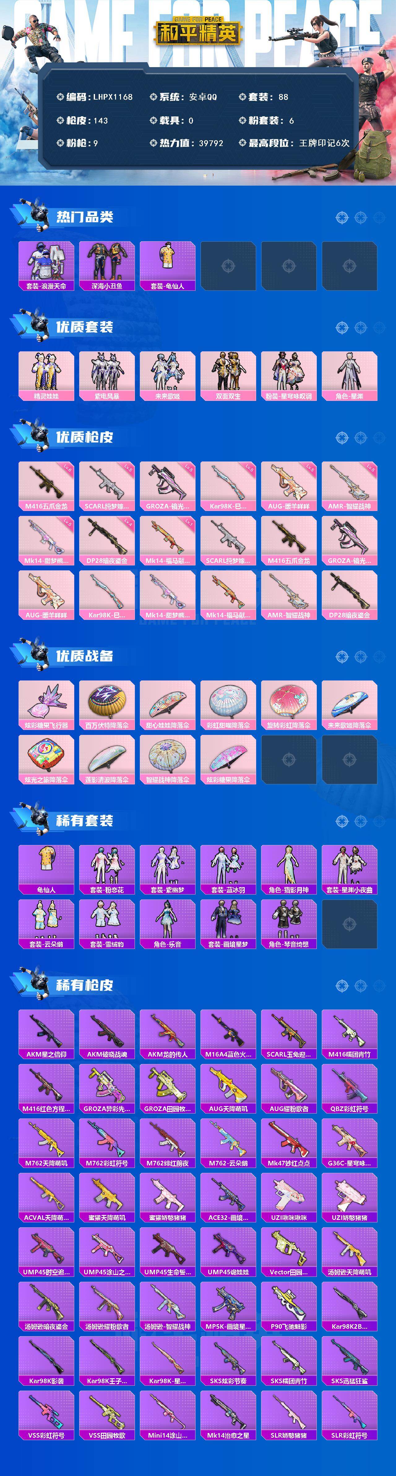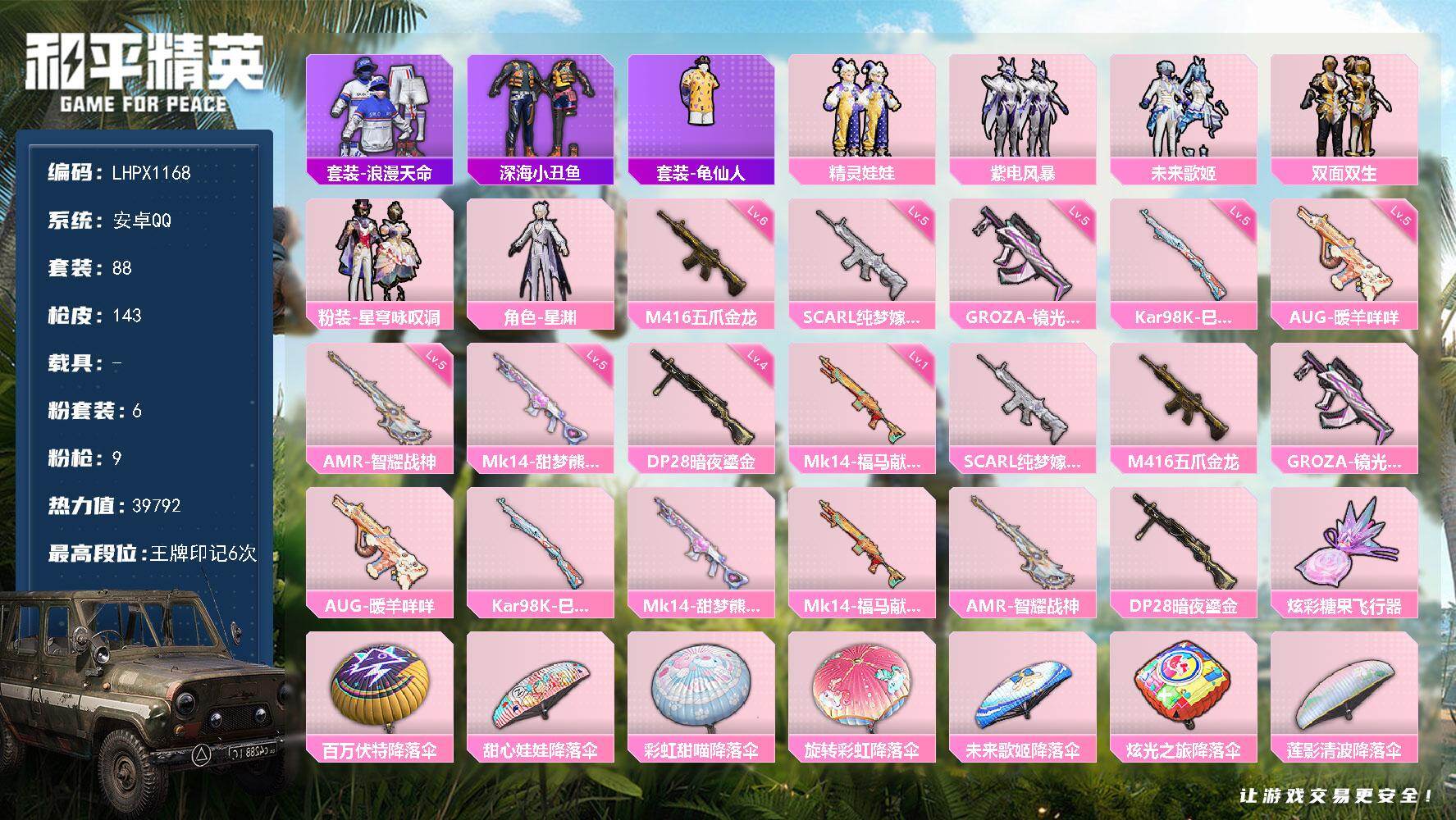 [17206341]【特价出售/店主推荐】安卓 手Q-6粉装-9特效枪-0载具-1粉色飞行器-39792热力值-6王牌印记-88套装-143枪皮 【热门品类】:套装-浪漫天命,套装-深海小丑鱼,套装-龟仙人 【粉色套装】:粉装-精灵娃娃,粉装-紫电风暴,粉装-未来歌姬,粉装-双面双生,粉装-星穹咏叹调,角色-星渊 【粉色枪皮等级】:SCAR-L-纯梦嫁纱(五级),M416-五爪金龙(六级),GROZA-镜光银凌(五级),AUG-暖羊咩咩(五级),Kar98K-巳巳如意(五级),Mk14-甜梦熊击(五级),Mk14-福马献瑞(一级),AMR-智耀战神(五级),DP-28-暗夜鎏金(四级) 【粉色枪皮】:SCAR-L-纯梦嫁纱,M416-五爪金龙,GROZA-镜光银凌,AUG-暖羊咩咩,Kar98K-巳巳如意,Mk14-甜梦熊击,Mk14-福马献瑞,AMR-智耀战神,DP-28-暗夜鎏金 【粉色飞行器】:炫彩糖果飞行器 【粉色降落伞】:百万伏特降落伞,甜心娃娃降落伞,彩虹甜喵降落伞,旋转彩虹降落伞,未来歌姬降落伞,炫光之旅降落伞,莲影清波降落伞,智耀战神降落伞,炫彩糖果降落伞 【稀有套装】:套装-龟仙人,套装-炫彩糖果,套装-粉恋花,套装-紫幽梦,套装-蓝冰羽,角色-猎影月神,套装-星渊小夜曲,套装-云朵鹅,套装-雪绒豹,角色-乐音,套装-画境星梦,套装-琴音绮想 【稀有枪皮】:AUG-冰晶雪宝,AKM-星之信仰,AKM-破晓战魂,AKM-龙的传人,M16A4-蓝色火焰,SCAR-L-玉兔迎春,M416-糯团青竹,M416-红色方程式,GROZA-异彩先驱,GROZA-田园牧歌,AUG-天降萌叽,AUG-耀粉歌者,QBZ-彩虹符号,M762-天降萌叽,M762-彩虹符号,M762-绯红前夜,M762-云朵鹅,Mk47-妙红点点,G36C-星穹咏叹调,AC-VAL-天降萌叽,蜜獾-天降萌叽,蜜獾-娇憨猪猪,ACE32-画境星梦,UZI-啾咪啾咪,UZI-娇憨猪猪,UMP45-时空追击者,UMP45-涂山之恋,UMP45-生命誓言,UMP45-诡娃娃,Vector-田园牧歌,汤姆逊-天降萌叽,汤姆逊-暗夜鎏金,汤姆逊-耀粉歌者,汤姆逊-智耀战神,MP5K-画境星梦,P90-飞驰魅影,Kar98K-2B战斗服款,Kar98K-影袭,Kar98K-王子的夏天,Kar98K-星穹咏叹调,SKS-炫