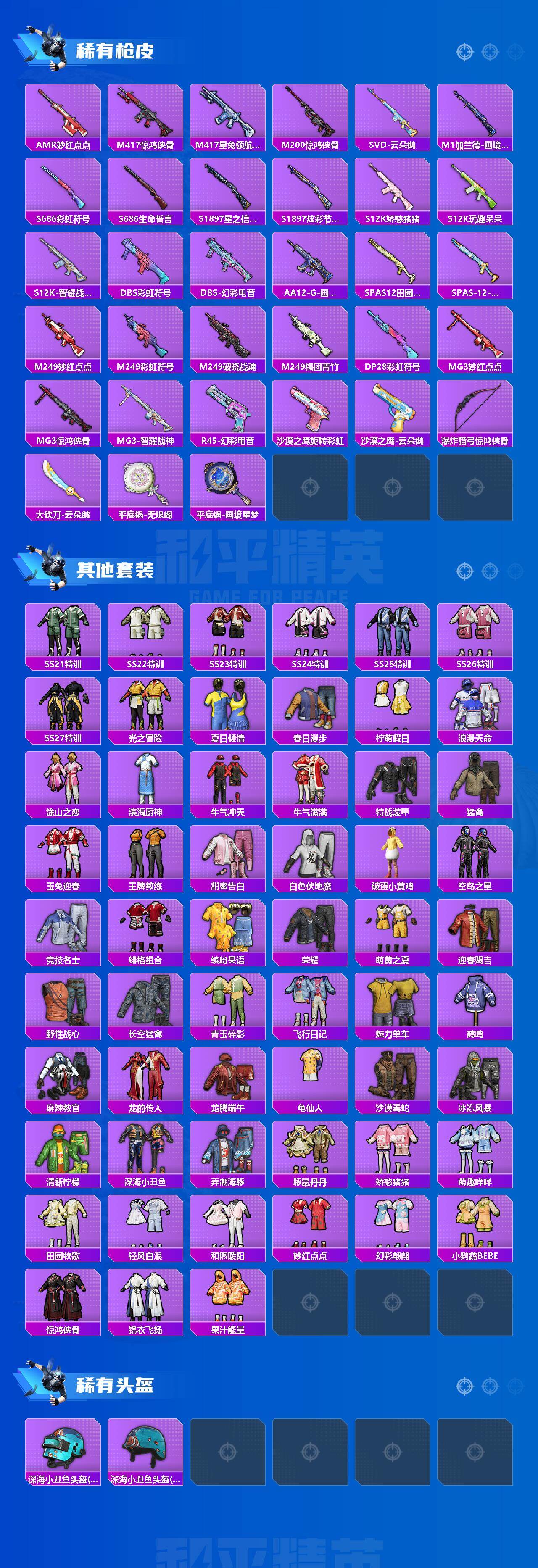 【稀有枪皮】:AUG-冰晶雪宝,AKM-星之信仰,AKM-破晓战魂,AKM-龙的传人,M16A4-蓝色火焰,SCAR-L-玉兔迎春,M416-糯团青竹,M416-红色方程式,GROZA-异彩先驱,GROZA-田园牧歌,AUG-天降萌叽,AUG-耀粉歌者,QBZ-彩虹符号,M762-天降萌叽,M762-彩虹符号,M762-绯红前夜,M762-云朵鹅,Mk47-妙红点点,G36C-星穹咏叹调,AC-VAL-天降萌叽,蜜獾-天降萌叽,蜜獾-娇憨猪猪,ACE32-画境星梦,UZI-啾咪啾咪,UZI-娇憨猪猪,UMP45-时空追击者,UMP45-涂山之恋,UMP45-生命誓言,UMP45-诡娃娃,Vector-田园牧歌,汤姆逊-天降萌叽,汤姆逊-暗夜鎏金,汤姆逊-耀粉歌者,汤姆逊-智耀战神,MP5K-画境星梦,P90-飞驰魅影,Kar98K-2B战斗服款,Kar98K-影袭,Kar98K-王子的夏天,Kar98K-星穹咏叹调,SKS-炫
