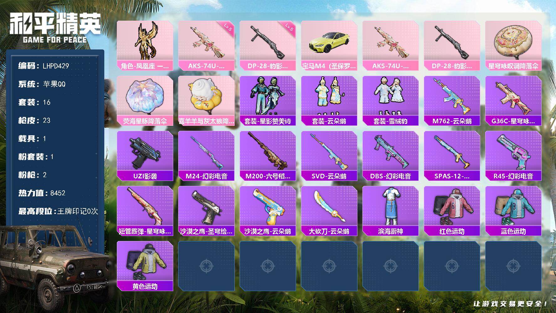 [17206213]【特价出售/苹果 手Q-1粉装-2特效枪-1载具-0粉色飞行器-8452热力值-1王牌印记-16套装-23枪皮【粉色套装】:角色-凤凰座 一辉【粉色枪皮等级】:AKS-74U-星穹咏叹调(五级),DP-28-豹影疾电(五级)【粉色载具】:宝马M4(圣保罗黄)【粉色枪皮】:AKS-74U-星穹咏叹调,DP-28-豹影疾