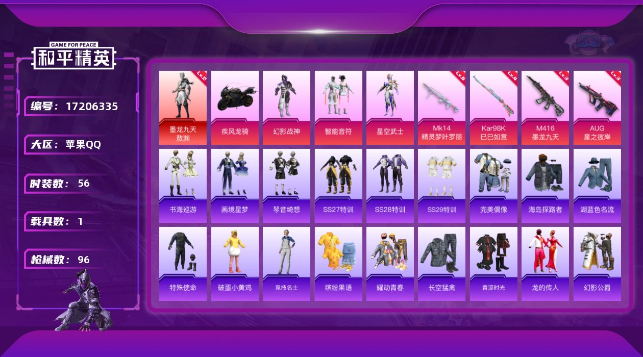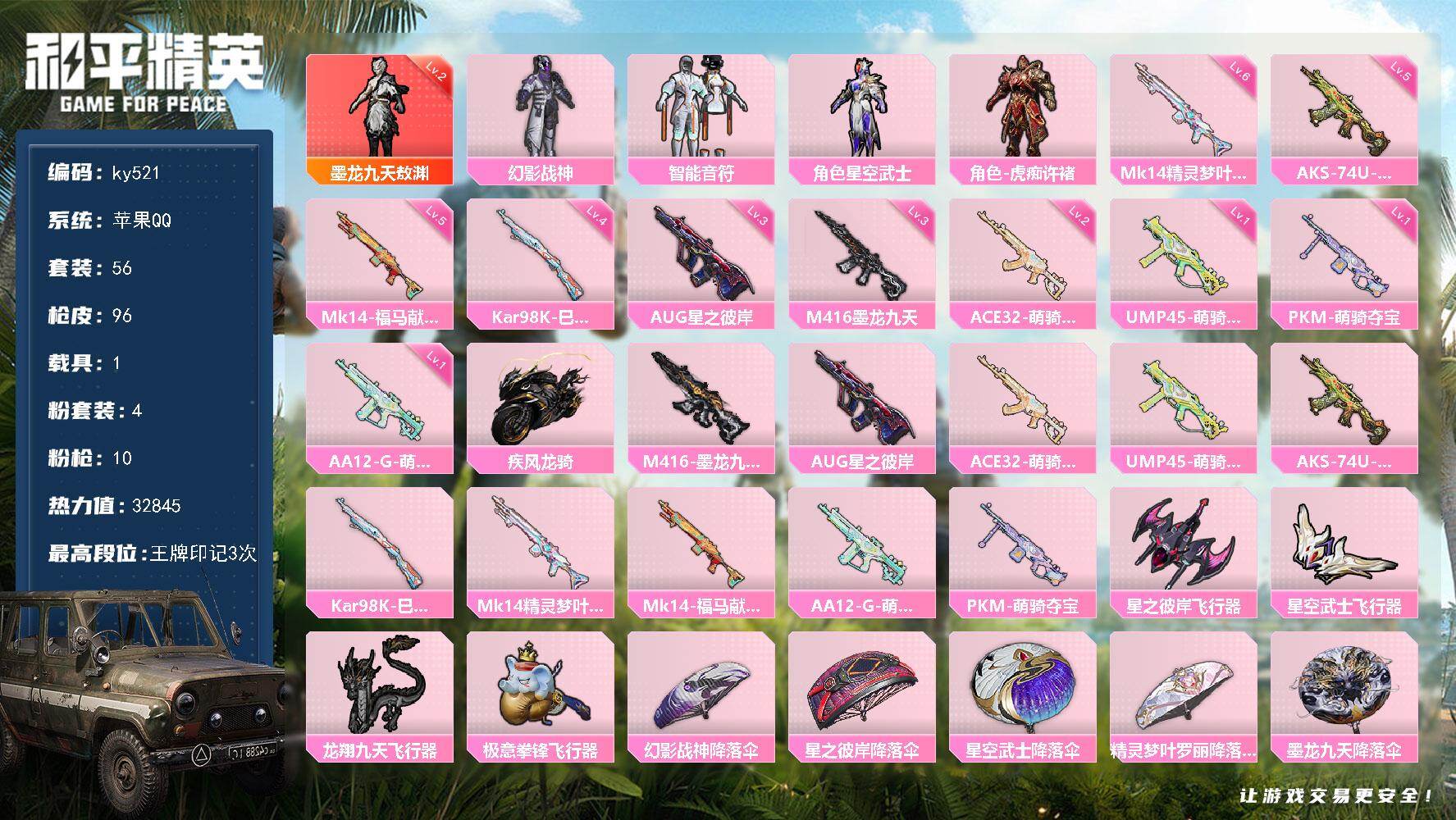 [17206335]苹果 手Q-1神装-4粉装-10特效枪-1载具-5粉色飞行器-32845热力值-3王牌印记-56套装-96枪皮