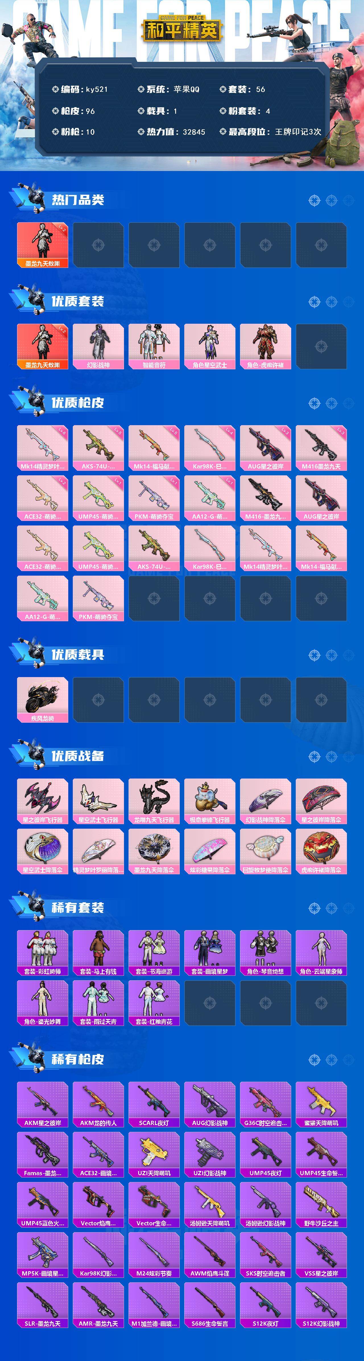 [17206335]苹果 手Q-1神装-4粉装-10特效枪-1载具-5粉色飞行器-32845热力值-3王牌印记-56套装-96枪皮 【红色神装等级】:墨龙九天-敖渊(二级) 【红色角色神装】:墨龙九天-敖渊 【粉色套装】:粉装-幻影战神,粉装-智能音符,角色-星空武士,角色-虎痴许褚 【粉色枪皮等级】:M416-墨龙九天(三级),AUG-星之彼岸(三级),ACE32-萌骑漫游(二级),UMP45-萌骑冒险(一级),AKS-74U-森灵之息(五级),Kar98K-巳巳如意(四级),Mk14-精灵梦叶罗丽(六级),Mk14-福马献瑞(五级),AA12-G-萌骑幻想(一级),PKM-萌骑夺宝(一级) 【粉色载具】:疾风龙骑 【粉色枪皮】:M416-墨龙九天,AUG-星之彼岸,ACE32-萌骑漫游,UMP45-萌骑冒险,AKS-74U-森灵之息,Kar98K-巳巳如意,Mk14-精灵梦叶罗丽,Mk14-福马献瑞,AA12-G-萌骑幻想,PKM-萌骑夺宝 【粉色飞行器】:星之彼岸飞行器,星空武士飞行器,龙翔九天飞行器,极意拳锋飞行器 【粉色降落伞】:幻影战神降落伞,星之彼岸降落伞,星空武士降落伞,精灵梦叶罗丽降落伞,墨龙九天降落伞,炫彩糖果降落伞,回旋牧梦使降落伞,虎痴许褚降落伞 【稀有套装】:套装-彩虹骑师,套装-马上有钱,套装-书海巡游,套装-画境星梦,套装-琴音绮想,角色-云端星象师,角色-鎏光妙舞,套装-雨过天青,套装-红釉青花 【稀有枪皮】:AKM-星之彼岸,AKM-龙的传人,SCAR-L-夜灯,AUG-幻影战神,G36C-时空追击者,蜜獾-天降萌叽,Famas-墨龙九天,ACE32-画境星梦,UZI-天降萌叽,UZI-幻影战神,UMP45-夜灯,UMP45-生命誓言,UMP45-蓝色火焰,Vector-焰鹰斗篷,Vector-生命誓言,汤姆逊-天降萌叽,汤姆逊-幻影战神,野牛-沙丘之主,MP5K-画境星梦,Kar98K-幻影战神,M24-炫彩节奏,AWM-焰鹰斗篷,SKS-时空追击者,VSS-星之彼岸,SLR-墨龙九天,AMR-墨龙九天,M1加兰德-画境星梦,S686-生命誓言,S12K-夜灯,S12K-幻影战神,DBS-焰鹰斗篷,AA12-G-画境星梦,M249-星之彼岸,DP-28-焰鹰斗篷,MG3-幻世战舞者,TMP-9-江南烟雨,战术弩-江南烟雨,突击盾牌-虎痴许褚,撬棍-
