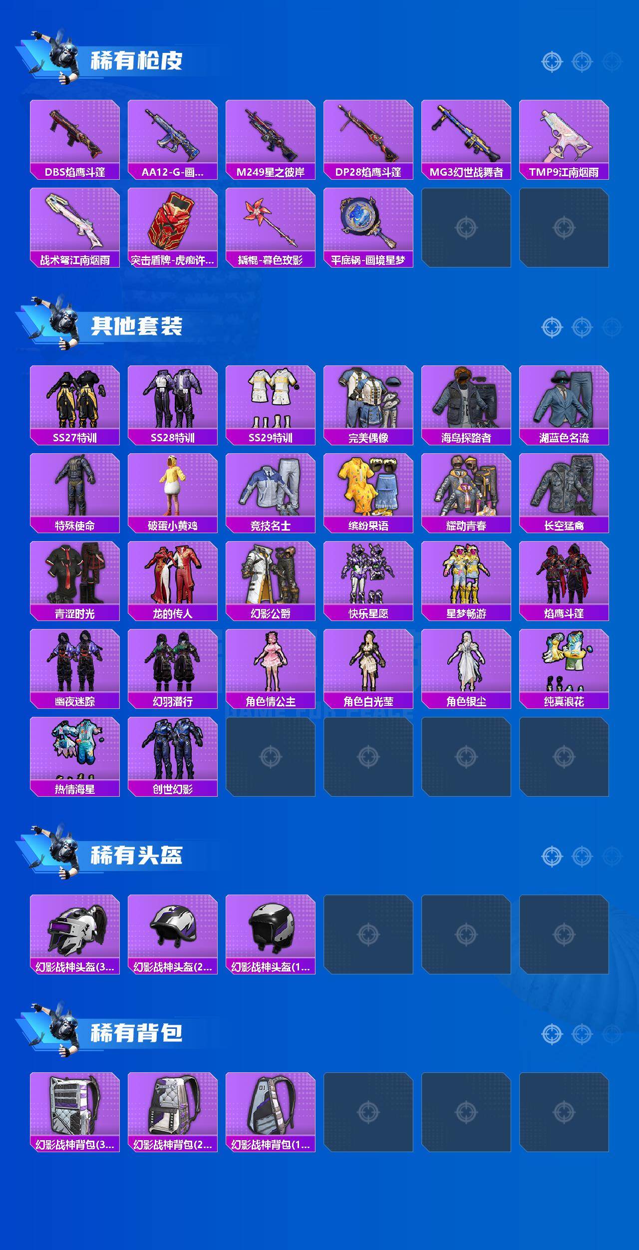 【稀有枪皮】:AKM-星之彼岸,AKM-龙的传人,SCAR-L-夜灯,AUG-幻影战神,G36C-时空追击者,蜜獾-天降萌叽,Famas-墨龙九天,ACE32-画境星梦,UZI-天降萌叽,UZI-幻影战神,UMP45-夜灯,UMP45-生命誓言,UMP45-蓝色火焰,Vector-焰鹰斗篷,Vector-生命誓言,汤姆逊-天降萌叽,汤姆逊-幻影战神,野牛-沙丘之主,MP5K-画境星梦,Kar98K-幻影战神,M24-炫彩节奏,AWM-焰鹰斗篷,SKS-时空追击者,VSS-星之彼岸,SLR-墨龙九天,AMR-墨龙九天,M1加兰德-画境星梦,S686-生命誓言,S12K-夜灯,S12K-幻影战神,DBS-焰鹰斗篷,AA12-G-画境星梦,M249-星之彼岸,DP-28-焰鹰斗篷,MG3-幻世战舞者,TMP-9-江南烟雨,战术弩-江南烟雨,突击盾牌-虎痴许褚,撬棍-