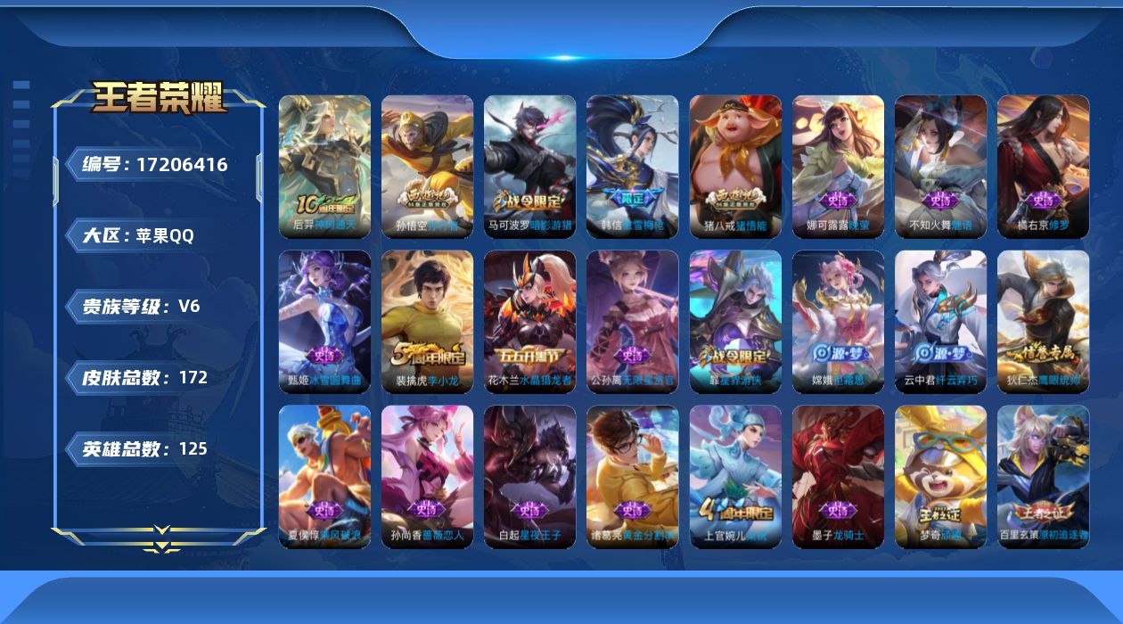 - [12031651]V8 1典藏 16传说 123英雄 181皮肤 可修改实名 优质装备:鸣剑·曳影,黄金射手座,云鹰飞将(小将军),久胜战神,一念神魔,仲夏夜之梦(大飞蛾),游龙清影(小青龙),淬星耀世,碎云,炽翼辉光(娃娃菜牛角包),涂山容容 珍宝阁皮:蔷薇恋人 限定皮:鸣野蒿,至尊宝,异界灵契(白毛香),前尘镜,时雨天司(水龙头),山海·碧波行(瑶年限),无限倾心-虞姬,齐天大圣,五谷丰年,冰锋战神,烈魂,山海·玄木吟(马可年限) 史诗皮:化蝶舞,龙之律动,蔬乡物语(鲁班七号),百相守梦-黄忠,紫霞仙子,黄金分割率,特工魅影,无限星赏官,偶像歌手,晚萤,末日机甲-吕布,猫狗日记-孙策,猫狗日记-大乔,时之恋人-孙尚香,女仆咖啡,水果甜心,绅士熊喵,星夜王子,心灵骇客,德古拉伯爵,暗隐猎兽者,鬼剑武藏,心灵战警,舞动绿茵,繁星吟游(呼啦呼啦),缤纷独角兽,乘风破浪,逐浪之夏,水晶猎龙者,曙光守护者,箭羽风息,唤灵魅影,圣诞狂欢,鹰眼统帅,魅力维加斯,赏金猎手,无心