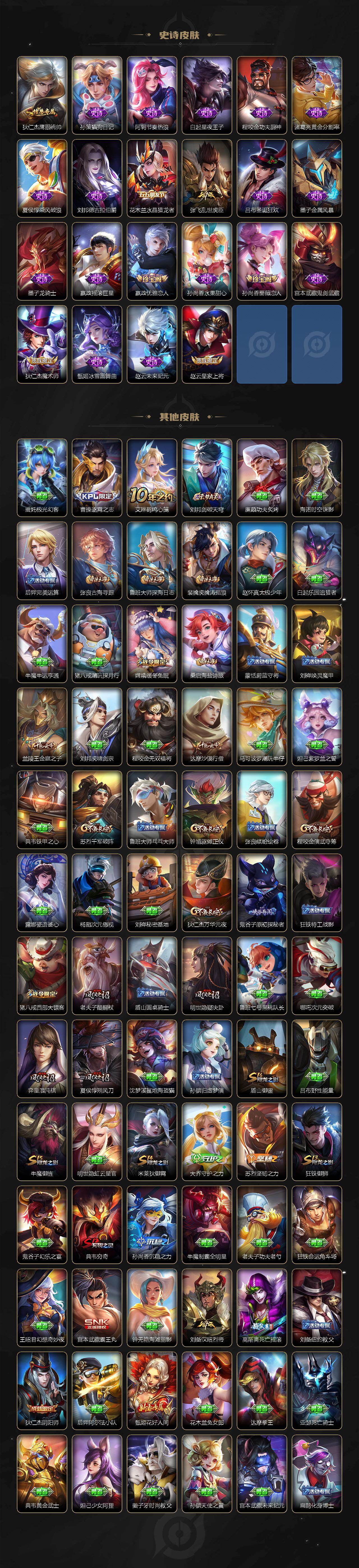 - [12807013]安卓Q-V4-最强王者段位-123英雄-111皮肤-1典藏-0珍品无双-0无双-0珍品传说-0传说-19史诗 【荣耀典藏】:孙尚香杀手不太冷 【限定皮肤】:白起狰,狄仁杰阴阳师,钟无艳王者之锤,芈月重明,夏侯惇朔风刀,曹操烛龙,典韦穷奇,典韦岱宗,狄仁杰万华元夜,达摩沙漠行僧,项羽海滩派对,老夫子醍醐杖,程咬金演武夺筹,兰陵王金庭之子,牛魔御旌,李元芳银河之约,钟馗驱傩正仪,太乙真人饕餮,鬼谷子原初探秘者,弈星混沌棋,沈梦溪星空之诺,沈梦溪大漠名商,明世隐疑决卦,裴擒虎李小龙,裴擒虎擒涛扼浪,狂铁御狮,米莱狄御霄,盾山御銮,鲁班大师探海日志,阿古朵江河有灵,张良古海寻踪 【年限皮肤】:典韦岱宗 【赛季限定】:白起狰,芈月重明,夏侯惇朔风刀,曹操烛龙,典韦穷奇,狄仁杰万华元夜,达摩沙漠行僧,老夫子醍醐杖,程咬金演武夺筹,兰陵王金庭之子,张良古海寻踪,牛魔御旌,钟馗驱傩正仪,太乙真人饕餮,鬼谷子原初探秘者,弈星混沌棋,沈梦溪大漠名商,明世隐疑决卦,裴擒虎擒涛扼浪,狂铁御狮,米莱狄御霄,盾山御銮,鲁班大师探海日志 【战令限定】:李元芳银河之约,沈梦溪星空之诺 【史诗皮肤】:钟无艳王者之锤,赵云未来纪元,甄姬冰雪圆舞曲,孙尚香水果甜心,嬴政摇滚巨星,妲己魅力维加斯,墨子金属风暴,张飞乱世虎臣,夏侯惇乘风破浪,小乔缤纷独角兽,百里守约特工魅影,李元芳逐浪之夏,狄仁杰鹰眼统帅,李元芳银河之约,典韦岱宗,裴擒虎李小龙,阿古朵江河有灵,狂铁龙之律动,后羿石田雨龙 【其他皮肤】:项羽海滩派对,韩信教廷特使,韩信街头霸王,露娜哥特玫瑰,达摩大发明家,扁鹊化身博士,安琪拉玩偶对对碰,妲己少女阿狸,亚瑟死亡骑士,达摩拳王,花木兰兔女郎,甄姬花好人间,刘备万事如意,宫本武藏万象初新,狄仁杰阴阳师,关羽龙腾万里,白起狰,钟无艳海滩丽影,太乙真人饕餮,曹操烛龙,芈月重明,老夫子功夫老勺,典韦穷奇,李白敏锐之力,狂铁御狮,大乔守护之力,米莱狄御霄,明世隐虹云星官,牛魔御旌,盾山御銮,沈梦溪鲨炮海盗猫,夏侯惇朔风刀,沈梦溪星空之诺,弈星混沌棋,哪吒次元突破,明世隐疑决卦,盾山圆桌骑士,老夫子醍醐杖,狂铁特工战影,鬼谷子原初探秘者,狄仁杰万华元夜,程咬金演武夺筹,盘古重装意志,钟馗驱傩正仪,鲁班大师乓乓大师,典韦铁甲之心,达摩沙漠行僧,兰陵王金庭之子,沈梦溪大漠名商,裴擒虎擒涛扼浪,鲁班大师探海日志
