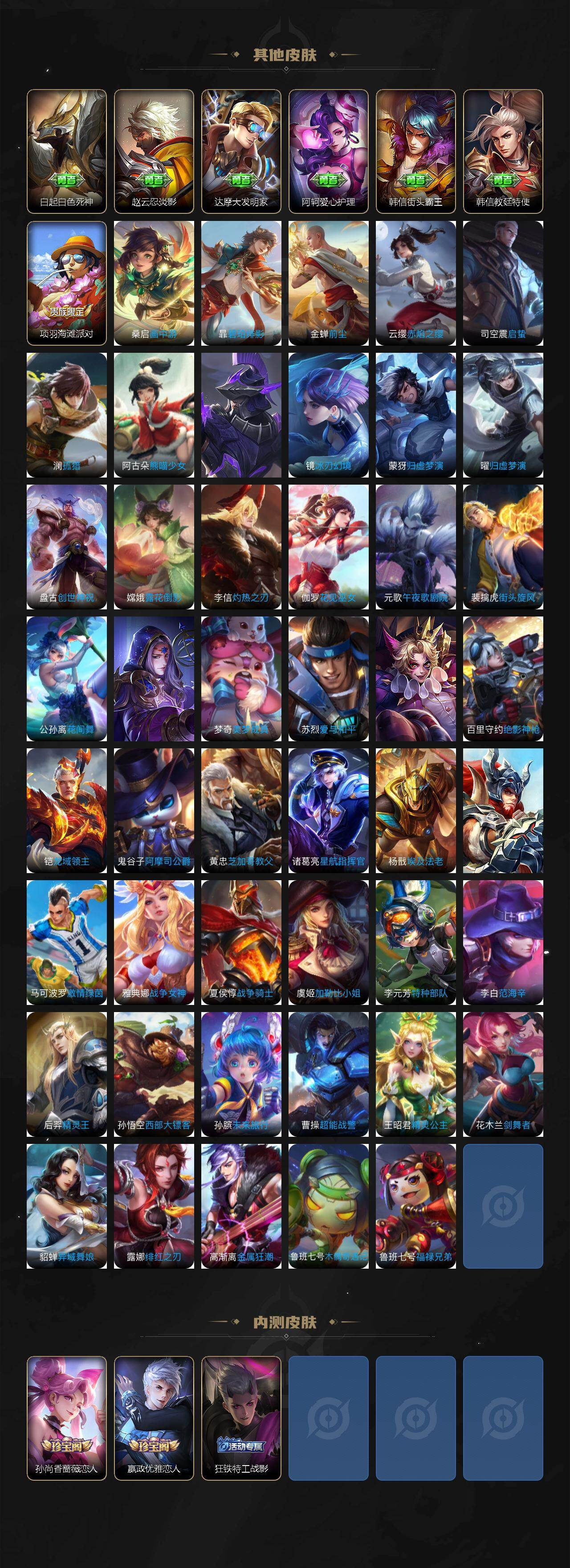 典韦穷奇,狂铁御狮,米莱狄御霄,牛魔御旌,盾山御銮,夏侯惇朔风刀,明世隐疑决卦,老夫子醍醐杖,鬼谷子原初探秘者,狄仁杰万华元夜,程咬金演武夺筹,钟馗驱傩正仪,苏烈千军破阵,马可波罗暗影游猎,弈星混沌棋,达摩沙漠行僧,兰陵王金庭之子,桑启海盐诗旅,裴擒虎擒涛扼浪,鲁班大师探海日志,张良古海寻踪