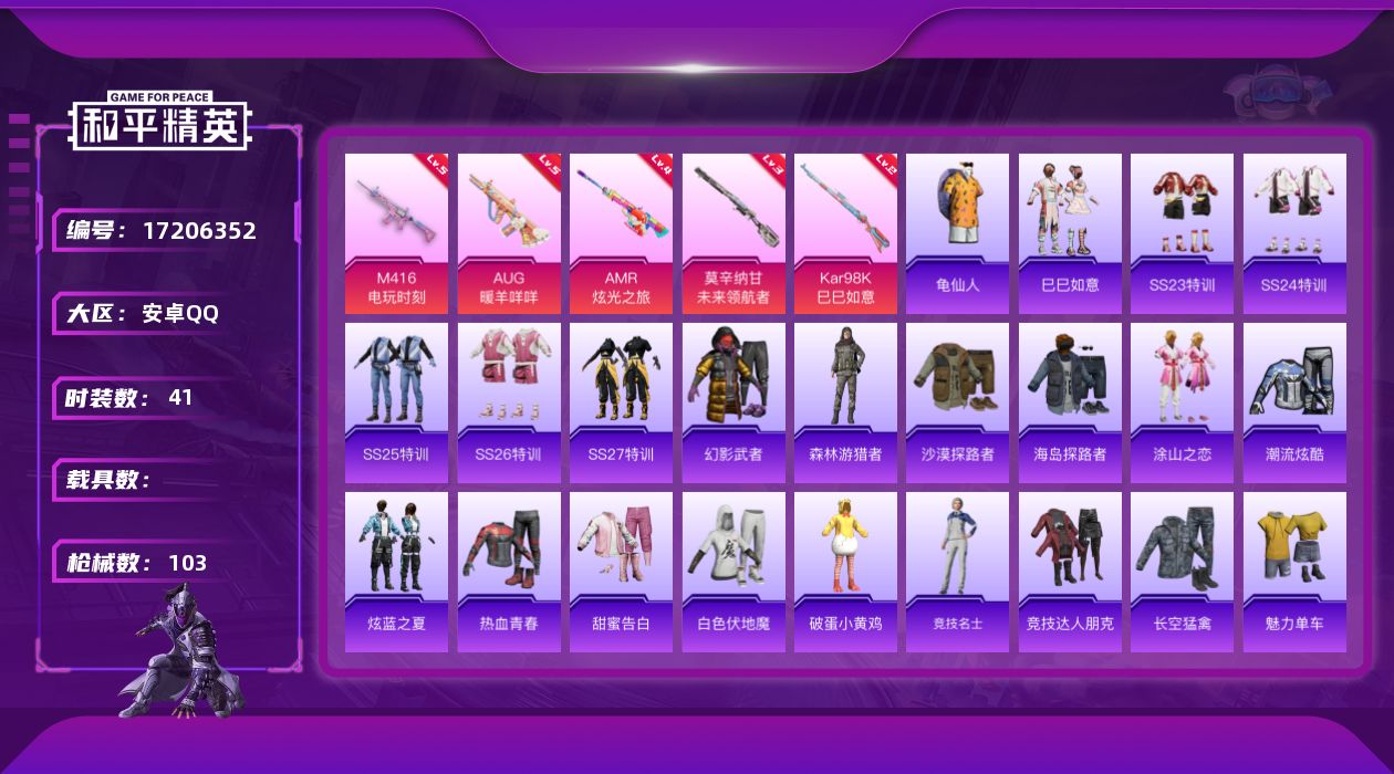 [17206352]【特价出售/店主推荐】安卓 手Q-0粉装-5特效枪-0载具-1粉色飞行器-22387热力值-2王牌印记-41套装-103枪皮