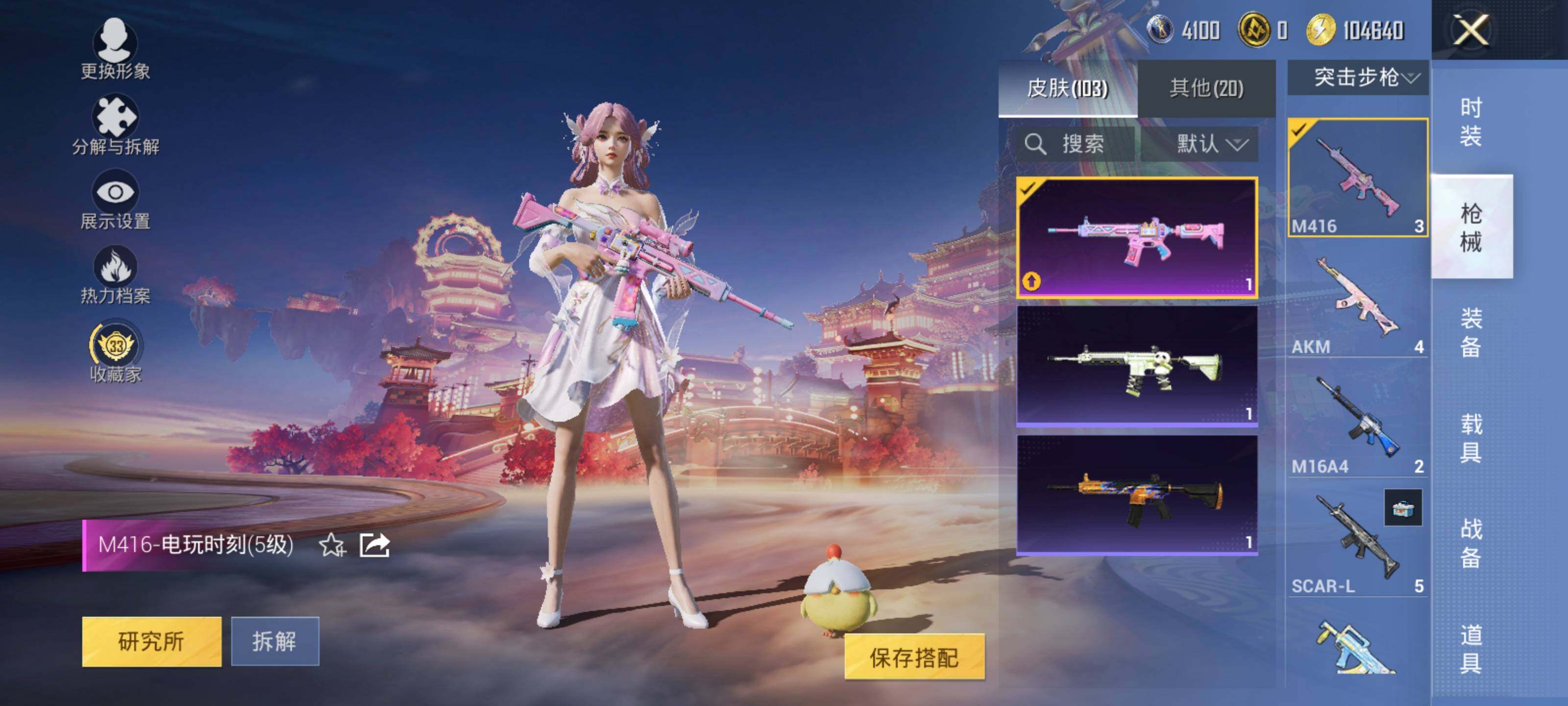 【粉色枪皮等级】:M416-电玩时刻(五级),AUG-暖羊咩咩(五级),Kar98K-巳巳如意(二级),莫辛纳甘-未来领航者(三级),AMR-炫光之旅(四级)