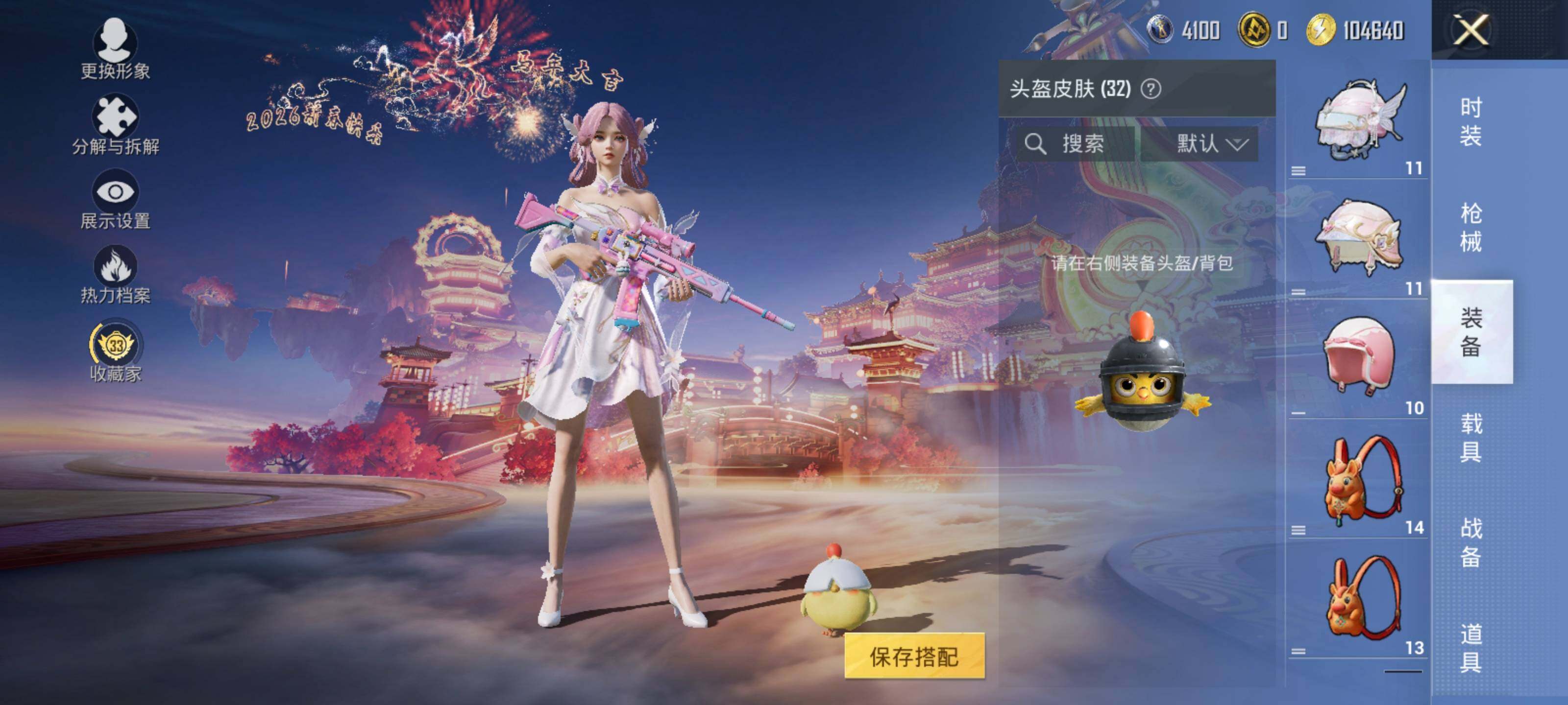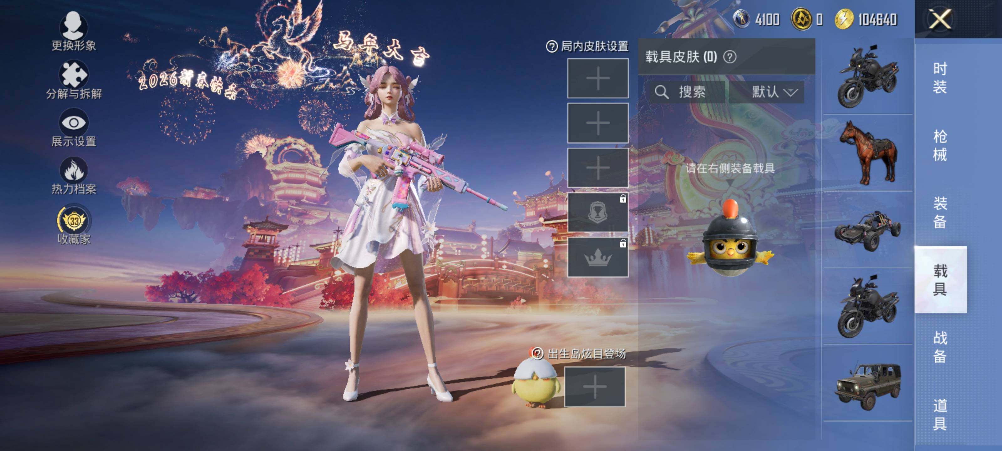 【粉色枪皮】:M416-电玩时刻,AUG-暖羊咩咩,Kar98K-巳巳如意,莫辛纳甘-未来领航者,AMR-炫光之旅