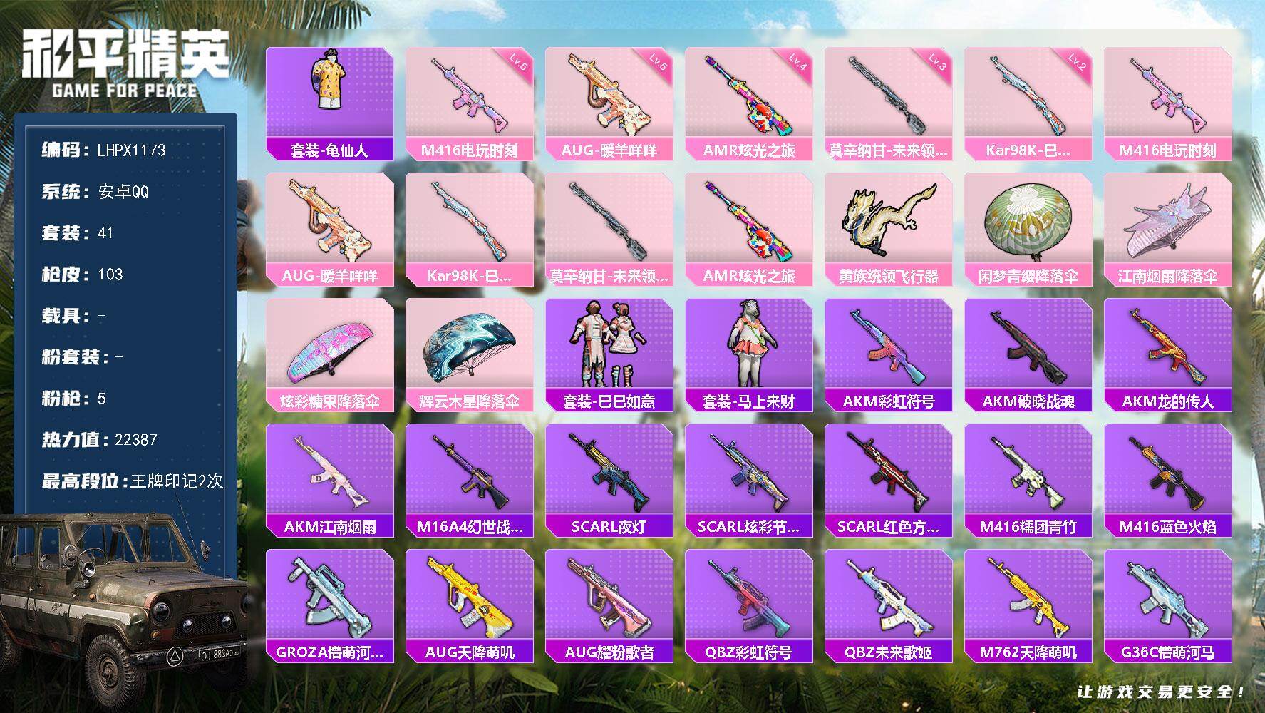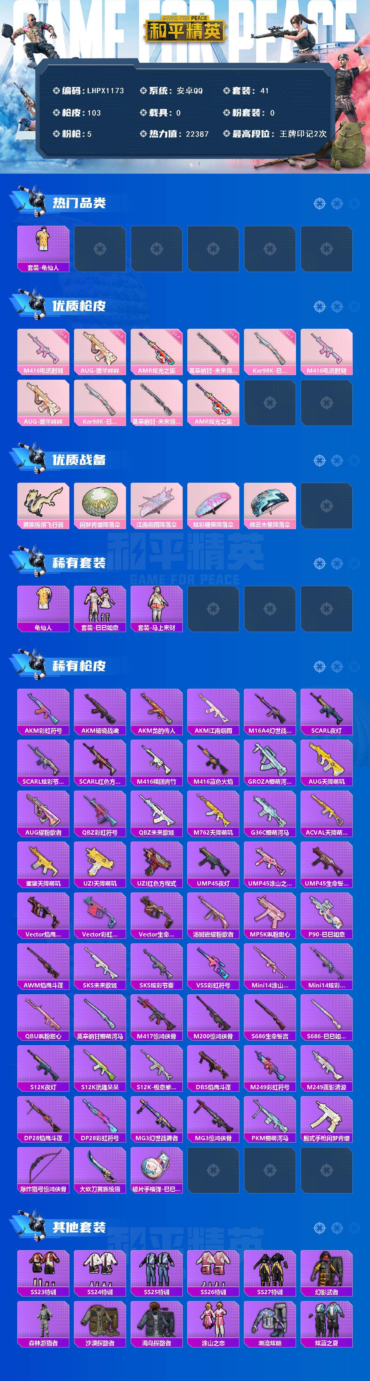 [17206352]【特价出售/店主推荐】安卓 手Q-0粉装-5特效枪-0载具-1粉色飞行器-22387热力值-2王牌印记-41套装-103枪皮 【热门品类】:套装-龟仙人 【粉色枪皮等级】:M416-电玩时刻(五级),AUG-暖羊咩咩(五级),Kar98K-巳巳如意(二级),莫辛纳甘-未来领航者(三级),AMR-炫光之旅(四级) 【粉色枪皮】:M416-电玩时刻,AUG-暖羊咩咩,Kar98K-巳巳如意,莫辛纳甘-未来领航者,AMR-炫光之旅 【粉色飞行器】:黄族统领飞行器 【粉色降落伞】:闲梦青缨降落伞,江南烟雨降落伞,炫彩糖果降落伞,辉云木星降落伞 【稀有套装】:套装-龟仙人,套装-巳巳如意,套装-马上来财 【稀有枪皮】:AUG-冰晶雪宝,AKM-彩虹符号,AKM-江南烟雨,AKM-破晓战魂,AKM-龙的传人,M16A4-幻世战舞者,SCAR-L-夜灯,SCAR-L-炫彩节奏,SCAR-L-红色方程式,M416-糯团青竹,M416-蓝色火焰,GROZA-懵萌河马,AUG-天降萌叽,AUG-耀粉歌者,QBZ-彩虹符号,QBZ-未来歌姬,M762-天降萌叽,G36C-懵萌河马,AC-VAL-天降萌叽,蜜獾-天降萌叽,UZI-天降萌叽,UZI-红色方程式,UMP45-夜灯,UMP45-涂山之恋,UMP45-生命誓言,Vector-焰鹰斗篷,Vector-彩虹符号,Vector-生命誓言,汤姆逊-耀粉歌者,MP5K-飒粉甜心,P90-巳巳如意,AWM-焰鹰斗篷,SKS-未来歌姬,SKS-炫彩节奏,VSS-彩虹符号,Mini14-涂山之恋,Mini14-炫彩节奏,QBU-飒粉甜心,莫辛纳甘-懵萌河马,M417-惊鸿侠骨,M200-惊鸿侠骨,S686-生命誓言,S686-巳巳如意,S12K-玩趣呆呆,S12K-夜灯,S12K-极意拳锋,DBS-焰鹰斗篷,M249-彩虹符号,M249-莲影清波,DP-28-焰鹰斗篷,DP-28-彩虹符号,MG3-幻世战舞者,MG3-惊鸿侠骨,PKM-懵萌河马,蝎式手枪-闲梦青缨,爆炸猎弓-惊鸿侠骨,大砍刀-黄族统领,破片手榴弹-巳巳如意 【其他套装】:套装-SS23特训,套装-SS24特训,套装-SS25特训,套装-SS26特训,套装-SS27特训,套装-幻影武者,套装-森林游猎者,套装-沙漠探路者,套装-海岛探路者,套装-涂山之恋,套装-潮流炫酷,套装-炫