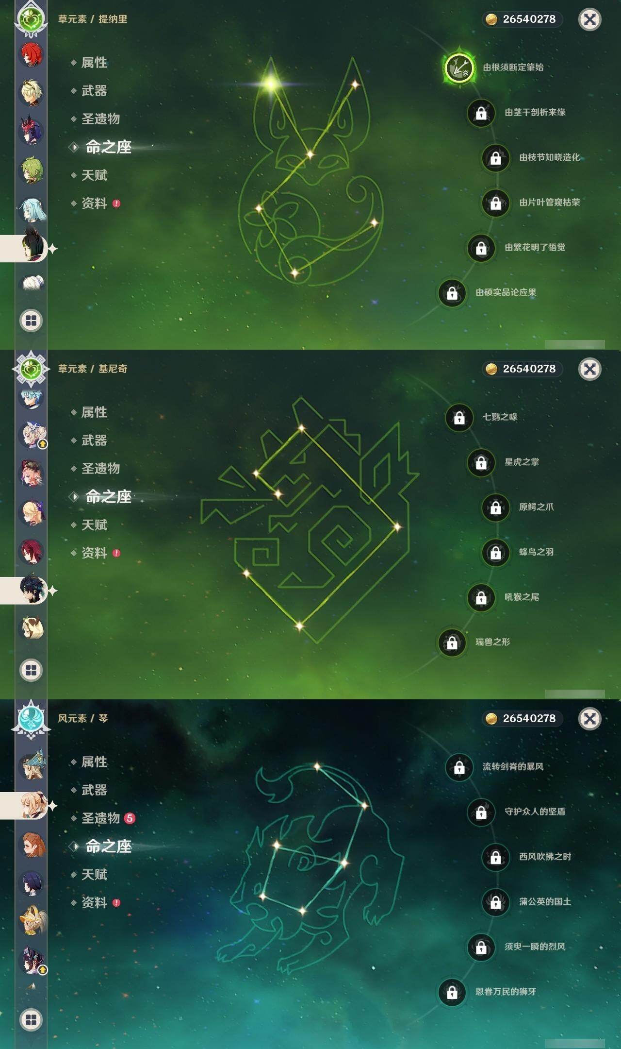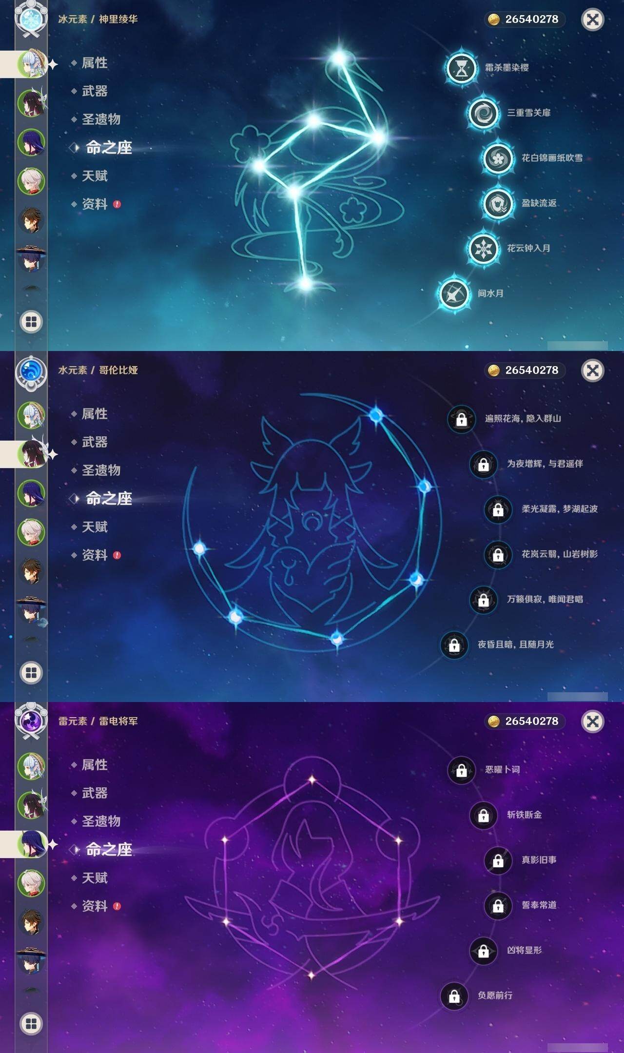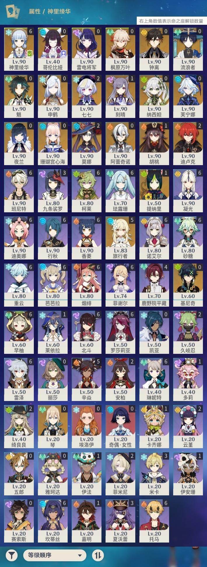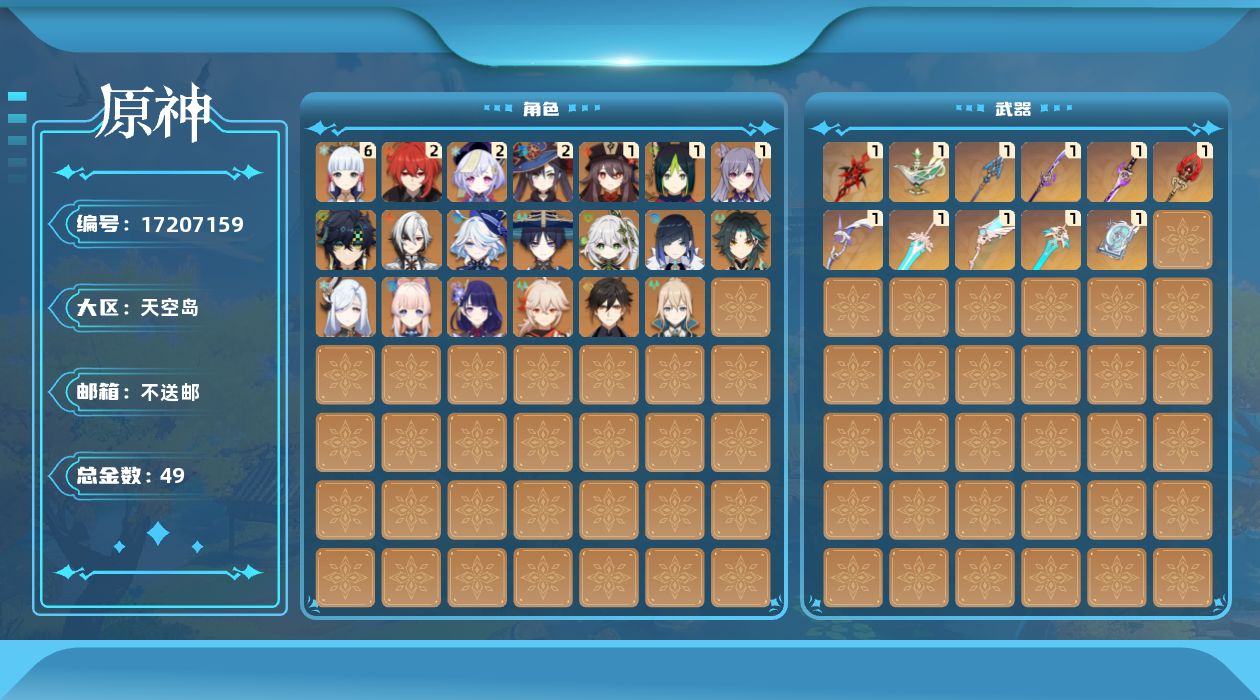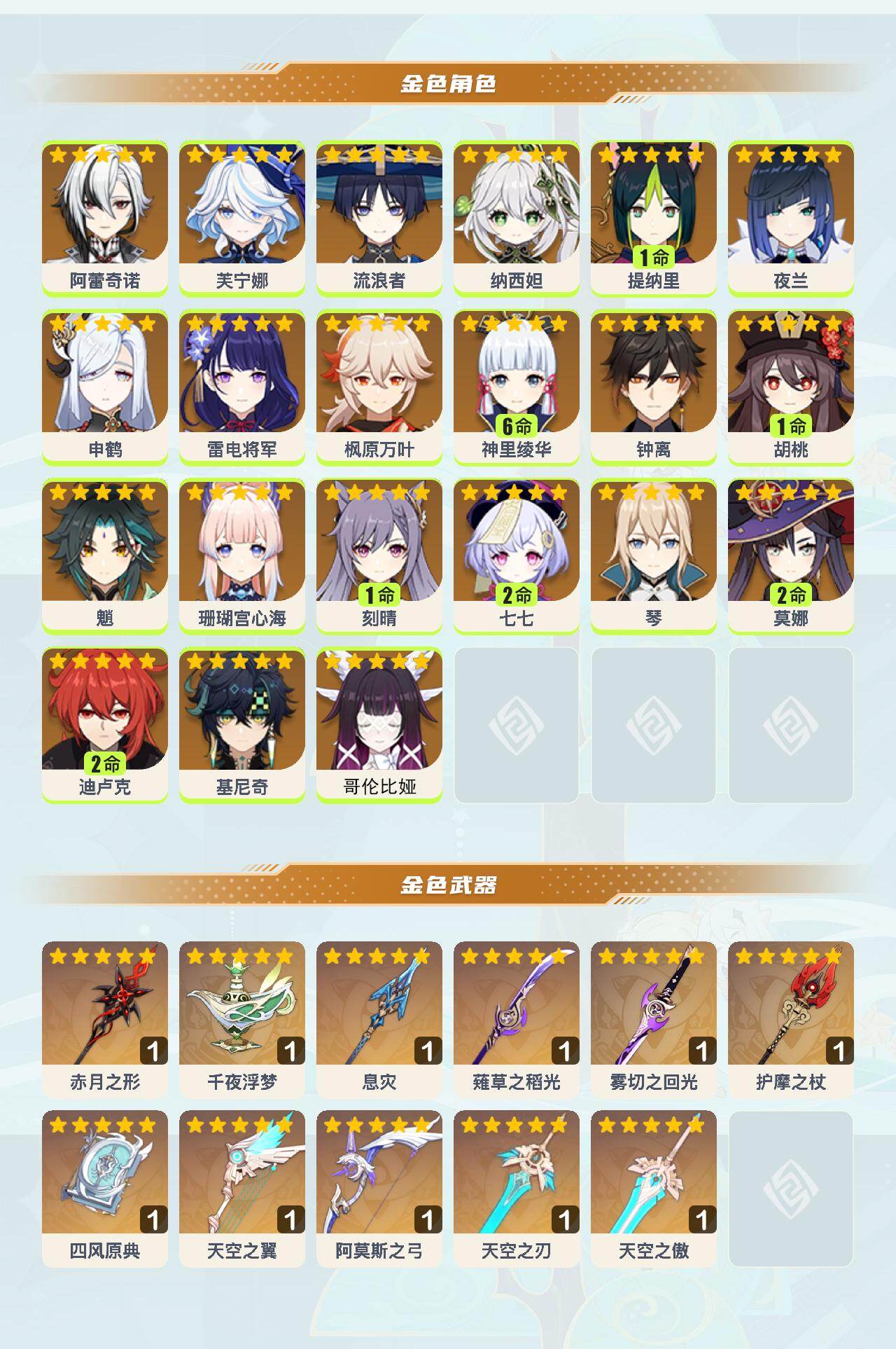 0命阿蕾奇诺,0命芙宁娜,0命流浪者,0命纳西妲,1命提纳里,0命夜兰,0命申鹤,0命雷电将军,0命枫原万叶,满命神里绫华,0命钟离,1命胡桃,0命魈,0命珊瑚宫心海,1命刻晴,2命七七,0命琴,2命莫娜,2命迪卢克,0命基尼奇,0命哥伦比娅,精1赤月之形,精1千夜浮梦,精1息灾,精1薙草之稻光,精1雾切之回光,精1护摩之杖,精1四风原典,精1天空之翼,精1阿莫斯之弓,精1天空之刃,精1天空之傲