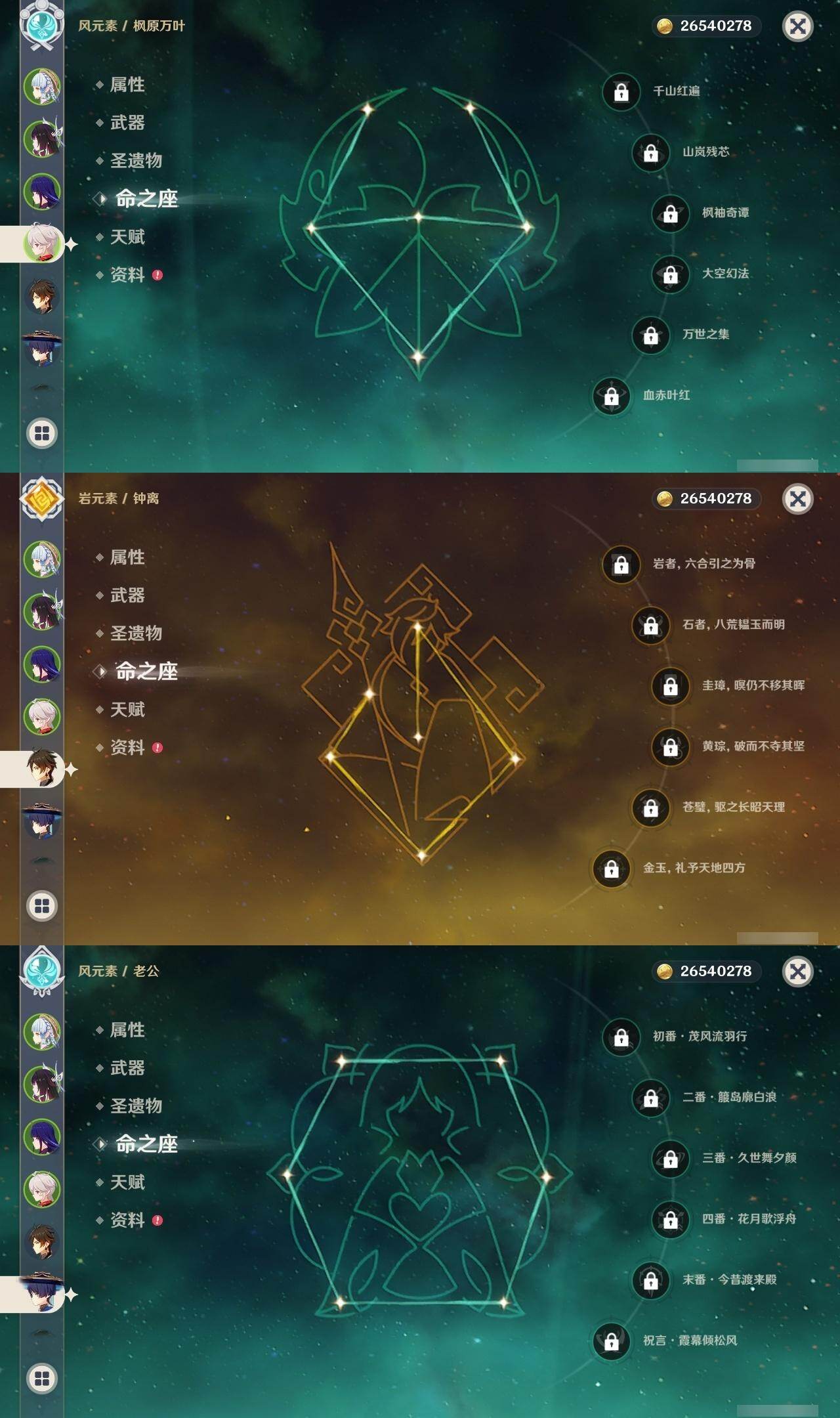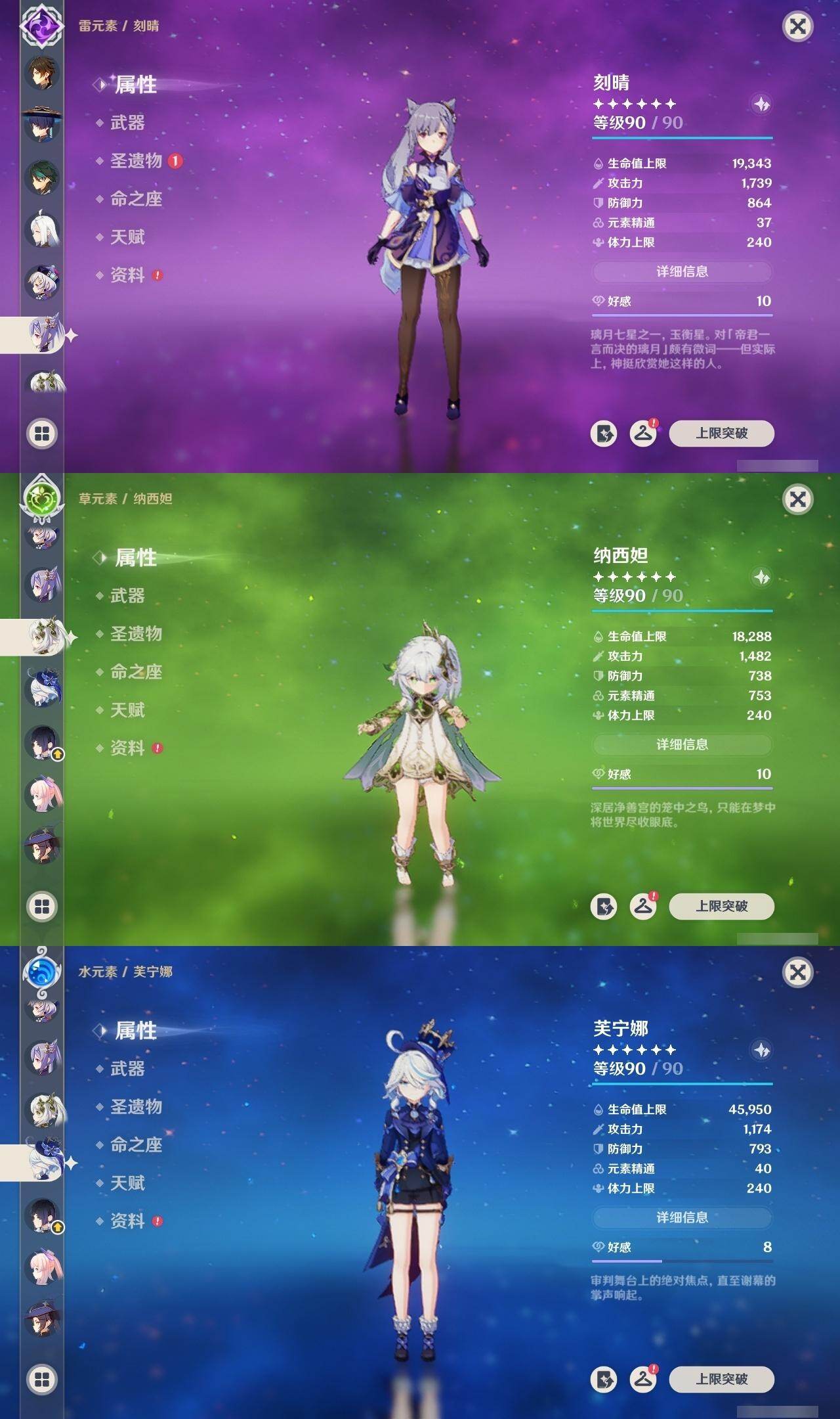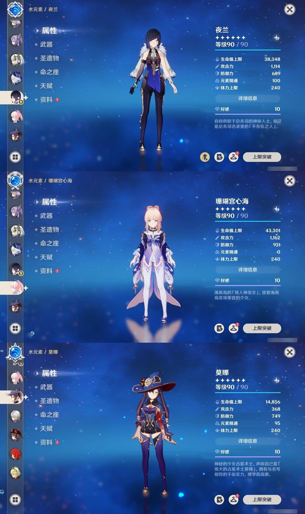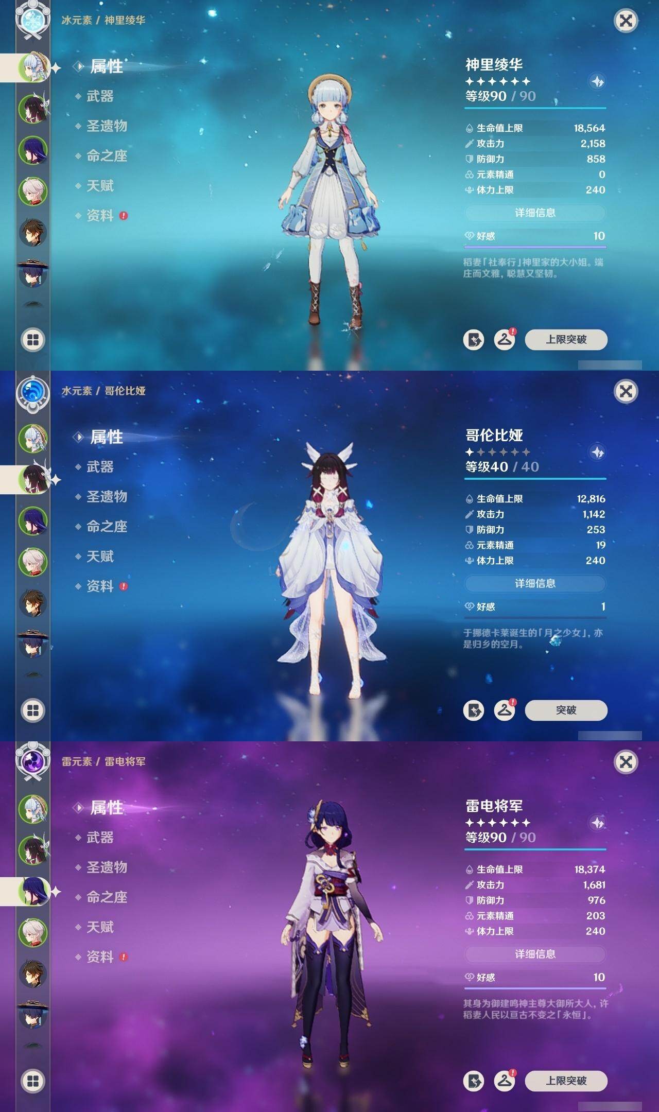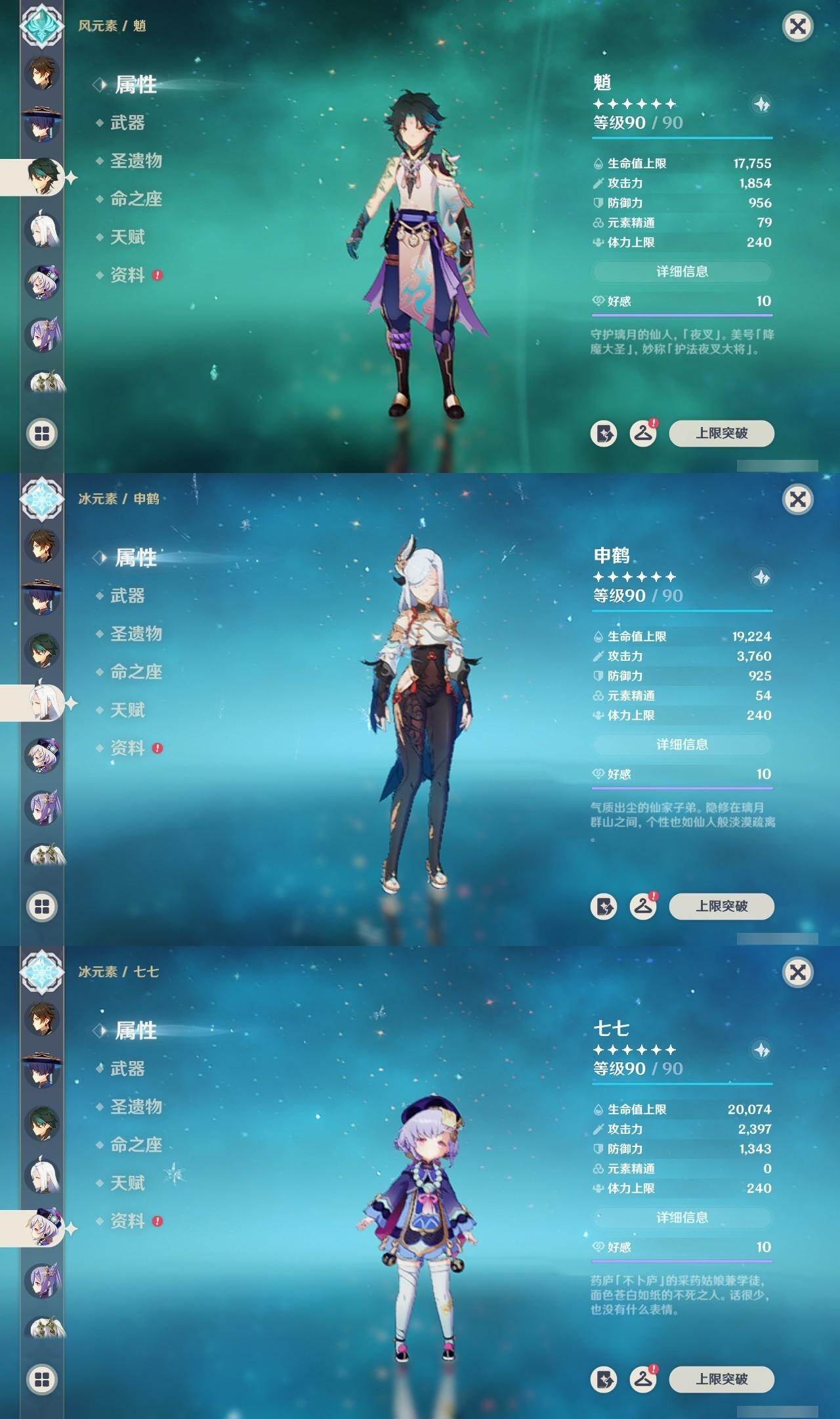 神里凌华,雷电将军,枫原万叶,钟离,魈,申鹤,七七,刻晴,珊瑚宫心海,莫娜,胡桃,迪卢克,琴