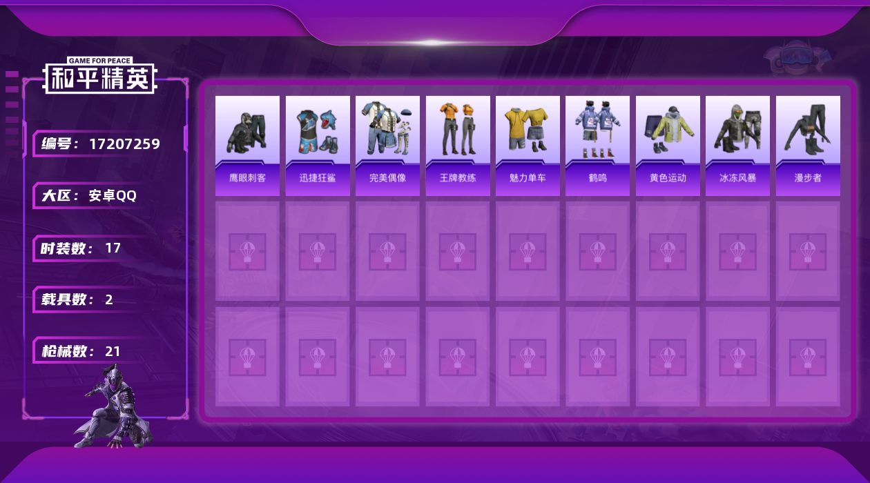 [17207259]安卓 手Q-1粉装-1特效枪-2载具-1粉色飞行器-7857热力值-0王牌印记-17套装-21枪皮