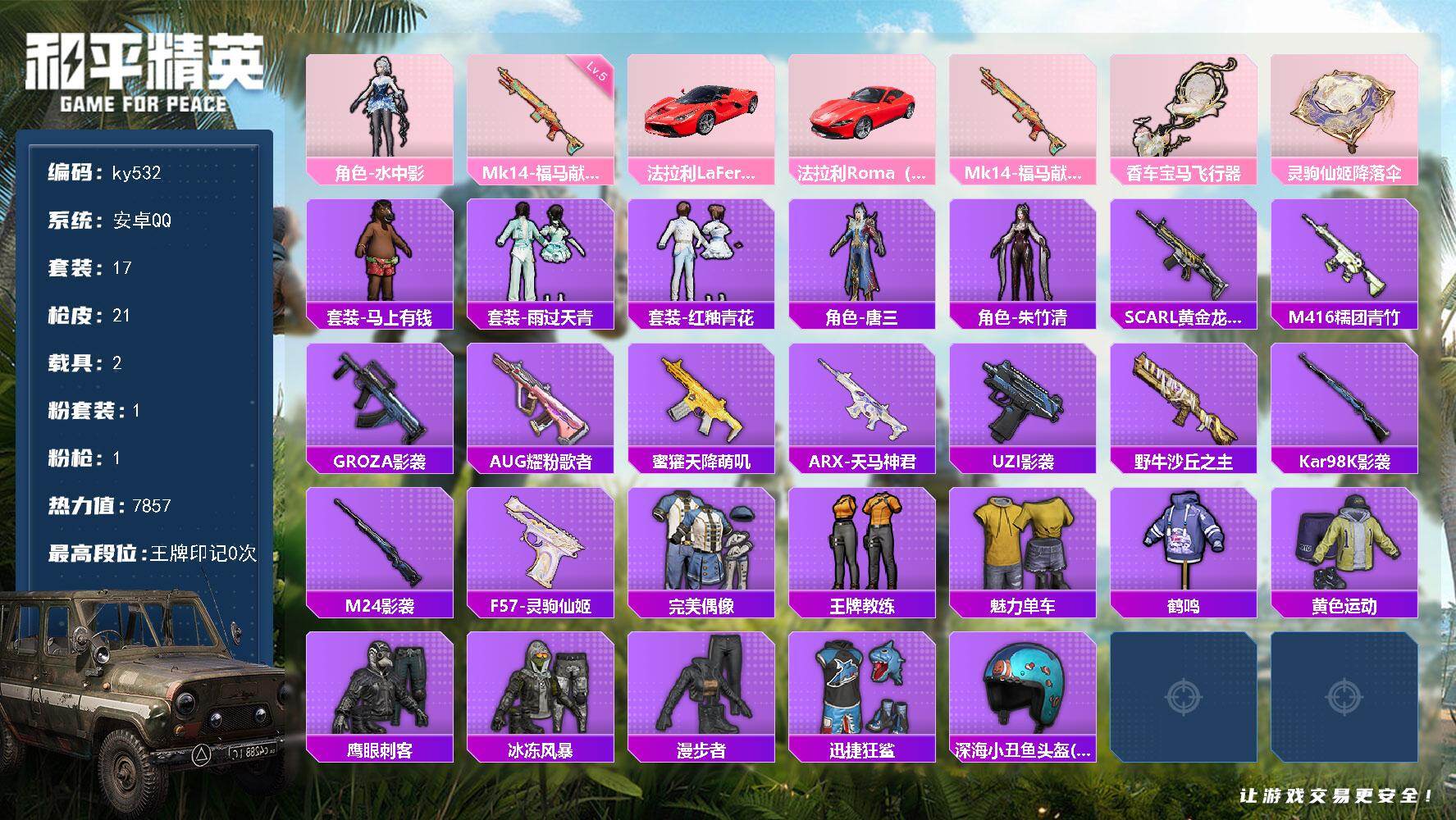[17207259]安卓 手Q-1粉装-1特效枪-2载具-1粉色飞行器-7857热力值-0王牌印记-17套装-21枪皮 【粉色套装】:角色-水中影 【粉色枪皮等级】:Mk14-福马献瑞(五级) 【粉色载具】:法拉利LaFerrari(赛车红),法拉利Roma(赛车红) 【粉色枪皮】:Mk14-福马献瑞 【粉色飞行器】:香车宝马飞行器 【粉色降落伞】:灵驹仙姬降落伞 【稀有套装】:套装-马上有钱,套装-雨过天青,套装-红釉青花,角色-唐三,角色-朱竹清 【稀有枪皮】:SCAR-L-黄金龙骨,M416-糯团青竹,GROZA-影袭,AUG-耀粉歌者,蜜獾-天降萌叽,ARX-天马神君,UZI-影袭,野牛-沙丘之主,Kar98K-影袭,M24-影袭,F57-灵驹仙姬 【其他套装】:套装-完美偶像,套装-王牌教练,套装-魅力单车,套装-鹤鸣,套装-黄色运动,套装-鹰眼刺客,套装-冰冻风暴,套装-漫步者,套装-迅捷狂鲨 【稀有头盔】:深海小丑鱼头盔(1级) 【营地ID】:1048125347