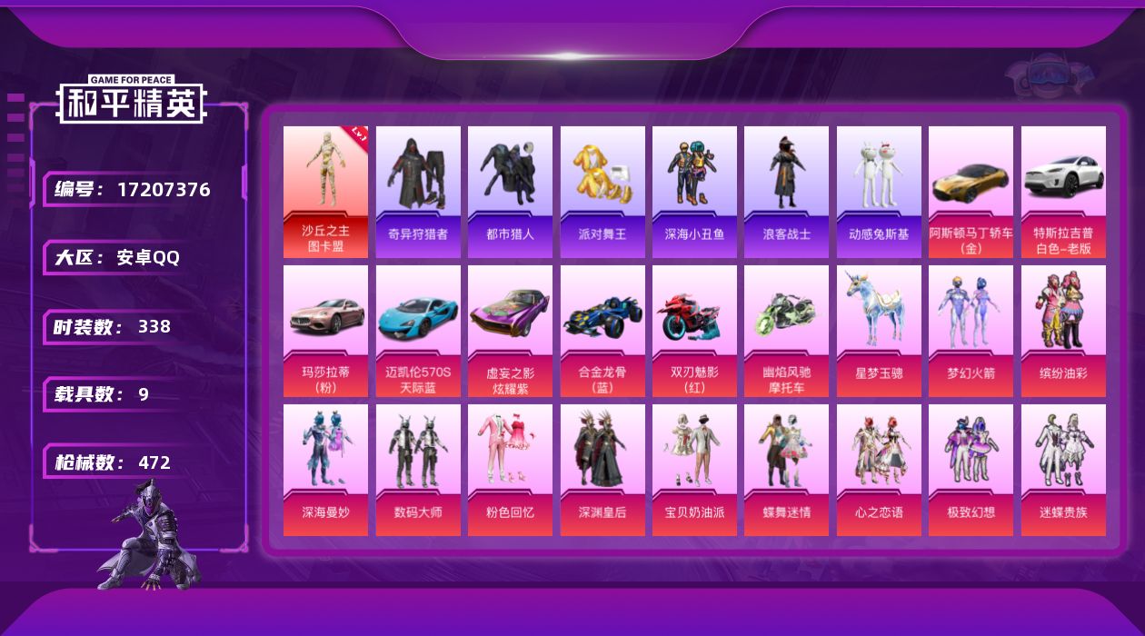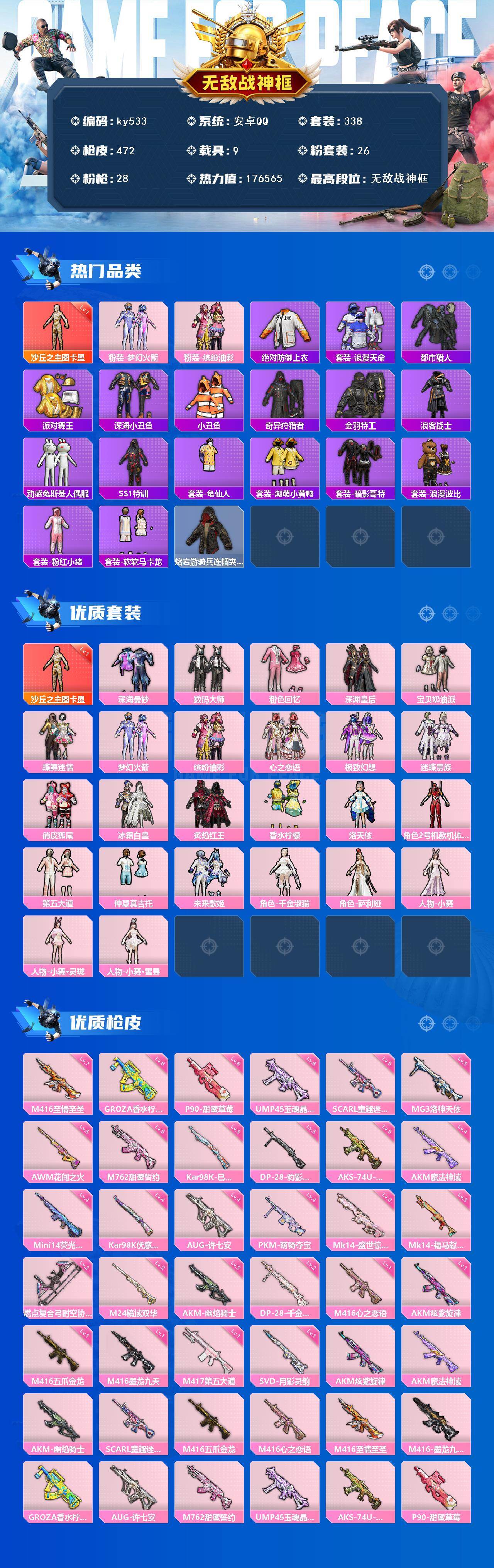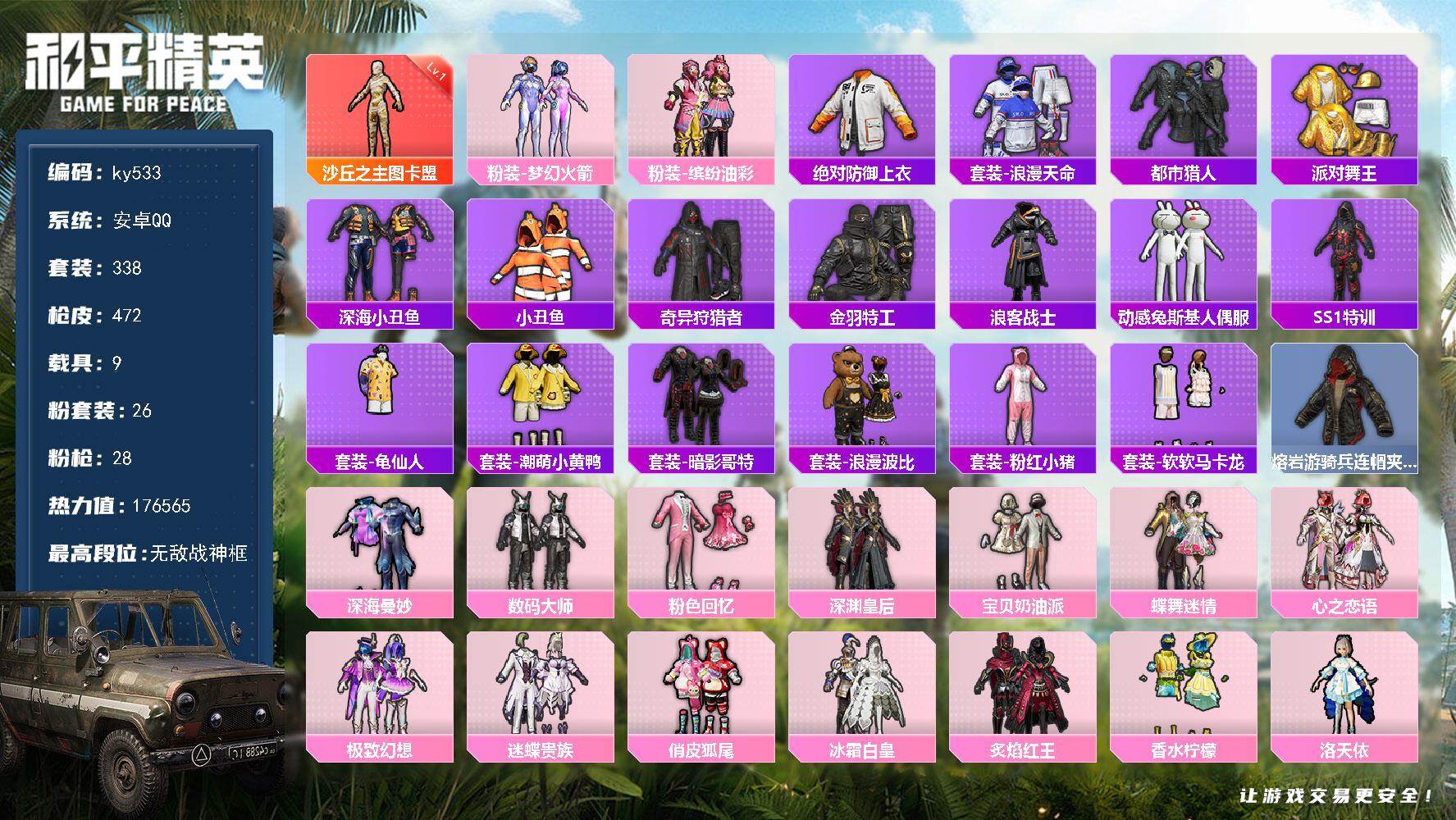 [17207376]安卓 手Q-无敌战神框-1神装-26粉装-28特效枪-9载具-12粉色飞行器-176565热力值-26王牌印记-338套装-472枪皮