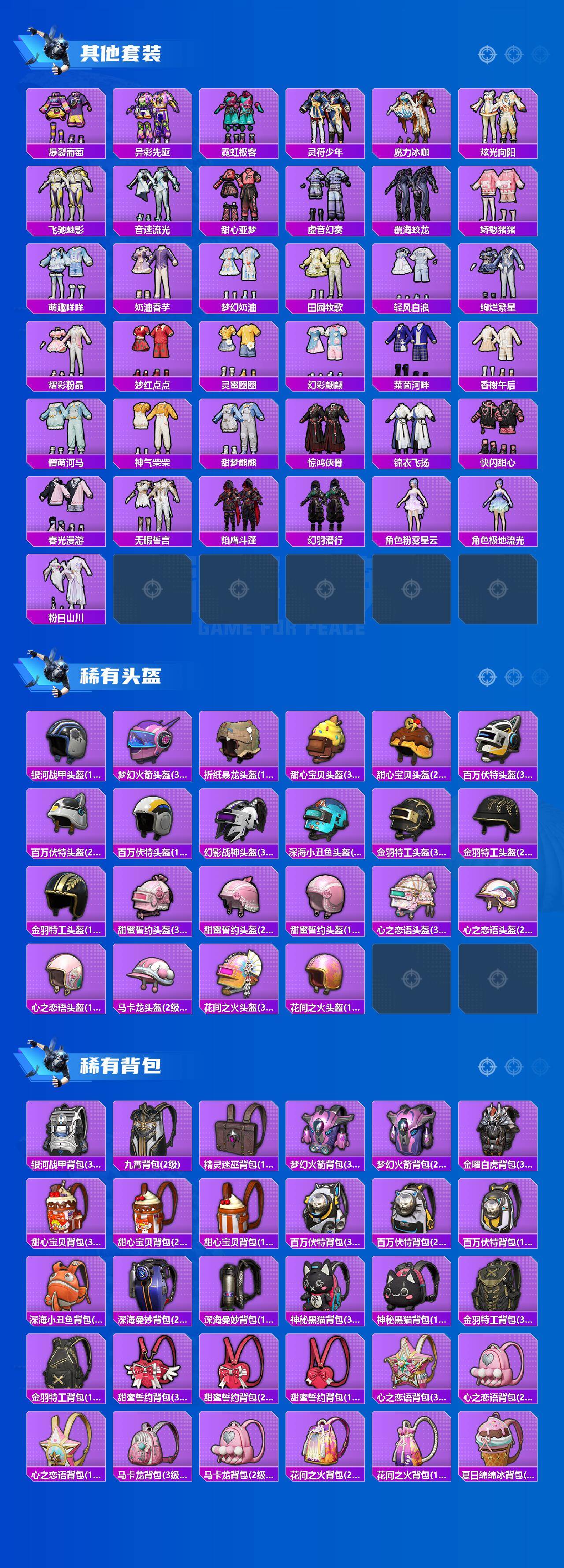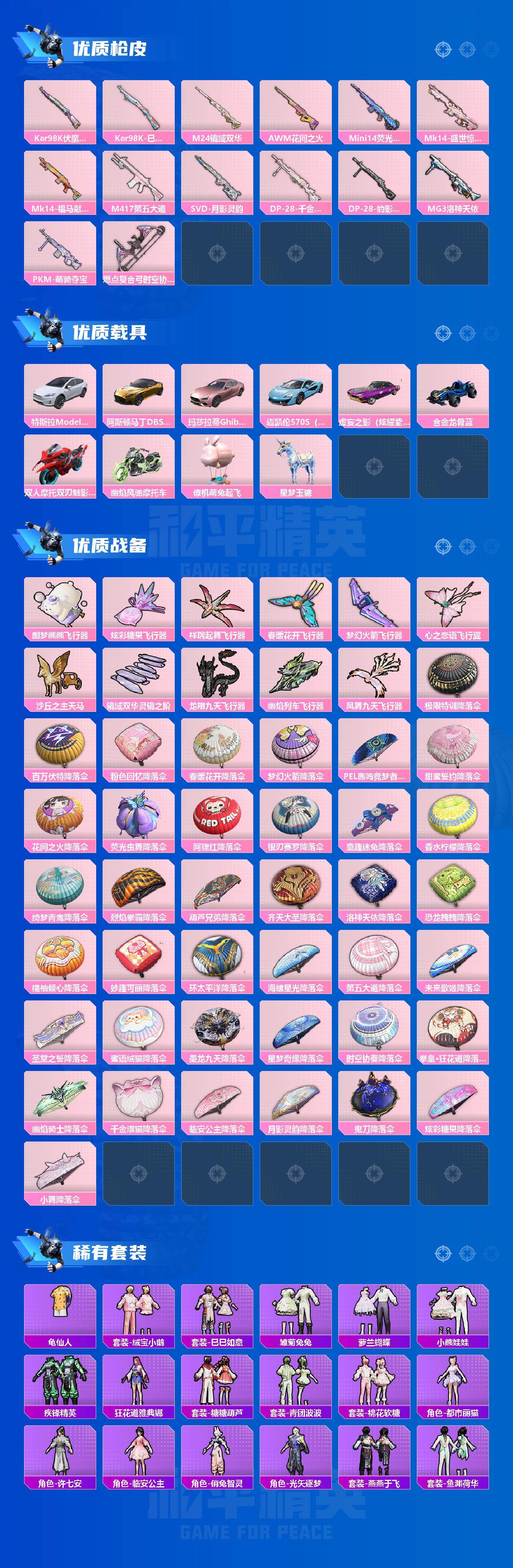 [17207376]安卓 手Q-无敌战神框-1神装-26粉装-28特效枪-9载具-12粉色飞行器-176565热力值-26王牌印记-338套装-472枪皮 【红色神装等级】:沙丘之主-图卡盟(一级) 【红色角色神装】:沙丘之主-图卡盟 【热门品类】:粉装-梦幻火箭,粉装-缤纷油彩,绝对防御上衣,套装-浪漫天命,套装-都市猎人,套装-派对舞王,套装-深海小丑鱼,套装-小丑鱼,套装-奇异狩猎者,套装-金羽特工,套装-浪客战士,套装-动感兔斯基人偶服,套装-SS1特训,套装-龟仙人,套装-潮萌小黄鸭,套装-暗影哥特,套装-浪漫波比,套装-粉红小猪,套装-软软马卡龙,熔岩游骑兵连帽夹克 【粉色套装】:粉装-深海曼妙,粉装-数码大师,粉装-粉色回忆,粉装-深渊皇后,粉装-宝贝奶油派,粉装-蝶舞迷情,粉装-梦幻火箭,粉装-缤纷油彩,粉装-心之恋语,粉装-极致幻想,粉装-迷蝶贵族,粉装-俏皮狐尾,粉装-冰霜白皇,粉装-炙焰红王,粉装-香水柠檬,角色-洛天依,角色-2号机款机体服,粉装-第五大道,粉装-仲夏莫吉托,粉装-未来歌姬,角色-千金淑猫,角色-萨利娅,人物-小舞,人物-小舞·灵珑,人物-小舞·雪昙 【粉色枪皮等级】:AKM-炫紫旋律(一级),AKM-魔法神域(四级),AKM-幽焰骑士(二级),SCAR-L-童趣迷兔(五级),M416-五爪金龙(一级),M416-心之恋语(一级),M416-至情至圣(七级),M416-墨龙九天(一级),GROZA-香水柠檬(六级),AUG-许七安(四级),M762-甜蜜誓约(五级),UMP45-玉魂晶魄(六级),AKS-74U-森灵之息(五级),P90-甜蜜草莓(六级),Kar98K-伏魔团(四级),Kar98K-巳巳如意(五级),M24-镜域双华(二级),AWM-花间之火(五级),Mini14-荧光虫舞(四级),Mk14-盛世惊鸿(三级),Mk14-福马献瑞(三级),M417-第五大道(一级),SVD-月影灵韵(一级),DP-28-千金淑猫(二级),DP-28-豹影疾电(五级),MG3-洛神天依(五级),PKM-萌骑夺宝(四级),燃点复合弓-时空协奏(二级) 【粉色载具】:特斯拉Model X(珍珠白),阿斯顿马丁DBS(金),玛莎拉蒂Ghibli(粉),迈凯伦570S(天际蓝),虚妄之影(炫耀紫),合金龙骨(蓝),双人摩托-双刃魅影(红),幽焰风驰摩托车,