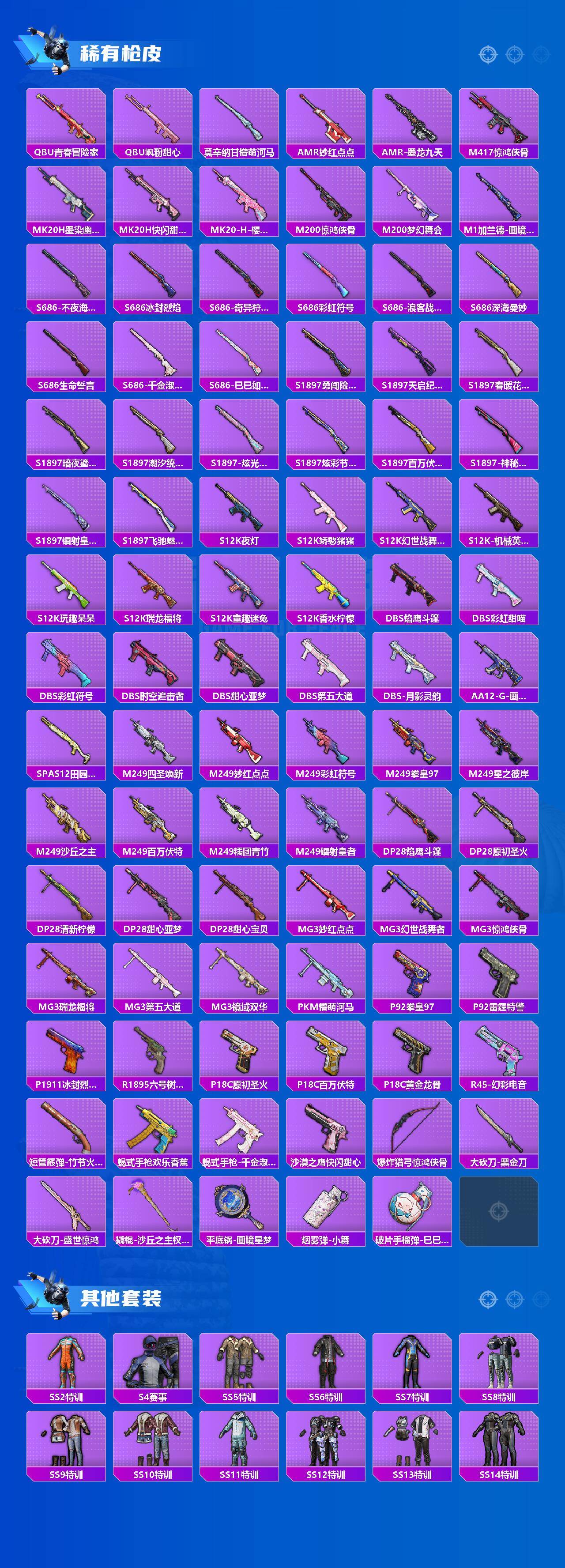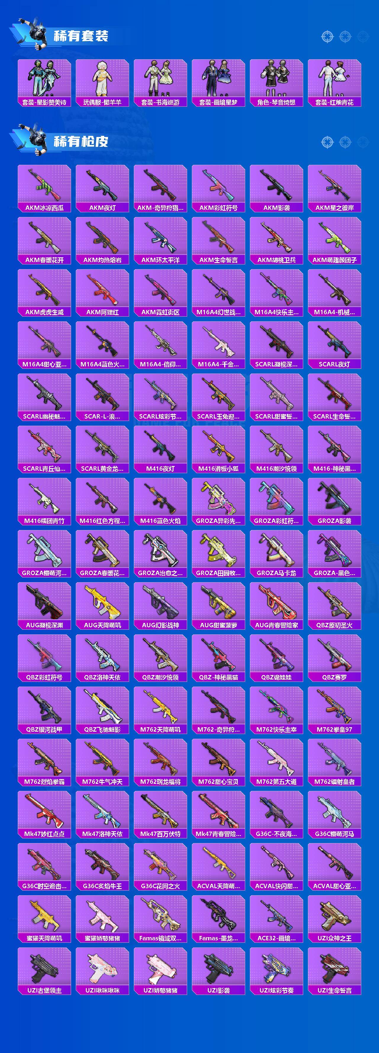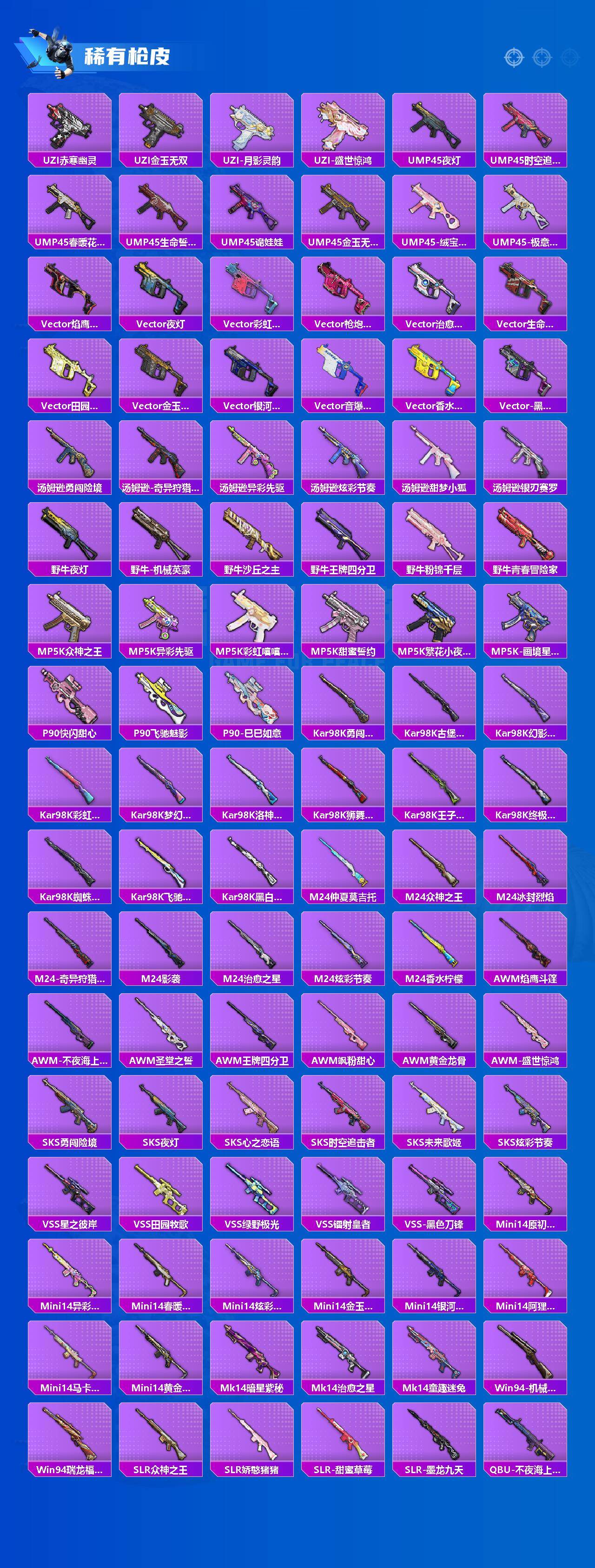 AKM-炫紫旋律,AKM-魔法神域,AKM-幽焰骑士,SCAR-L-童趣迷兔,M416-五爪金龙,M416-心之恋语,M416-至情至圣,M416-墨龙九天,GROZA-香水柠檬,AUG-许七安,M762-甜蜜誓约,UMP45-玉魂晶魄,P90-甜蜜草莓,Kar98K-伏魔团,Kar98K-巳巳如意,M24-镜域双华,AWM-花间之火,Mini14-荧光虫舞,Mk14-盛世惊鸿,M417-第五大道,SVD-月影灵韵,DP-28-千金淑猫,MG3-洛神天依