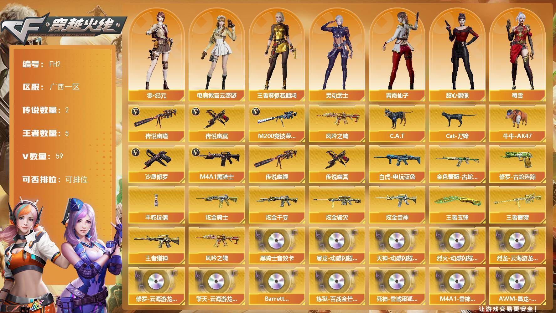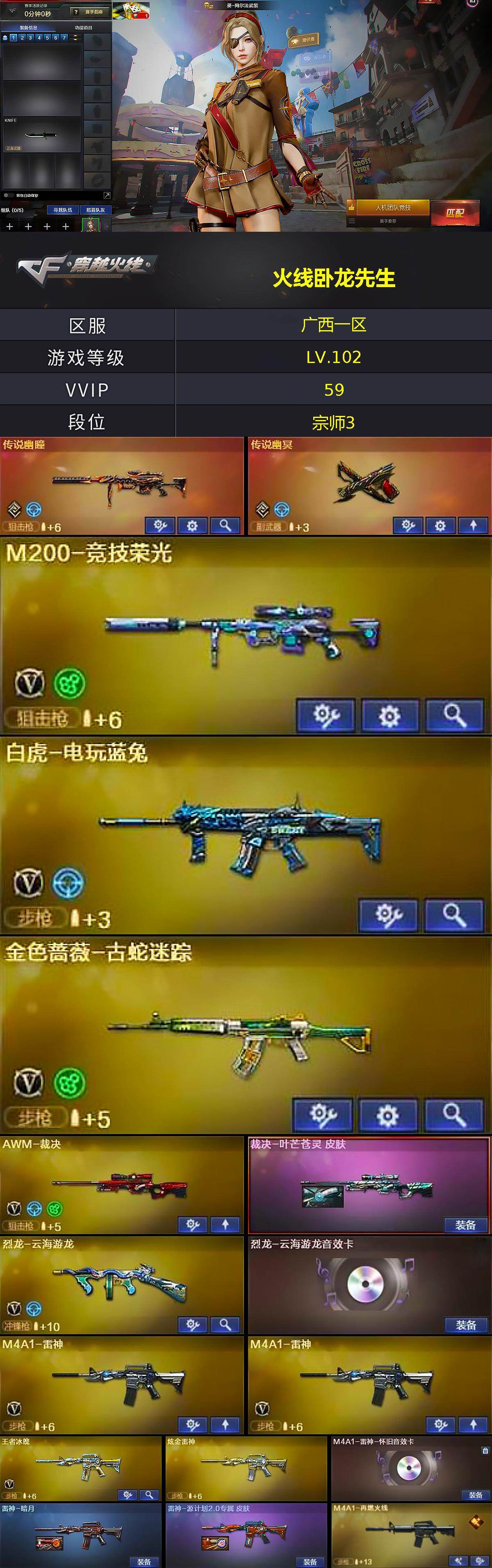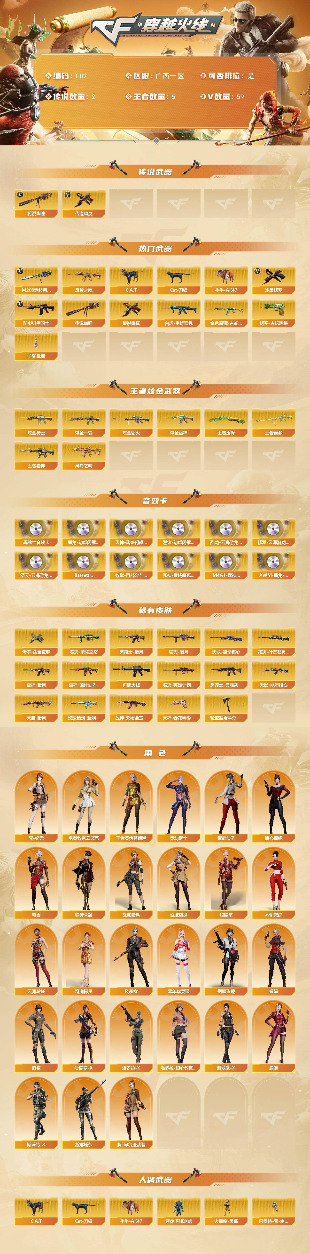 [17207639]广西一区-57V-5王者武器数-4炫金武器数 【传说武器】:传说幽瞳,传说幽冥 【热门武器】:传说幽瞳,传说幽冥,金色蔷薇-古蛇迷踪,修罗-古蛇迷踪,M200-竞技荣光,凤吟之魄,白虎-电玩蓝兔,C.A.T,Cat-刀锋,牛牛-AK47,M4A1-黑骑士,羊驼玩偶,沙鹰-修罗 【王者炫金武器】:王者猎神,凤吟之魄,王者蔷薇,王者玉锋,炫金骑士,炫金千变,炫金雷神,炫金毁灭 【音效卡】:屠龙-动感闪耀 音效卡,天神-动感闪耀 音效卡,烈火-动感闪耀 音效卡,烈龙-云海游龙音效卡,修罗-云海游龙音效卡,擎天-云海游龙音效卡,M4A1-黑骑士音效卡,Barrett-碧霄极光音效卡,炼狱-百战金芒-庆典舞曲音效卡,死神-雪域霜狐-怀旧音效卡,M4A1-雷神-怀旧音效卡,AWM-昌龙-怀旧音效卡 【皮肤】:裁决-叶芒苍灵 皮肤,雷神-暗月,雷神-源计划2.0专属 皮肤,M4A1-再燃火线,毁灭-暗月,毁灭-荣耀之怒,毁灭-英雄计划 皮肤,黑骑士-暗月,黑骑士-典雅胡桃 皮肤,无影-能量核心,天启-暗月,玫瑰精灵-蓝调梦幻 皮肤,战神-紫绶金章皮肤,天龙-能量核心,修罗耀金皮肤,天神-春花弄影 皮肤,轻型军用手斧-再燃火线 【角色】:电竞教官-云悠悠,零·纪元,战地猎狐,王者葵-惊若翩鸿,雪域霜狐,蛇隐宗,奇洋探员,乔伊教练,云海玲珑,葵-阿尔法武装,风暴女,嘉年华灵狐,荆棘玫瑰,娟娟,灵动武士,麻雀,曼陀罗-X,潘多拉-X,潘多拉-甜心教官,潜龙队-X,青霞仙子,蛇姬,斯沃特-X,甜心偶像,蜀雪,铁骑荣耀,新娜塔莎 【人偶武器】:火麒麟-灵狐,迷你钢铁终结者,巴雷特-零-水下丽影,C.A.T,Cat-刀锋,牛牛-AK47,迷你深渊冰龙,迷你裂空之翼,迷你牛魔王,迷你波特博士,迷你曼提柯尔,夺魂,迷你牛牛*2,迷你火种,生化手雷-机甲核心*3,深渊终结者手雷,烟雾弹-迷雾幽灵,迷你巨石泰坦-魔花研究所 【暴走生化】:超级对讲机 【挑战大师】:神圣爆裂者III,冰龙粉碎者-白马银枪,激光毁灭者III-白马银枪*2,VEPR-12-金魔,激光毁灭者III,机甲撕裂者III,试炼破坏者III*2,KAC-圣炎切割者III,神圣爆裂者-末日III,阐释者III 【英雄级武器】:AK47-火麒麟*2,M4A1-雷神*2,M4A1-黑骑士,AK12-天启*2,QBZ03-天罚,无影-神兵