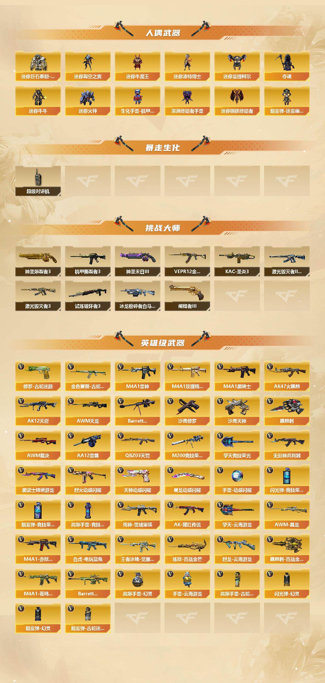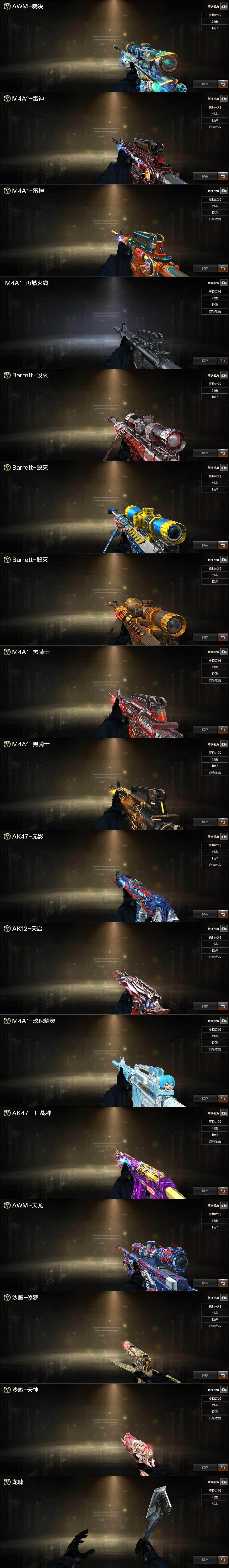 【英雄级武器】:AK47-火麒麟*2,M4A1-雷神*2,M4A1-黑骑士,AK12-天启*2,QBZ03-天罚,无影-神兵