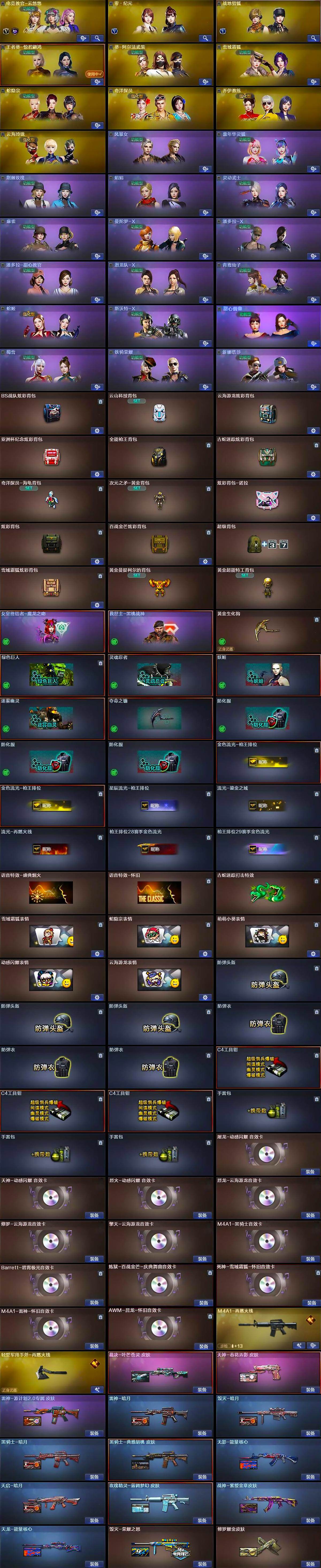 - [14665952]云南一区-26V-2王者-0炫金 【传说武器】:传说灵眸 【热门武器】:传说灵眸,M4A1-青龙,M200-幻神,金色蔷薇-古蛇迷踪,修罗-古蛇迷踪 【王者炫金武器】:王者芳薇 【皮肤】:裁决-流光秘银,毁灭-暗月 【角色】:瞳,隼,战地猎狐,蛇隐宗,乔伊教练,修道士,娟娟,兰-新年限定,灵狐者-七夕宝贝,龙儿,曼陀罗-X,蛇姬,斯沃特-X,蜀雪,兔囡囡 【人偶武器】:生化手雷-机甲核心,灵狐娃娃手雷 【挑战大师】:激光毁灭者III-白马银枪,激光毁灭者III 【英雄级武器】:AK47-火麒麟,M4A1-雷神,AK47-黑鲨,M4A1-青龙,黑武士-锦绣游龙,金色蔷薇-古蛇迷踪,Barrett-毁灭,AWM-裁决,M200-幻神,王者星神-觉醒版,修罗-古蛇迷踪,屠龙,擎天,麒麟刺,丛林匕首-玄豹,高爆手雷-云龙,高爆手雷-古蛇迷踪,高爆手雷-玄豹*2,闪光弹-云龙*2,闪光弹-玄豹,烟雾弹-云龙,烟雾弹-古蛇迷踪,烟雾弹-玄豹,M4A1-赤狱骑士,Barrett-碧霄极光 【道具】:BS战队炫彩背包,CFS限定背包,云山科技背包,亚洲杯纪念炫彩背包,古蛇迷踪炫彩背包,女皇终结者-背包,超级背包,女皇终结者-魔龙之吻,救世主-黑桃战神,绿色巨人,灵魂忍者*2,变异宝贝,迷雾幽灵,生化弹匣,夺命之镰,防化服*3,星辰流光-枪王排位,巅峰赛先锋-金色流光,流光-鎏金之域,流光-再燃火线,枪王排位28赛季金色流光,枪王排位29赛季金色流光,古蛇迷踪打击特效,蛇隐宗表情,EP战队名片,EP战队喷图,EP战队击杀图标,C4-红龙,C4-再燃火线,防弹头盔*5,防弹衣*5,C4工具钳*5,手雷包*5 【特殊枪械】: