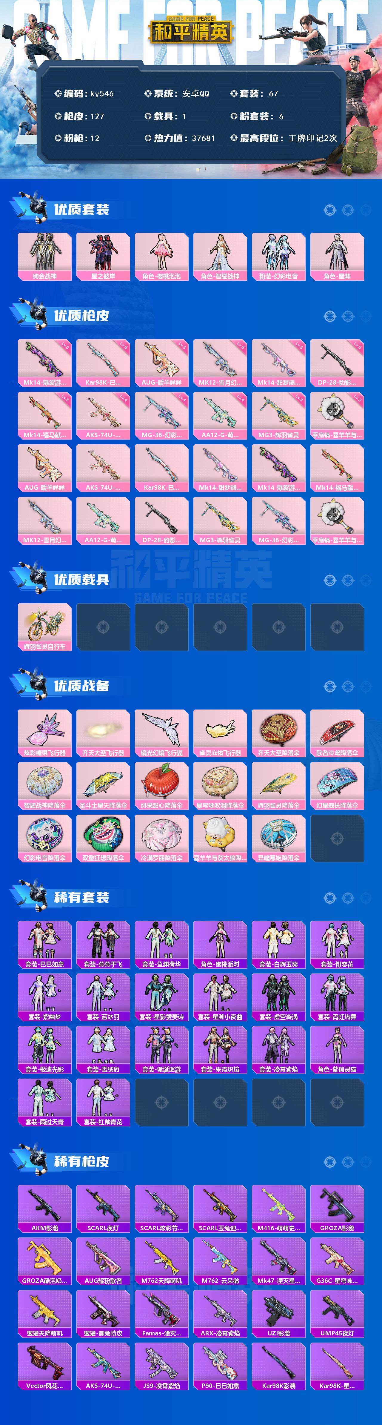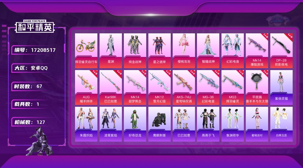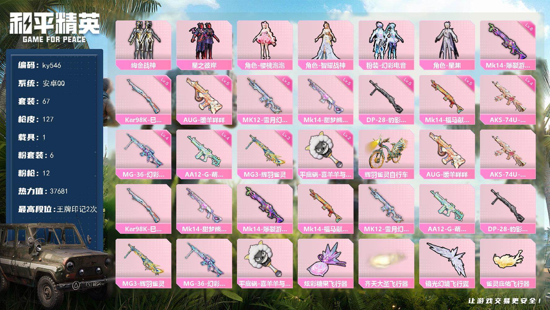 [17208517]安卓 手Q-6粉装-12特效枪-1载具-4粉色飞行器-37681热力值-2王牌印记-67套装-127枪皮 【粉色套装】:粉装-绚金战神,粉装-星之彼岸,角色-樱桃泡泡,角色-智耀战神,粉装-幻彩电音,角色-星渊 【粉色枪皮等级】:AUG-暖羊咩咩(五级),AKS-74U-星穹咏叹调(四级),Kar98K-巳巳如意(五级),Mk14-甜梦熊击(五级),Mk14-爆裂游戏(六级),Mk14-福马献瑞(五级),MK12-雪月幻音(五级),AA12-G-萌骑幻想(四级),DP-28-豹影疾电(五级),MG3-辉羽雀灵(三级),MG-36-幻彩电音(四级),平底锅-喜羊羊与灰太狼(二级) 【粉色载具】:辉羽雀灵自行车 【粉色枪皮】:AUG-暖羊咩咩,AKS-74U-星穹咏叹调,Kar98K-巳巳如意,Mk14-甜梦熊击,Mk14-爆裂游戏,Mk14-福马献瑞,MK12-雪月幻音,AA12-G-萌骑幻想,DP-28-豹影疾电,MG3-辉羽雀灵,MG-36-幻彩电音,平底锅-喜羊羊与灰太狼 【粉色飞行器】:炫彩糖果飞行器,齐天大圣飞行器,镜光幻境飞行翼,雀灵庇佑飞行器 【粉色降落伞】:齐天大圣降落伞,歌者泠鸢降落伞,智耀战神降落伞,圣斗士星矢降落伞,绯果甜心降落伞,星穹咏叹调降落伞,辉羽雀灵降落伞,幻星舰长降落伞,幻彩电音降落伞,双重狂想降落伞,冷漠罗丽降落伞,喜羊羊与灰太狼降落伞,异瞳寒姬降落伞 【稀有套装】:套装-巳巳如意,套装-雪国风尚,套装-燕燕于飞,套装-鱼渊荷华,角色-蜜桃派对,套装-白辉玉蕊,套装-粉恋花,套装-紫幽梦,套装-蓝冰羽,套装-星影赞美诗,套装-星渊小夜曲,套装-虚空漩涡,套装-霓虹热舞,套装-极速光影,套装-雪绒豹,套装-诡诞巡游,套装-朱霞炽焰,套装-凌霄紫焰,角色-紫俏灵猫,套装-雨过天青,套装-红釉青花 【稀有枪皮】:AKM-影袭,SCAR-L-夜灯,SCAR-L-炫彩节奏,SCAR-L-玉兔迎春,M416-萌萌史莱姆,GROZA-影袭,GROZA-酷泡奶龙,AUG-耀粉歌者,M762-天降萌叽,M762-云朵鹅,Mk47-湮灭星辰,G36C-星穹咏叹调,蜜獾-天降萌叽,蜜獾-御兔特攻,Famas-湮灭星辰,ARX-凌霄紫焰,UZI-影袭,UMP45-夜灯,Vector-风花雪月,AKS-74U-辉羽雀灵,JS9-凌霄紫焰,P90-巳巳如意,K