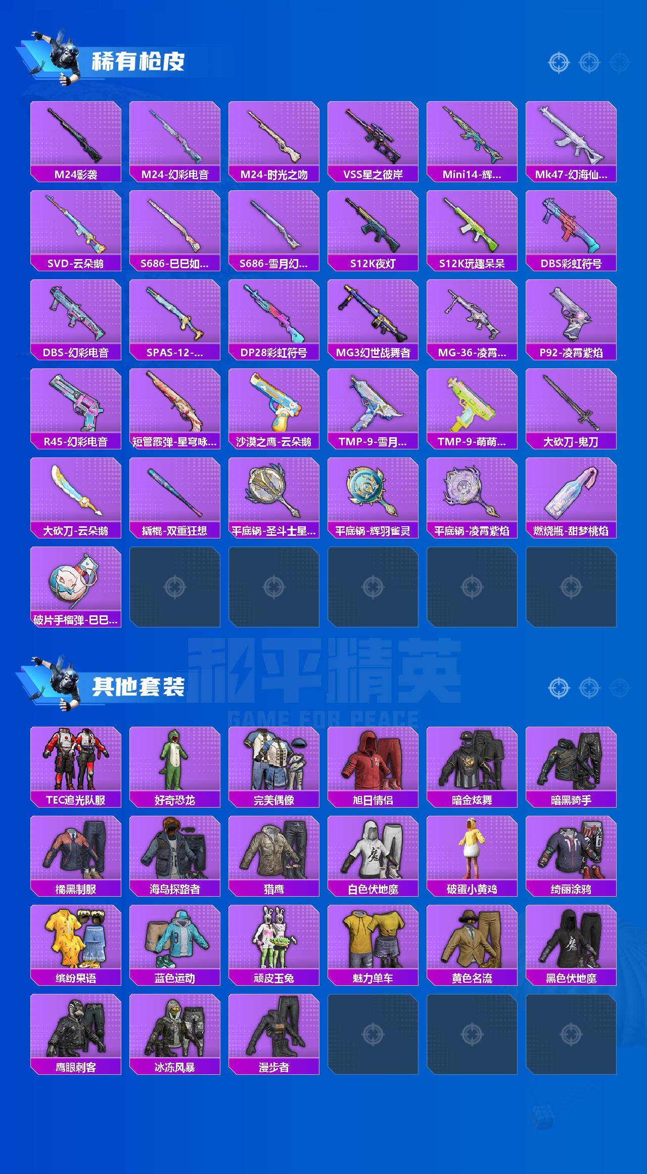 【稀有枪皮】:AKM-影袭,SCAR-L-夜灯,SCAR-L-炫彩节奏,SCAR-L-玉兔迎春,M416-萌萌史莱姆,GROZA-影袭,GROZA-酷泡奶龙,AUG-耀粉歌者,M762-天降萌叽,M762-云朵鹅,Mk47-湮灭星辰,G36C-星穹咏叹调,蜜獾-天降萌叽,蜜獾-御兔特攻,Famas-湮灭星辰,ARX-凌霄紫焰,UZI-影袭,UMP45-夜灯,Vector-风花雪月,AKS-74U-辉羽雀灵,JS9-凌霄紫焰,P90-巳巳如意,K