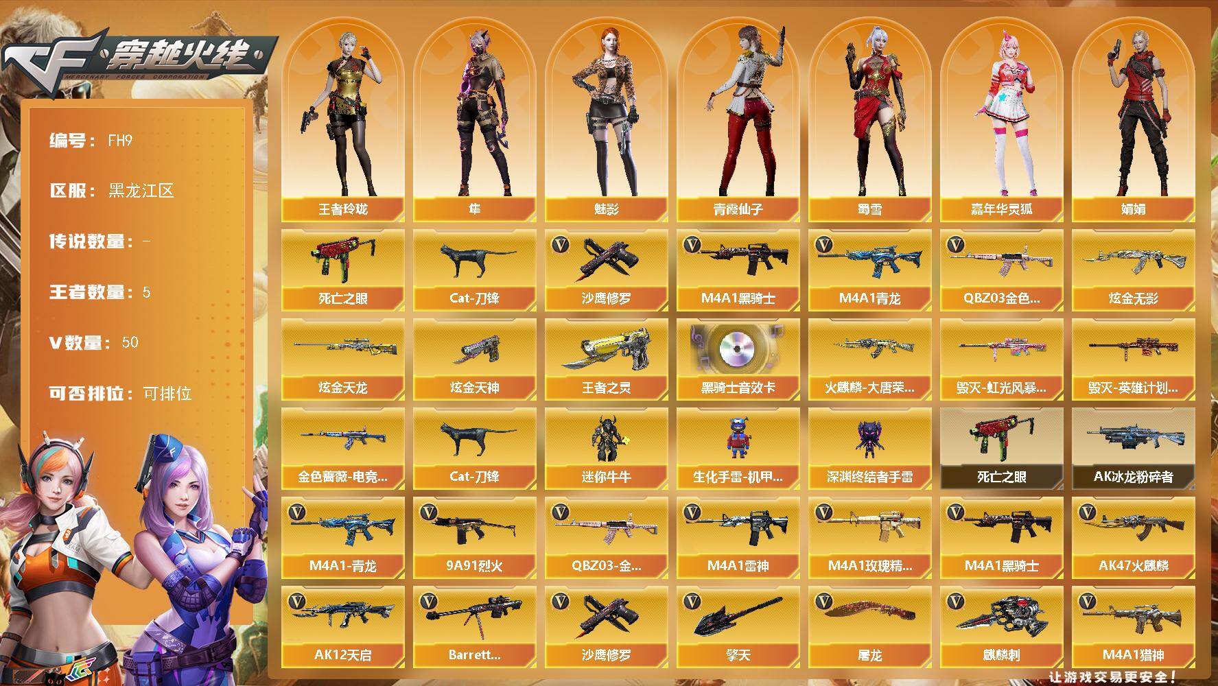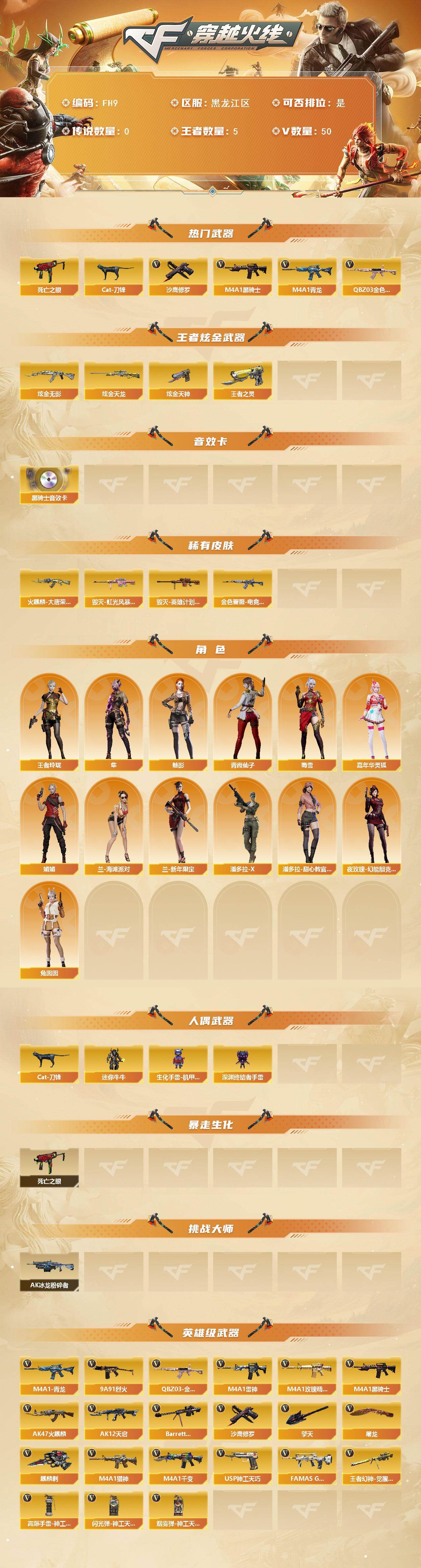 [17208582]黑龙江区-55V-5王者武器数-3炫金武器数 【热门武器】:QBZ03-金色蔷薇,M4A1-青龙,死亡之眼,Cat-刀锋,M4A1-黑骑士,沙鹰-修罗 【王者炫金武器】:王者之灵,炫金无影,炫金天龙,炫金天神 【音效卡】:M4A1-黑骑士音效卡 【皮肤】:金色蔷薇-电竞之星 皮肤,火麒麟-大唐荣光,毁灭-虹光风暴 皮肤,毁灭-英雄计划 皮肤 【角色】:魅影,隼,王者玲珑,嘉年华灵狐,娟娟,兰-海滩派对,兰-新年限定,潘多拉-X,潘多拉-甜心教官,青霞仙子,蜀雪,兔囡囡,夜玫瑰-幻能朋克 【人偶武器】:Cat-刀锋,迷你牛牛,生化手雷-机甲核心,深渊终结者手雷 【暴走生化】:死亡之眼 【挑战大师】:AK47-冰龙粉碎者 【英雄级武器】:M4A1-千变,AK47-火麒麟,M4A1-雷神*2,M4A1-黑骑士,AK12-天启,M4A1-青龙,FAMAS G2-天戎,M4A1-玫瑰精灵,QBZ03-金色蔷薇,M4A1-猎神,9A91-烈火,Barrett-毁灭*2,王者幻神-觉醒版,沙鹰-修罗,USP-神工天巧*2,屠龙*2,擎天,麒麟刺,高爆手雷-神工天巧*5,闪光弹-神工天巧*8,烟雾弹-神工天巧*7 【道具】:冰冰企鹅背包,超级背包,绿色巨人,灵魂忍者,迷雾幽灵,生化弹匣,夺命之镰*3,防化服*2,防弹头盔*4,防弹衣*2,C4工具钳*2,手雷包*2 【特殊枪械】:1黑骑士