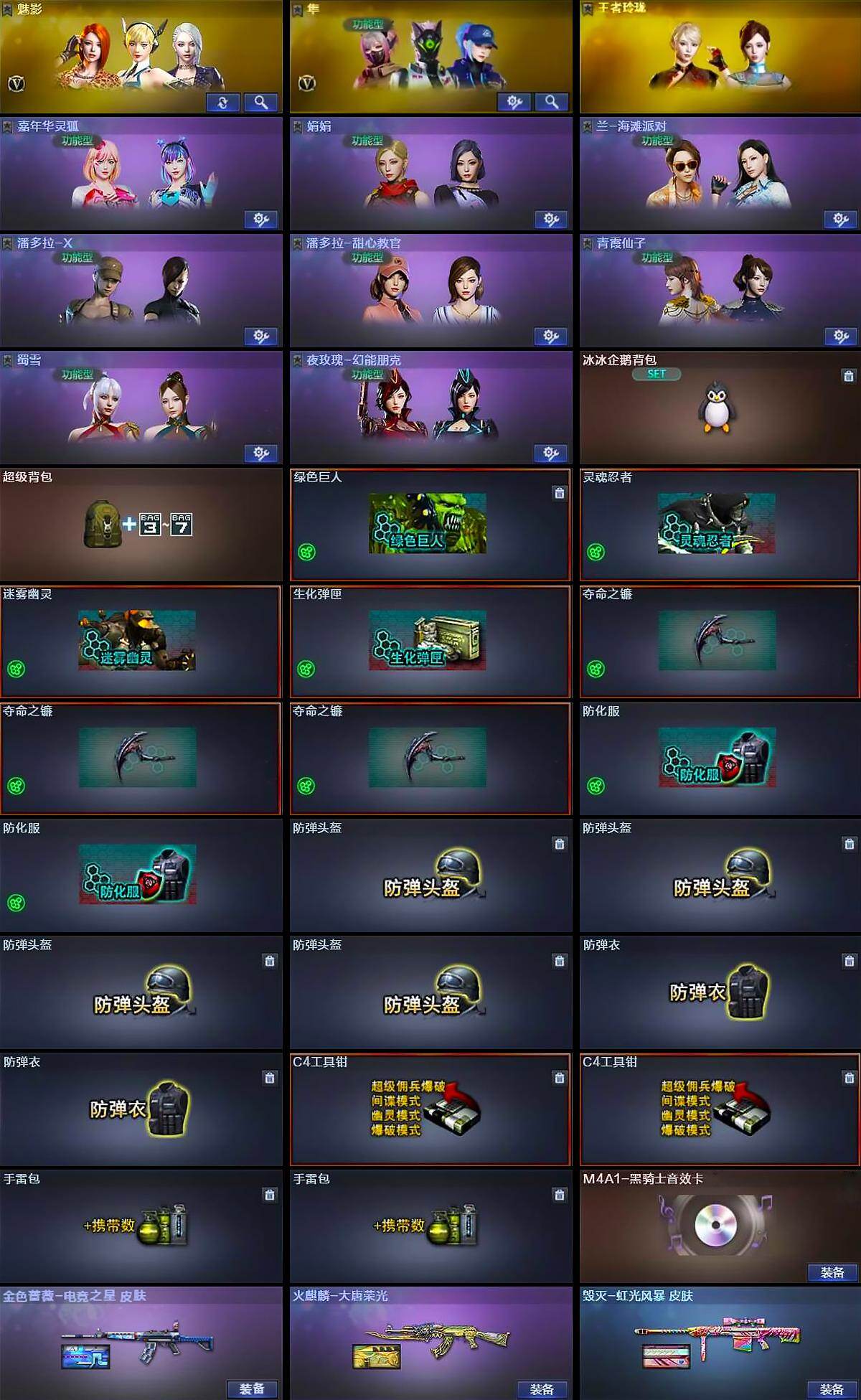【道具】:冰冰企鹅背包,超级背包,绿色巨人,灵魂忍者,迷雾幽灵,生化弹匣,夺命之镰*3,防化服*2,防弹头盔*4,防弹衣*2,C4工具钳*2,手雷包*2