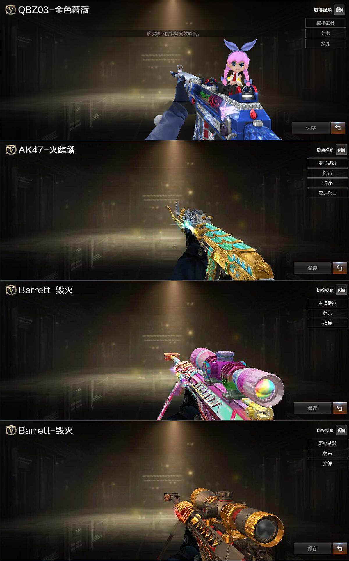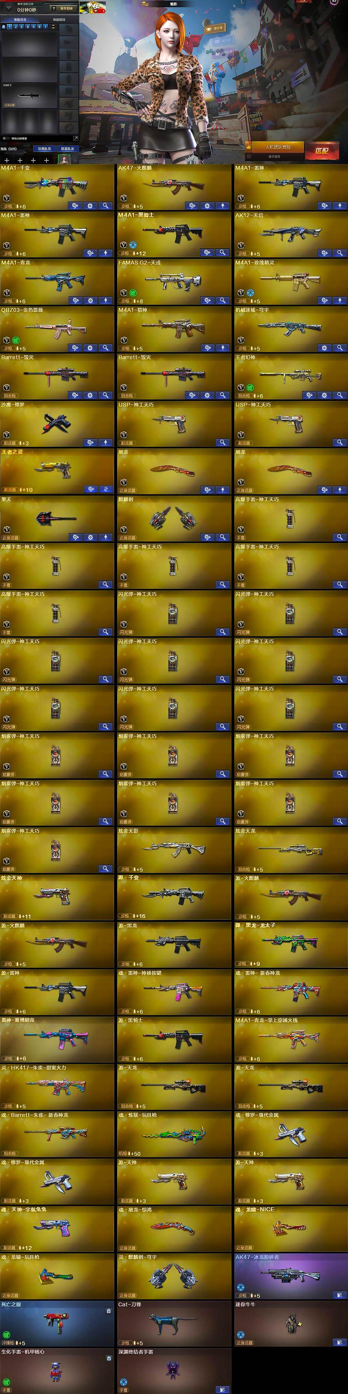 【英雄级武器】:M4A1-千变,AK47-火麒麟,M4A1-雷神*2,M4A1-黑骑士,AK12-天启,M4A1-青龙,FAMAS G2-天戎,M4A1-玫瑰精灵,QBZ03-金色蔷薇,M4A1-猎神,9A91-烈火,Barrett-毁灭*2,王者幻神-觉醒版,沙鹰-修罗,USP-神工天巧*2,屠龙*2,擎天,麒麟刺,高爆手雷-神工天巧*5,闪光弹-神工天巧*8,烟雾弹-神工天巧*7
