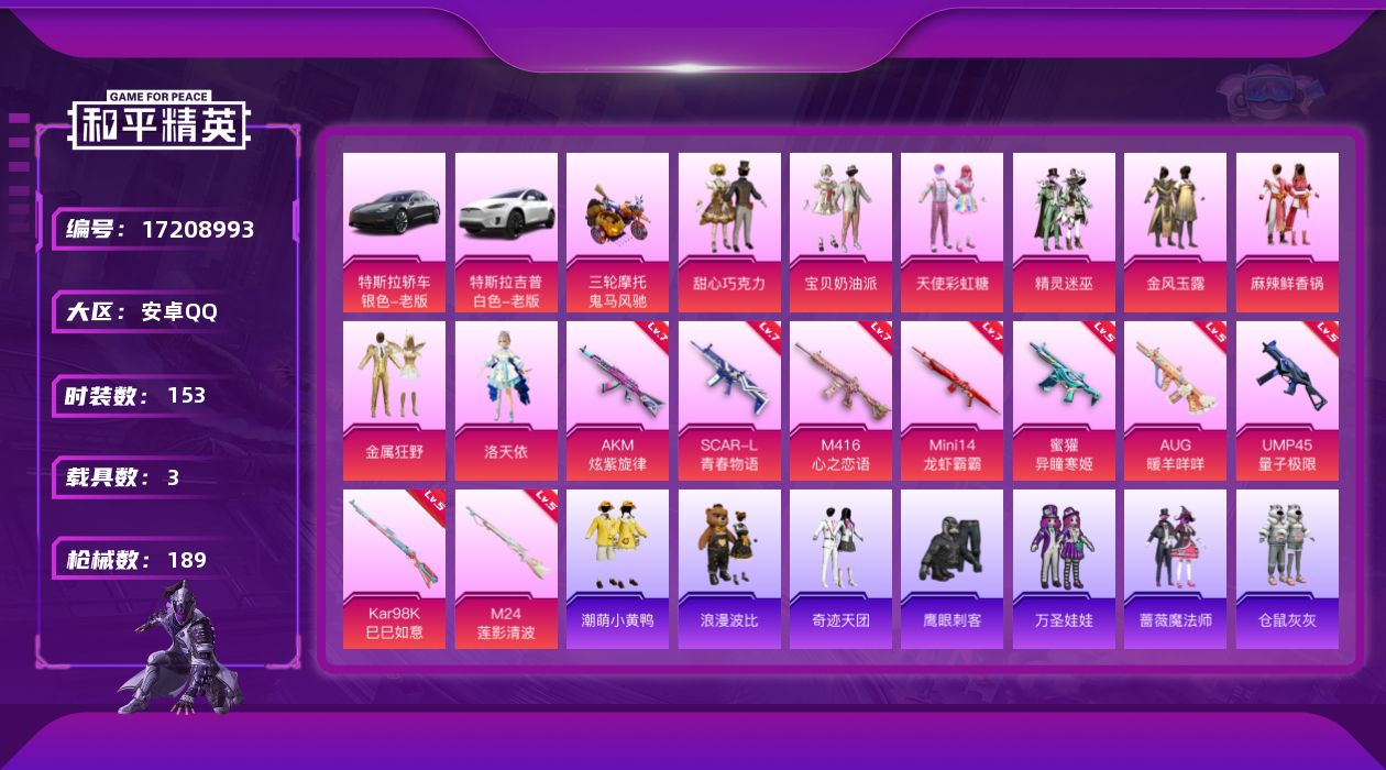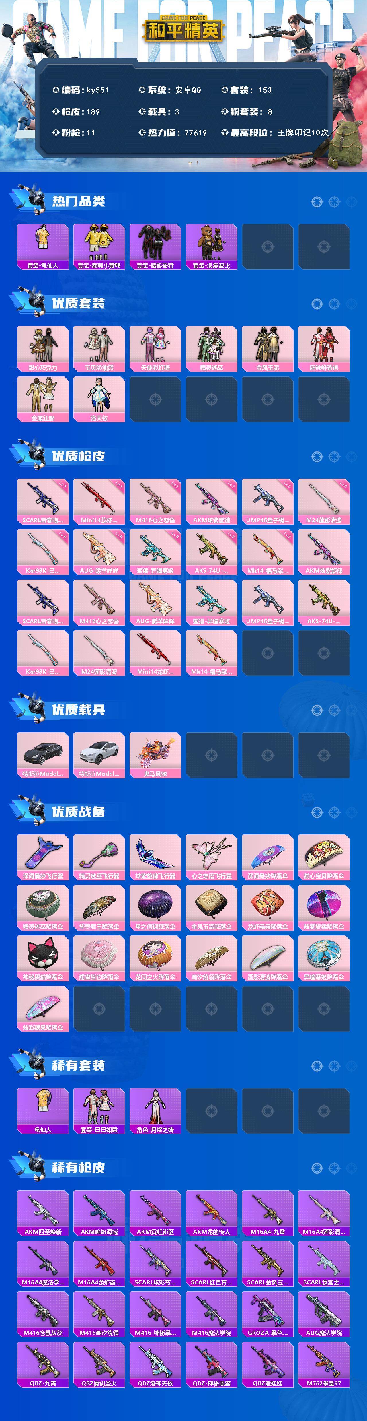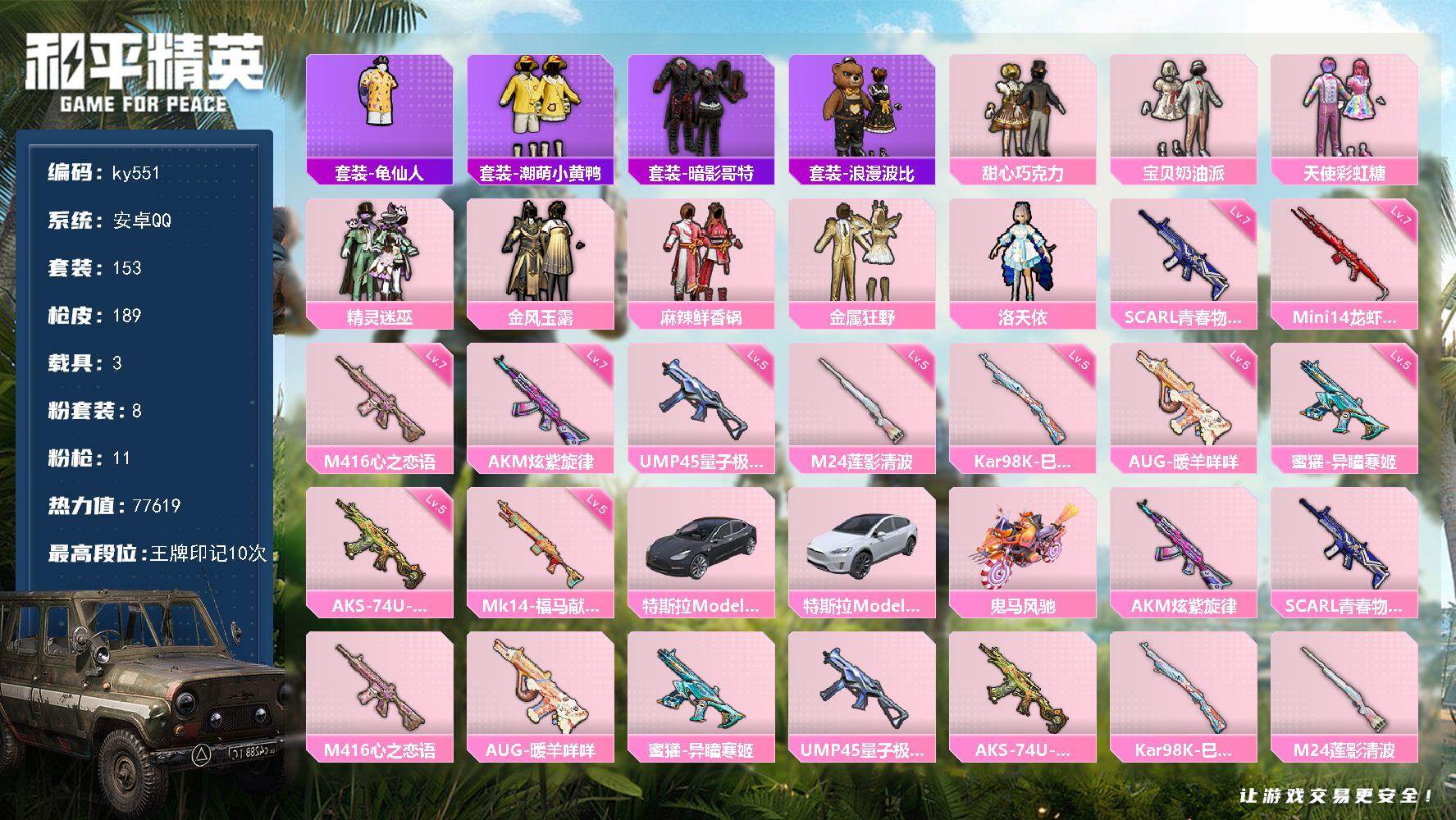 [17208993]安卓 手Q-8粉装-11特效枪-3载具-4粉色飞行器-77619热力值-10王牌印记-153套装-189枪皮 【热门品类】:套装-龟仙人,套装-潮萌小黄鸭,套装-暗影哥特,套装-浪漫波比 【粉色套装】:粉装-甜心巧克力,粉装-宝贝奶油派,粉装-天使彩虹糖,粉装-精灵迷巫,粉装-金风玉露,粉装-麻辣鲜香锅,粉装-金属狂野,角色-洛天依 【粉色枪皮等级】:AKM-炫紫旋律(七级),SCAR-L-青春物语(七级),M416-心之恋语(七级),AUG-暖羊咩咩(五级),蜜獾-异瞳寒姬(五级),UMP45-量子极限(五级),AKS-74U-森灵之息(五级),Kar98K-巳巳如意(五级),M24-莲影清波(五级),Mini14-龙虾霸霸(七级),Mk14-福马献瑞(五级) 【粉色载具】:特斯拉Model 3(冷光银),特斯拉Model X(珍珠白),鬼马风驰 【粉色枪皮】:AKM-炫紫旋律,SCAR-L-青春物语,M416-心之恋语,AUG-暖羊咩咩,蜜獾-异瞳寒姬,UMP45-量子极限,AKS-74U-森灵之息,Kar98K-巳巳如意,M24-莲影清波,Mini14-龙虾霸霸,Mk14-福马献瑞 【粉色飞行器】:深海曼妙飞行器,精灵迷巫飞行器,炫紫旋律飞行器,心之恋语飞行翼 【粉色降落伞】:深海曼妙降落伞,甜心宝贝降落伞,精灵迷巫降落伞,华贵君王降落伞,星之信仰降落伞,金风玉露降落伞,龙虾霸霸降落伞,炫紫旋律降落伞,神秘黑猫降落伞,甜蜜誓约降落伞,花间之火降落伞,潮汐统领降落伞,莲影清波降落伞,异瞳寒姬降落伞,炫彩糖果降落伞 【稀有套装】:套装-龟仙人,套装-巳巳如意,套装-雪国风尚,角色-月烬之祷 【稀有枪皮】:AKM-四圣焕新,AKM-缤纷海域,AKM-霓虹街区,AKM-龙的传人,M16A4-九霄,M16A4-莲影清波,M16A4-魔法学院,M16A4-龙虾霸霸,SCAR-L-炫彩节奏,SCAR-L-红色方程式,SCAR-L-金风玉露,SCAR-L-龙宫之主,M416-仓鼠灰灰,M416-潮汐统领,M416-神秘黑猫,M416-魔法学院,GROZA-黑色刀锋,AUG-魔法学院,QBZ-九霄,QBZ-原初圣火,QBZ-洛神天依,QBZ-神秘黑猫,QBZ-诡娃娃,M762-拳皇97,M762-深海曼妙,M762-潮萌小黄鸭,M762-牛气冲天,M762-瑞龙福将,M762