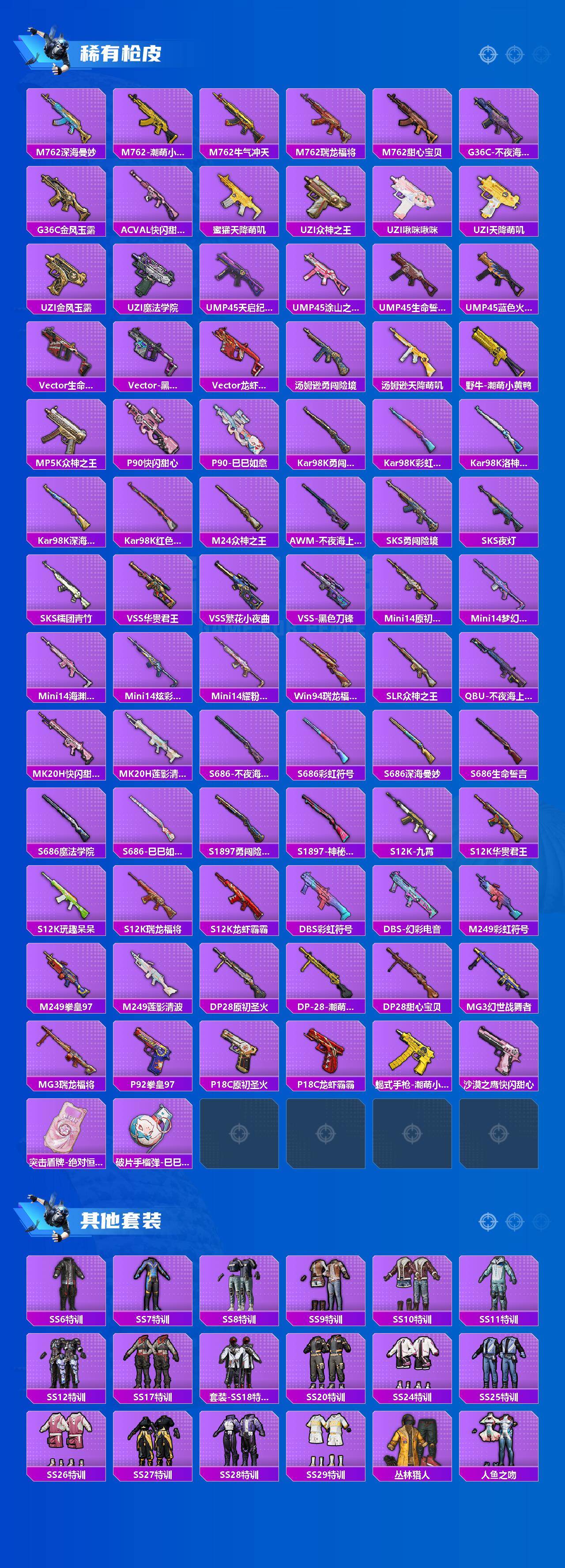 【稀有枪皮】:AKM-四圣焕新,AKM-缤纷海域,AKM-霓虹街区,AKM-龙的传人,M16A4-九霄,M16A4-莲影清波,M16A4-魔法学院,M16A4-龙虾霸霸,SCAR-L-炫彩节奏,SCAR-L-红色方程式,SCAR-L-金风玉露,SCAR-L-龙宫之主,M416-仓鼠灰灰,M416-潮汐统领,M416-神秘黑猫,M416-魔法学院,GROZA-黑色刀锋,AUG-魔法学院,QBZ-九霄,QBZ-原初圣火,QBZ-洛神天依,QBZ-神秘黑猫,QBZ-诡娃娃,M762-拳皇97,M762-深海曼妙,M762-潮萌小黄鸭,M762-牛气冲天,M762-瑞龙福将,M762