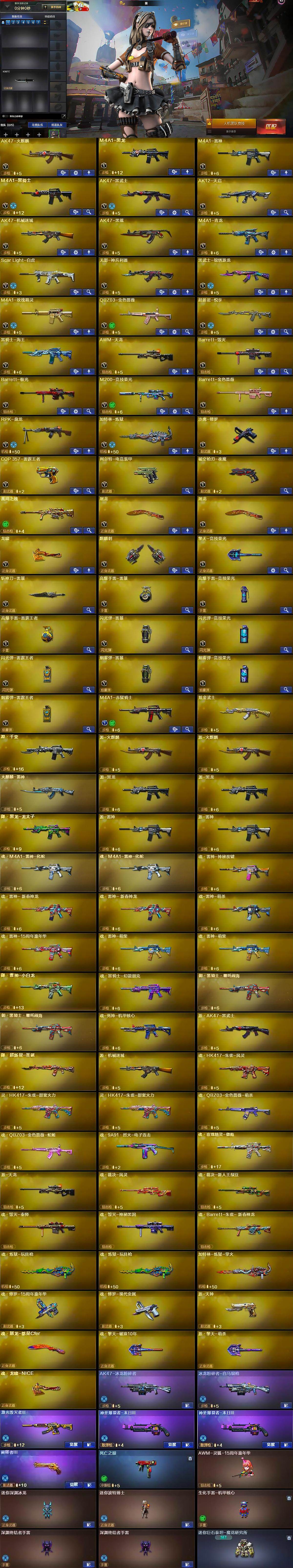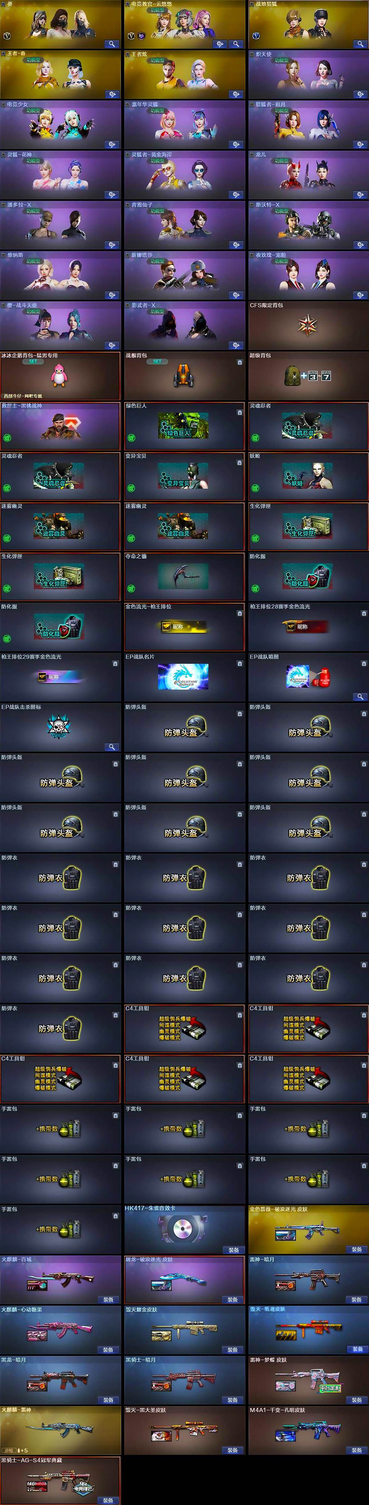 【英雄级武器】:AK47-火麒麟,M4A1-黑龙,M4A1-雷神,M4A1-黑骑士,AK47-黑武士,AK12-天启,AK47-机械迷城,AK47-黑鲨,M4A1-青龙,Scar Light-白虎,无影-神兵利器,黑武士-锦绣游龙,M4A1-玫瑰精灵,QBZ03-金色蔷薇,9A91-烈火,超新星-悦享-觉醒版,黑骑士-海王,AWM-天龙,Barrett-毁灭,Barrett-极光,M200-竞技荣光,Barrett-金色蔷薇,RPK-盘龙,加特林-炼狱,沙鹰-修罗,COP 357-雷霆王者-觉醒版,柯尔特-电竞装甲,破空枪刃-夜魔,屠龙*2,龙啸,麒麟刺,擎天-竞技荣光,斩神刀-雷暴,高爆手雷-雷暴,高爆手雷-竞技荣光,高爆手雷-雷霆王者-觉醒版,闪光弹-雷暴,闪光弹-竞技荣光,闪光弹-雷霆王者-觉醒版,烟雾弹-雷暴,烟雾弹-竞技荣光,烟雾弹-雷霆王者-觉醒版,M4A1-赤狱骑士