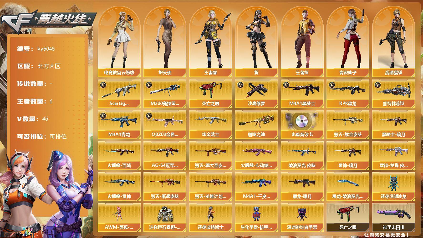 [17208981]北方大区-49V-6王者武器数-1炫金武器数 【热门武器】:QBZ03-金色蔷薇,Scar Light-白虎,M4A1-青龙,M200-竞技荣光,死亡之眼,M4A1-黑骑士,RPK-盘龙,加特林-炼狱,沙鹰-修罗 【王者炫金武器】:凰鸣之魄,炫金武士 【音效卡】:HK417-朱雀音效卡 【皮肤】:金色蔷薇-破浪逐光 皮肤,雷神-暗月,雷神-梦蝶 皮肤,火麒麟-雷神,火麒麟-百城,火麒麟-心动糖果,毁灭耀金皮肤,毁灭-黑大圣皮肤,毁灭-纸鸢皮肤,毁灭-英雄计划 皮肤,M4A1-千变-孔明皮肤,黑龙-暗月,黑骑士-暗月,黑骑士-AG-S4冠军典藏,屠龙-破浪逐光 皮肤 【角色】:葵,电竞教官-云悠悠,战地猎狐,王者春,王者炫,炽天使,电竞少女,嘉年华灵狐,兰-新年限定,猎狐者-追月,0号玩家,灵狐-花神,灵狐者-黄金海岸,龙儿,潘多拉-X,青霞仙子,斯沃特-X,兔囡囡,维纳斯,新娜塔莎,夜玫瑰-宠粉,樱-战斗天使,影武者-X 【人偶武器】:AWM-灵狐-15周年嘉年华,迷你深渊冰龙,迷你波特博士,生化手雷-机甲核心,深渊终结者手雷*2,迷你巨石泰坦-魔花研究所 【暴走生化】:死亡之眼 【挑战大师】:AK47-冰龙粉碎者,冰龙粉碎者-白马银枪,激光毁灭者III,神圣爆裂者-末日III*2,阐释者III 【英雄级武器】:AK47-火麒麟,M4A1-黑龙,M4A1-雷神,M4A1-黑骑士,AK47-黑武士,AK12-天启,AK47-机械迷城,AK47-黑鲨,M4A1-青龙,Scar Light-白虎,无影-神兵利器,黑武士-锦绣游龙,M4A1-玫瑰精灵,QBZ03-金色蔷薇,9A91-烈火,超新星-悦享-觉醒版,黑骑士-海王,AWM-天龙,Barrett-毁灭,Barrett-极光,M200-竞技荣光,Barrett-金色蔷薇,RPK-盘龙,加特林-炼狱,沙鹰-修罗,COP 357-雷霆王者-觉醒版,柯尔特-电竞装甲,破空枪刃-夜魔,屠龙*2,龙啸,麒麟刺,擎天-竞技荣光,斩神刀-雷暴,高爆手雷-雷暴,高爆手雷-竞技荣光,高爆手雷-雷霆王者-觉醒版,闪光弹-雷暴,闪光弹-竞技荣光,闪光弹-雷霆王者-觉醒版,烟雾弹-雷暴,烟雾弹-竞技荣光,烟雾弹-雷霆王者-觉醒版,M4A1-赤狱骑士 【道具】:CFS限定背包,冰冰企鹅背包-猛男专用,战舰背包,超级背包,救世主-黑桃战神,绿色