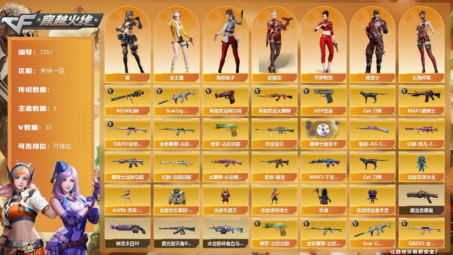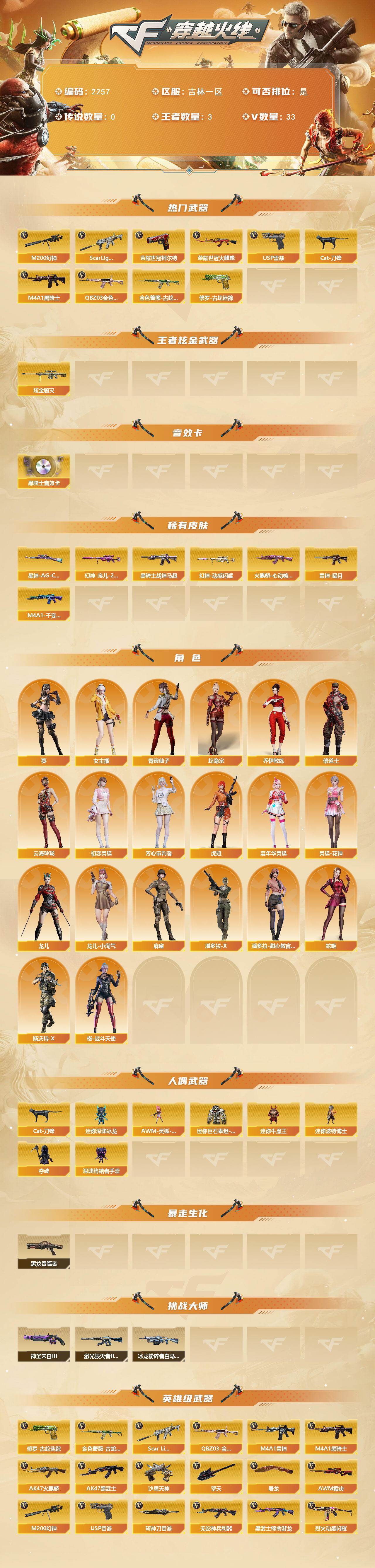[17209746]吉林一区-36V-3王者武器数-1炫金武器数 【热门武器】:QBZ03-金色蔷薇,Scar Light-白虎,M200-幻神,金色蔷薇-古蛇迷踪,修罗-古蛇迷踪,荣耀世冠-火麒麟,荣耀世冠-柯尔特,Cat-刀锋,M4A1-黑骑士,USP-雷暴 【王者炫金武器】:炫金毁灭 【音效卡】:M4A1-黑骑士音效卡 【皮肤】:幻神-宠儿-2021MVP,幻神-动感闪耀 皮肤,Kar98K-星神-AG-CFPLS21冠军皮肤,雷神-暗月,火麒麟-心动糖果,M4A1-千变-孔明皮肤,黑骑士-战神马超 【角色】:葵,蛇隐宗,乔伊教练,修道士,云海玲珑,初恋灵狐,芳心审判者,虎妞,嘉年华灵狐,灵狐-花神,龙儿,龙儿-小淘气,麻雀,女主播,潘多拉-X,潘多拉-甜心教官,青霞仙子,蛇姬,斯沃特-X,樱-战斗天使 【人偶武器】:AWM-灵狐-15周年嘉年华,Cat-刀锋,迷你深渊冰龙,迷你牛魔王,迷你波特博士,夺魂*2,深渊终结者手雷,迷你巨石泰坦-魔花研究所 【暴走生化】:黑龙吞噬者 【挑战大师】:冰龙粉碎者-白马银枪,激光毁灭者III-白马银枪,神圣爆裂者-末日III 【英雄级武器】:AK47-火麒麟*2,M4A1-雷神,M4A1-黑骑士,AK47-黑武士,Scar Light-白虎,无影-神兵利器,黑武士-锦绣游龙,金色蔷薇-古蛇迷踪,QBZ03-金色蔷薇,烈火-动感闪耀,黑骑士-海王,王者之烈-觉醒版,荣耀世冠-火麒麟,AWM-裁决,M200-幻神,沙鹰-天神,USP-雷暴,荣耀世冠-柯尔特,天神-动感闪耀,修罗-古蛇迷踪,屠龙,擎天,屠龙-动感闪耀,斩神刀-雷暴,手雷-动感闪耀,高爆手雷-古蛇迷踪,闪光弹-雷霆王者-觉醒版,烟雾弹-古蛇迷踪,烟雾弹-雷霆王者-觉醒版 【道具】:AG战队炫彩背包,BS战队炫彩背包,全能枪王背包,古蛇迷踪炫彩背包,炫彩背包,超级背包,哔哩哔哩名片,女皇终结者-魔龙之吻,绿色巨人,灵魂忍者,迷雾幽灵,夺命之镰,防化服*3,金色流光-枪王排位*2,星辰流光-枪王排位,巅峰赛先锋-金色流光,流光-鎏金之域,枪王排位28赛季金色流光,枪王排位29赛季金色流光,古蛇迷踪打击特效,蛇隐宗表情,电玩兔兔表情*2,动感闪耀表情,EP战队名片,防弹头盔*4,防弹衣*4,C4工具钳*5,手雷包*5 【特殊枪械】:1白虎,1黑骑士
