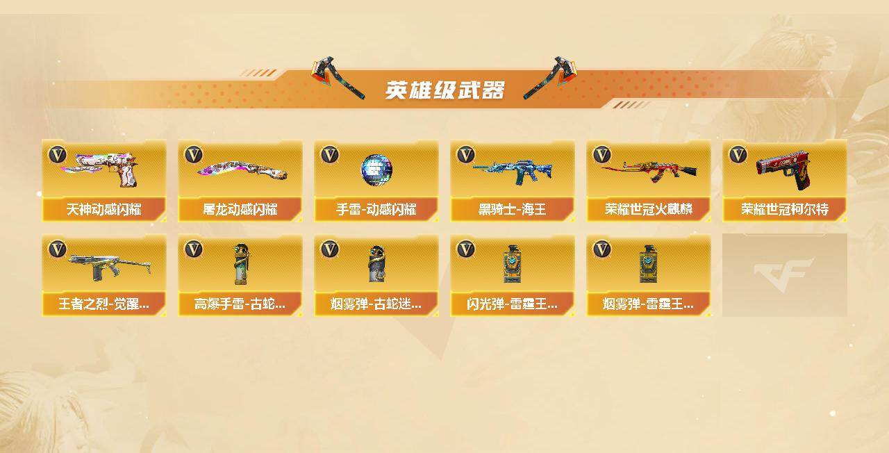 【英雄级武器】:AK47-火麒麟*2,M4A1-雷神,M4A1-黑骑士,AK47-黑武士,Scar Light-白虎,无影-神兵利器,黑武士-锦绣游龙,金色蔷薇-古蛇迷踪,QBZ03-金色蔷薇,烈火-动感闪耀,黑骑士-海王,王者之烈-觉醒版,荣耀世冠-火麒麟,AWM-裁决,M200-幻神,沙鹰-天神,USP-雷暴,荣耀世冠-柯尔特,天神-动感闪耀,修罗-古蛇迷踪,屠龙,擎天,屠龙-动感闪耀,斩神刀-雷暴,手雷-动感闪耀,高爆手雷-古蛇迷踪,闪光弹-雷霆王者-觉醒版,烟雾弹-古蛇迷踪,烟雾弹-雷霆王者-觉醒版
