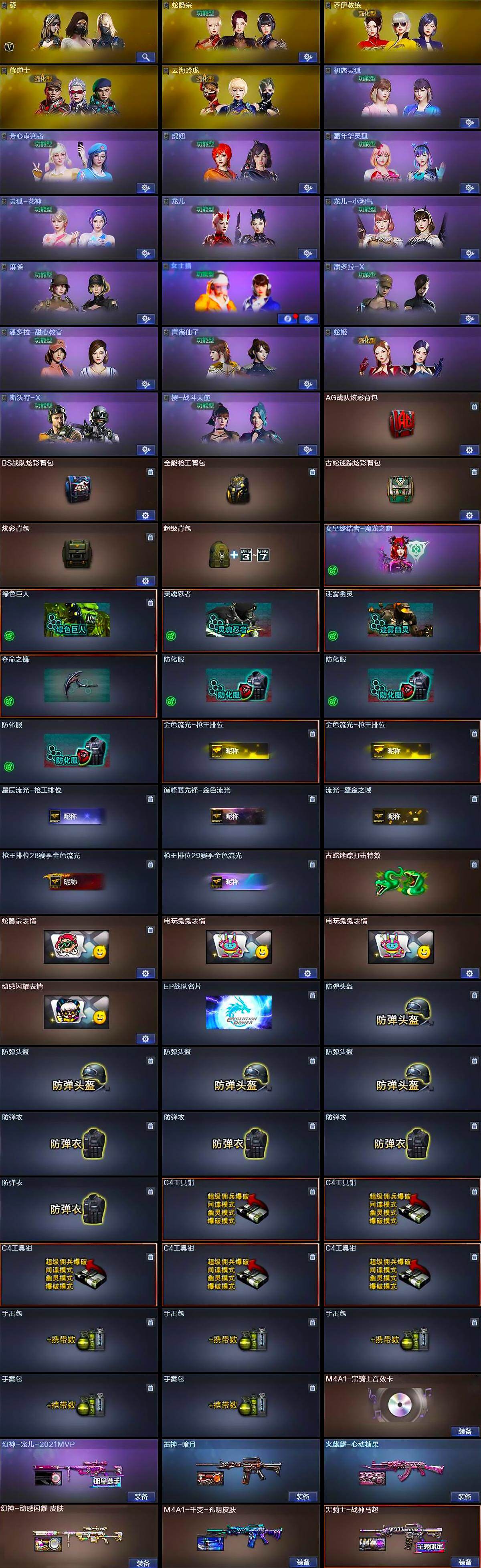 【道具】:AG战队炫彩背包,BS战队炫彩背包,全能枪王背包,古蛇迷踪炫彩背包,炫彩背包,超级背包,哔哩哔哩名片,女皇终结者-魔龙之吻,绿色巨人,灵魂忍者,迷雾幽灵,夺命之镰,防化服*3,金色流光-枪王排位*2,星辰流光-枪王排位,巅峰赛先锋-金色流光,流光-鎏金之域,枪王排位28赛季金色流光,枪王排位29赛季金色流光,古蛇迷踪打击特效,蛇隐宗表情,电玩兔兔表情*2,动感闪耀表情,EP战队名片,防弹头盔*4,防弹衣*4,C4工具钳*5,手雷包*5