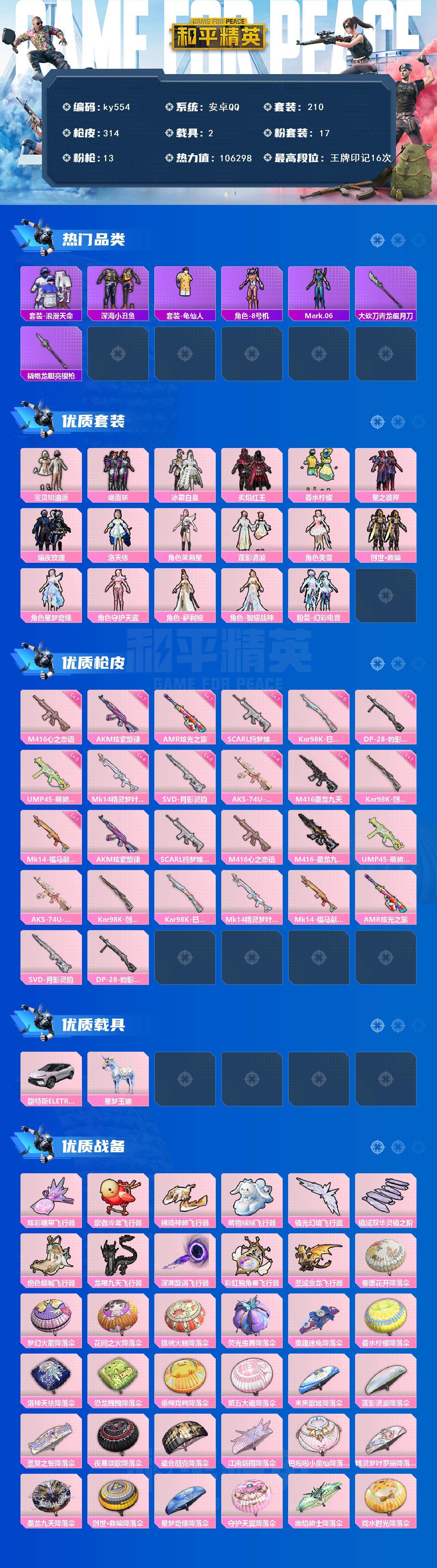 [17210051]安卓 手Q-17粉装-13特效枪-2载具-12粉色飞行器-106298热力值-16王牌印记-210套装-314枪皮 【热门品类】:套装-浪漫天命,套装-深海小丑鱼,套装-龟仙人,角色-8号机,角色-Mark.06,大砍刀-青龙偃月刀,撬棍-龙胆亮银枪 【粉色套装】:粉装-宝贝奶油派,粉装-诡面斩,粉装-冰霜白皇,粉装-炙焰红王,粉装-香水柠檬,粉装-星之彼岸,粉装-暗夜玫瑰,角色-洛天依,角色-茉莉星,粉装-莲影清波,角色-美雪,套装-创世·救赎,角色-星梦奇缘,角色-守护天翼,角色-萨利娅,角色-智耀战神,粉装-幻彩电音 【粉色枪皮等级】:AKM-炫紫旋律(七级),SCAR-L-纯梦嫁纱(七级),M416-心之恋语(七级),M416-墨龙九天(三级),UMP45-萌骑冒险(五级),AKS-74U-星穹咏叹调(四级),Kar98K-创世·救赎(一级),Kar98K-巳巳如意(五级),Mk14-精灵梦叶罗丽(四级),Mk14-福马献瑞(一级),AMR-炫光之旅(七级),SVD-月影灵韵(四级),DP-28-豹影疾电(五级) 【粉色载具】:路特斯ELETRE(花绽灰),星梦玉骢 【粉色枪皮】:AKM-炫紫旋律,SCAR-L-纯梦嫁纱,M416-心之恋语,M416-墨龙九天,UMP45-萌骑冒险,AKS-74U-星穹咏叹调,Kar98K-创世·救赎,Kar98K-巳巳如意,Mk14-精灵梦叶罗丽,Mk14-福马献瑞,AMR-炫光之旅,SVD-月影灵韵,DP-28-豹影疾电 【粉色飞行器】:炫彩糖果飞行器,歌者泠鸢飞行器,拂晓神骑飞行器,萌物绒绒飞行器,镜光幻境飞行翼,镜域双华-灵镜之阶,绝色倾城飞行器,龙翔九天飞行器,深渊漩涡飞行器,彩虹独角兽飞行器,圣域金龙飞行器 【粉色降落伞】:春暖花开降落伞,梦幻火箭降落伞,花间之火降落伞,锦绣火鲤降落伞,荧光虫舞降落伞,童趣迷兔降落伞,香水柠檬降落伞,洛神天依降落伞,恐龙拽拽降落伞,垂柳戏鸭降落伞,第五大道降落伞,未来歌姬降落伞,莲影清波降落伞,圣堂之誓降落伞,夜幕颂歌降落伞,鎏金朋克降落伞,江南烟雨降落伞,巴啦啦小魔仙降落伞,精灵梦叶罗丽降落伞,墨龙九天降落伞,创世·救赎降落伞,星梦奇缘降落伞,守护天翼降落伞,幽焰骑士降落伞,戏水时光降落伞,百变魔方降落伞,星穹咏叹调降落伞,喜羊羊与灰太狼降落伞,极意拳锋降落伞,炫彩糖果降落伞