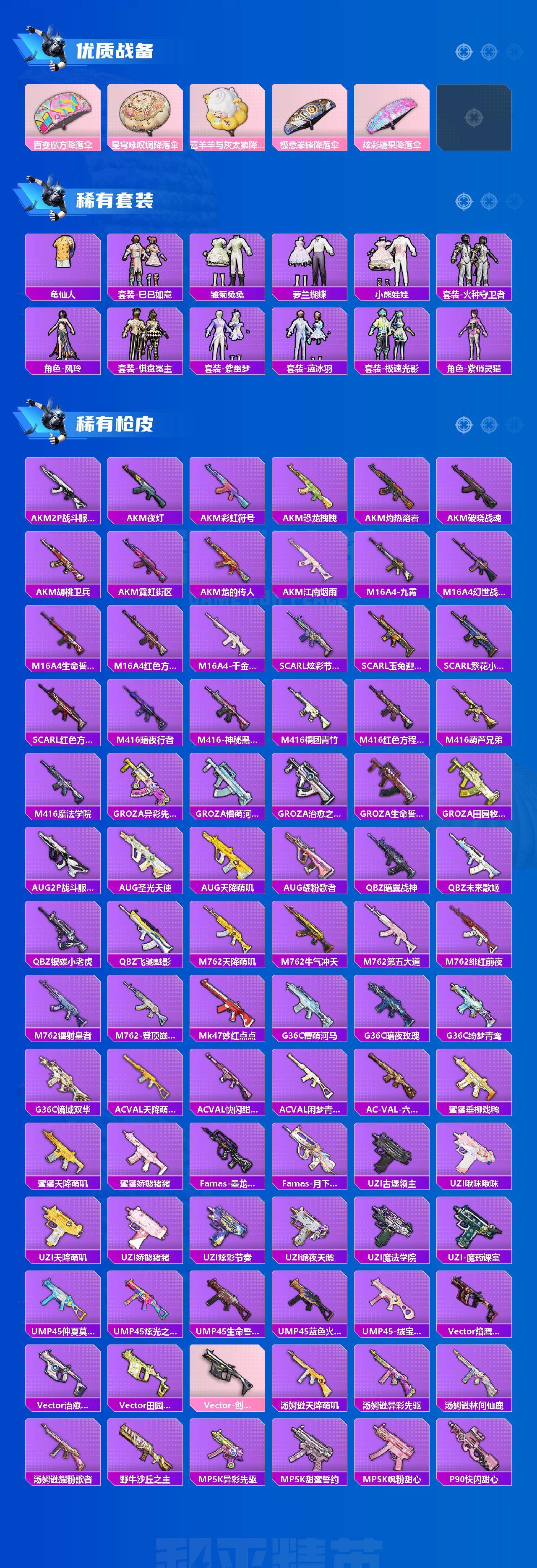【粉色枪皮】:AKM-炫紫旋律,SCAR-L-纯梦嫁纱,M416-心之恋语,M416-墨龙九天,UMP45-萌骑冒险,AKS-74U-星穹咏叹调,Kar98K-创世·救赎,Kar98K-巳巳如意,Mk14-精灵梦叶罗丽,Mk14-福马献瑞,AMR-炫光之旅,SVD-月影灵韵,DP-28-豹影疾电