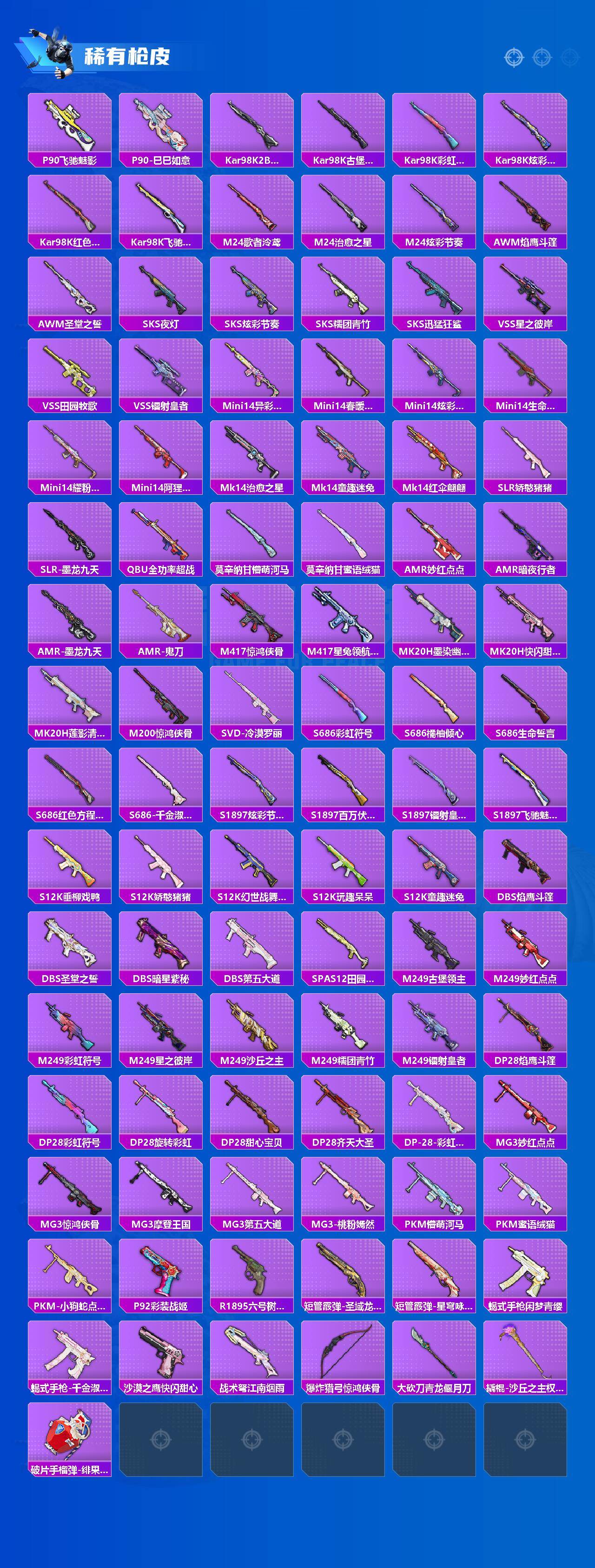 AKM-炫紫旋律,SCAR-L-纯梦嫁纱,M416-心之恋语,M416-墨龙九天,Kar98K-创世·救赎,Kar98K-巳巳如意,Mk14-精灵梦叶罗丽,AMR-炫光之旅,SVD-月影灵韵